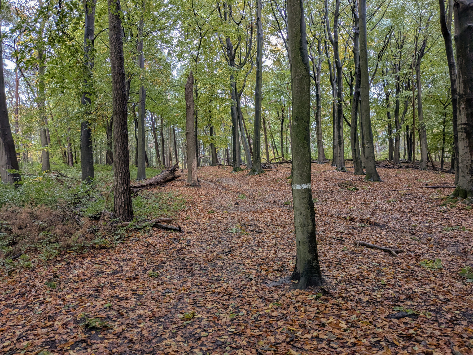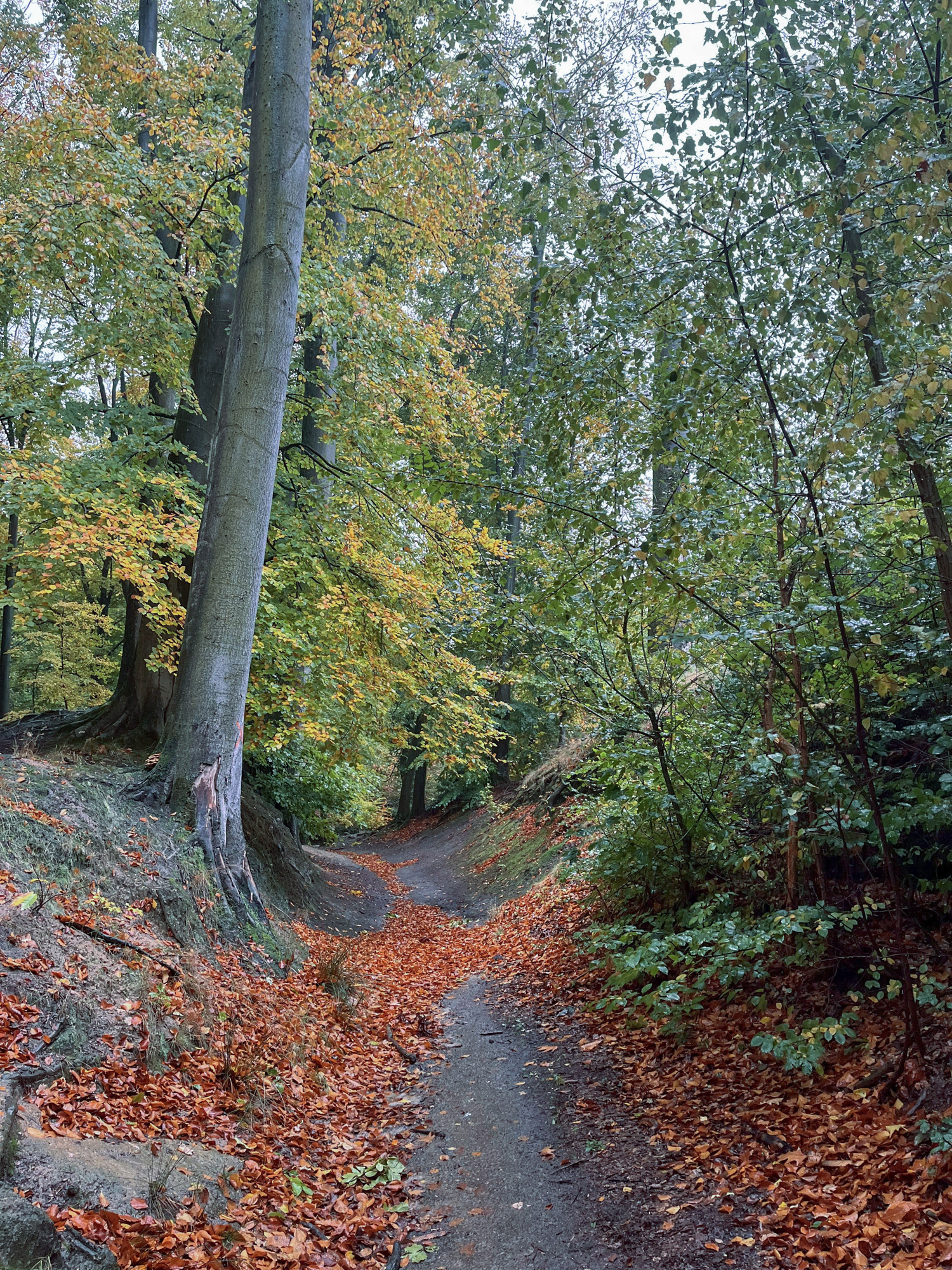 Aan de andere kant glibberen we de natte maar prachtig glooiende kleipaadjes naar beneden en komen we in het kleine dorpje Sweikhuizen. Over de weg mogen we weer linksaf, opnieuw kleine kronkelende paadjes in. De paden gaan over in een vorm die ons meer doet denken aan regenafvoerkanalen. Een soort recht aangelegde brede goten van een meter of twee. Dwars door het bos, en met boomwallen en hoger geleden zijkanten. Misschien ook wel oude paden die door de eeuwen heen zover zijn uitgesleten dat ze nu 2 meter lager liggen dan de wallen om ons heen?