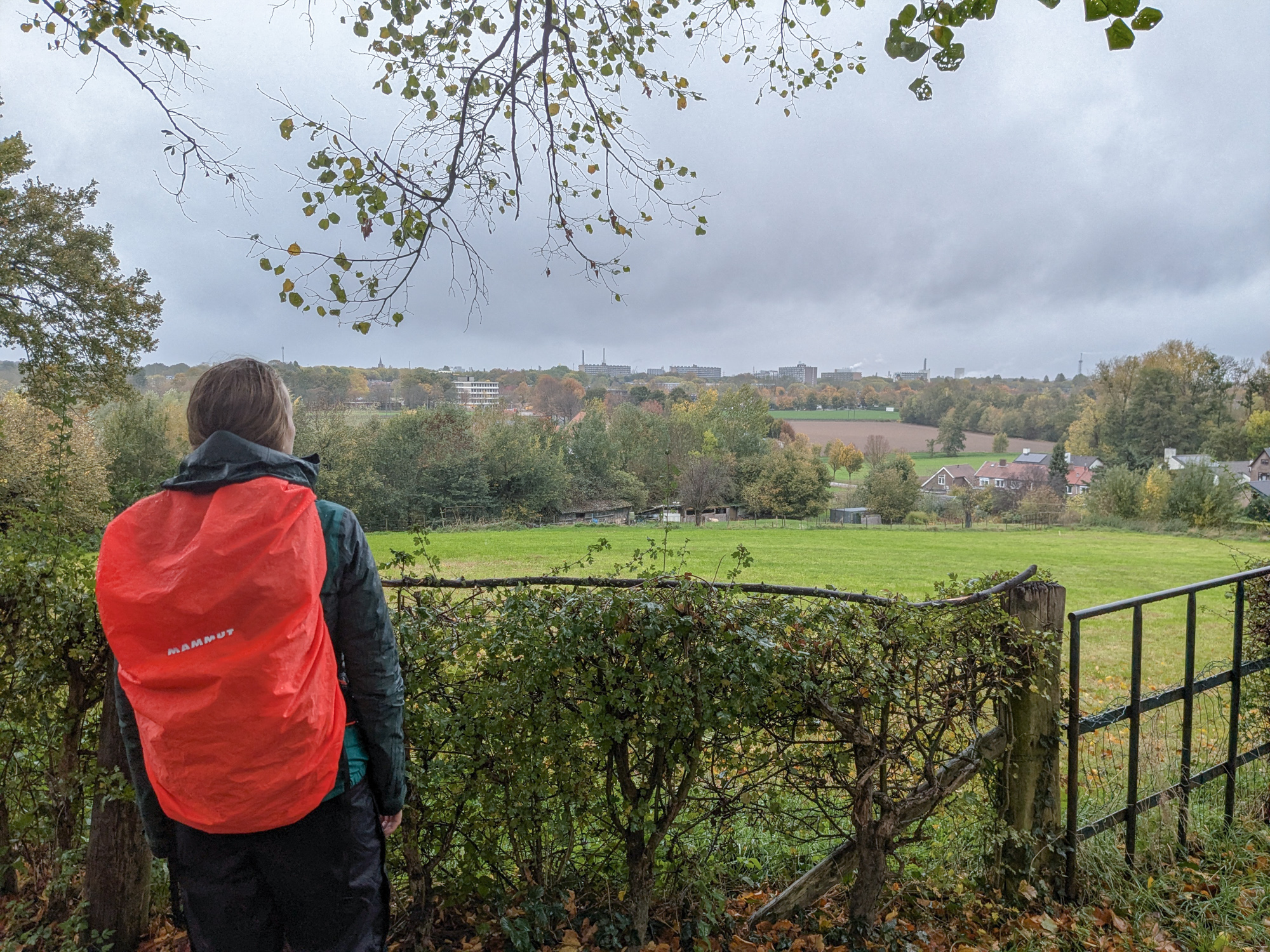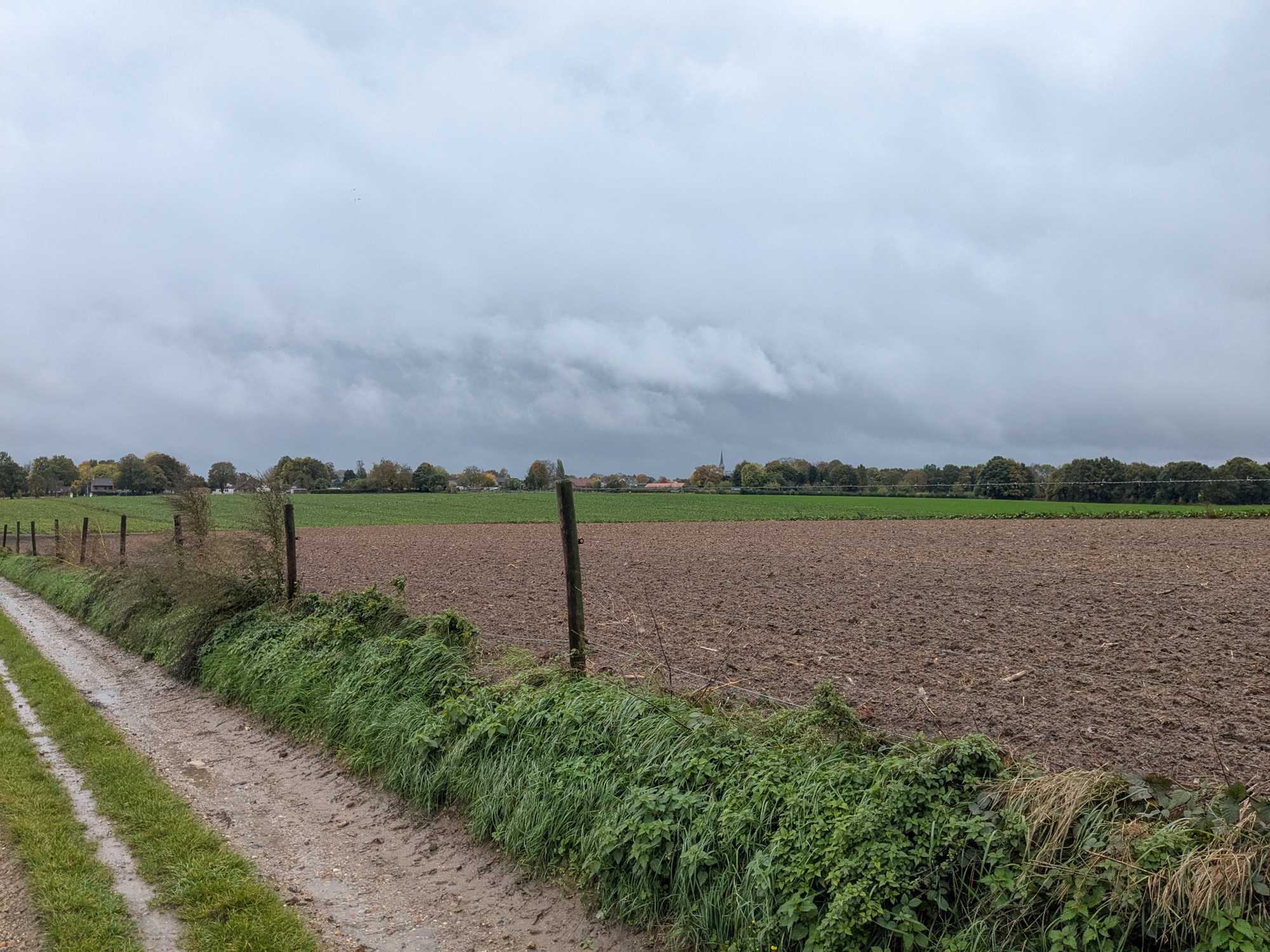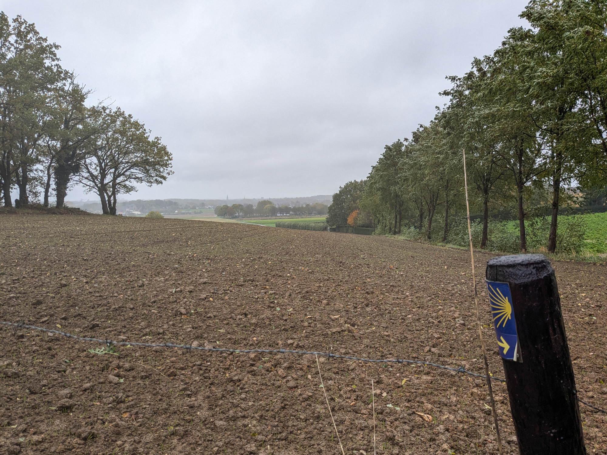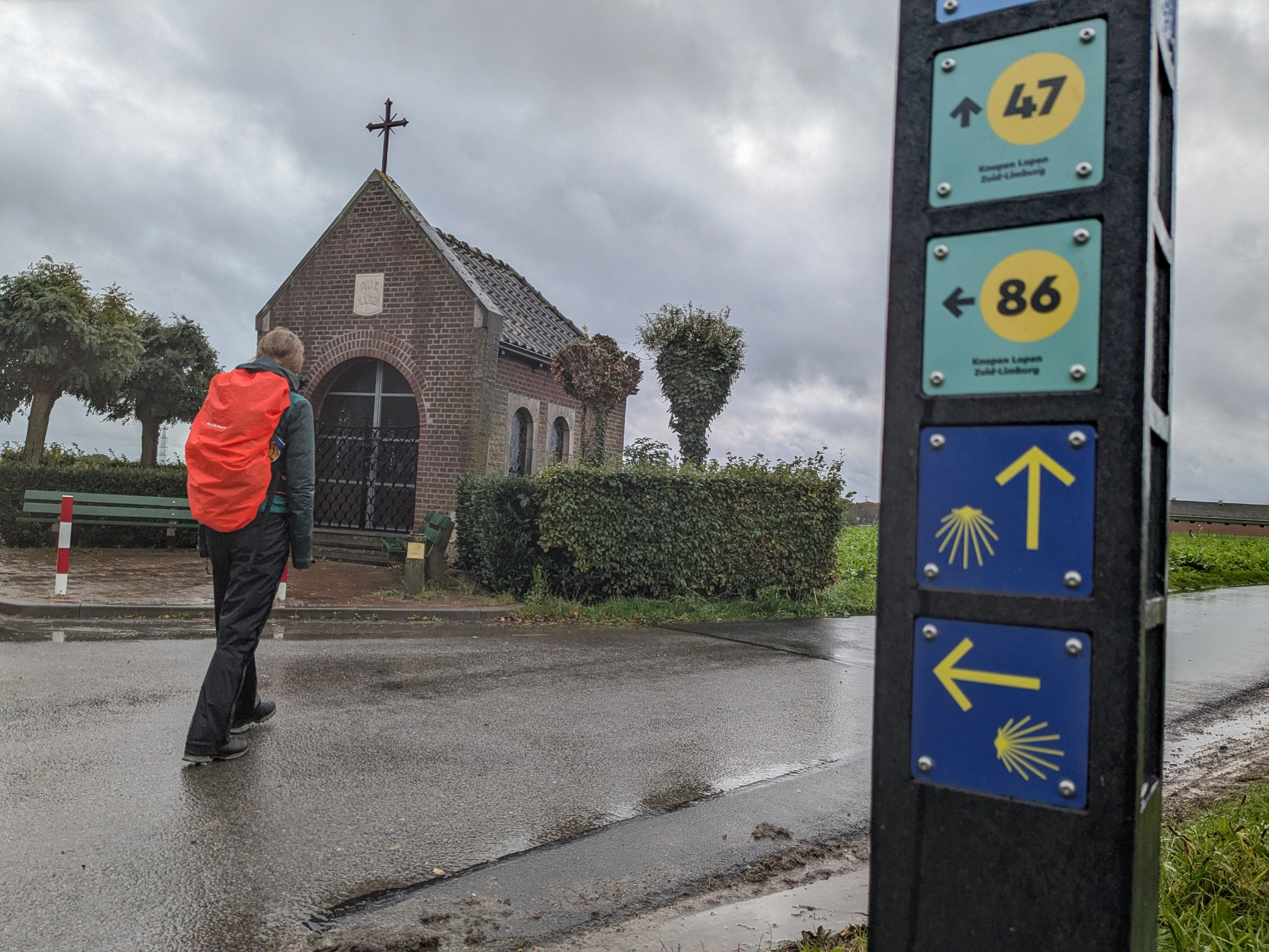 Na het kerkje voegt de route opnieuw samen met die van het Pieterpad. We lopen ten hoogte van station Spaubeek en met een oversteek van de snelweg het gelijknamige dorpje binnen. Na Spaubeek wordt het landschap iets opener. Lange rechte gravelpaden en eindeloze akkers waar tot voor kort nog mais stond. De luchten betrekken opnieuw in alle tinten grijs. De regelkleding en wandelschoenen beginnen na zo’n 4 uren in de buien er de brui aan te geven en slaan door. De eerste tekenen van nattigheid door onverwachte wat koudere tenen, of een klamme aanraking wanneer je even een broodje uit je tas haalt.