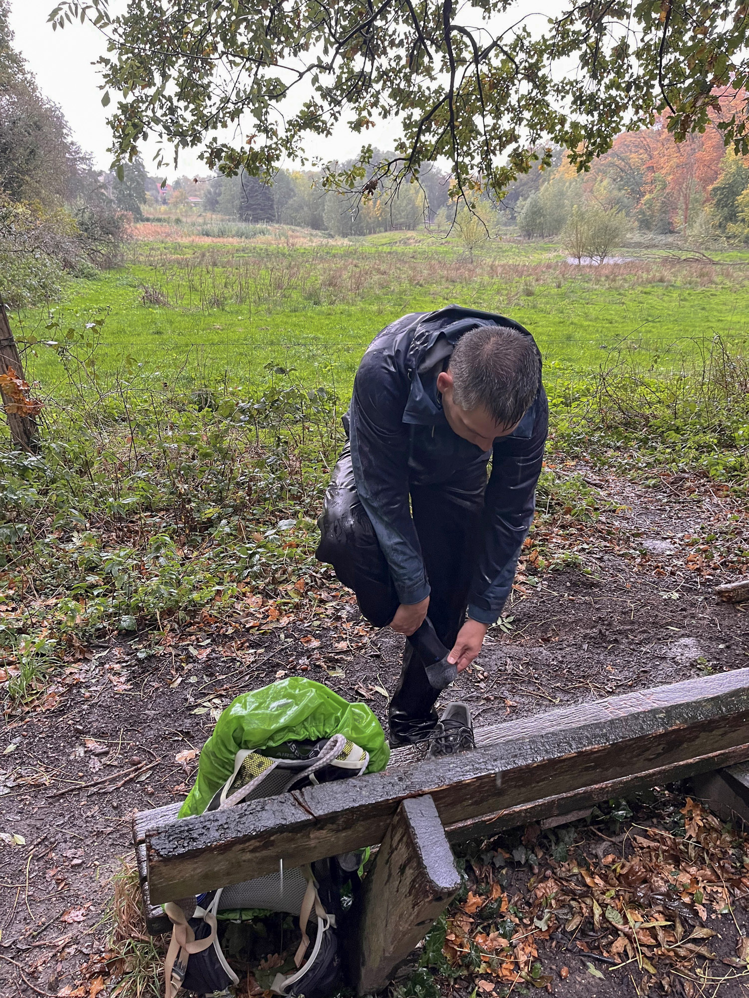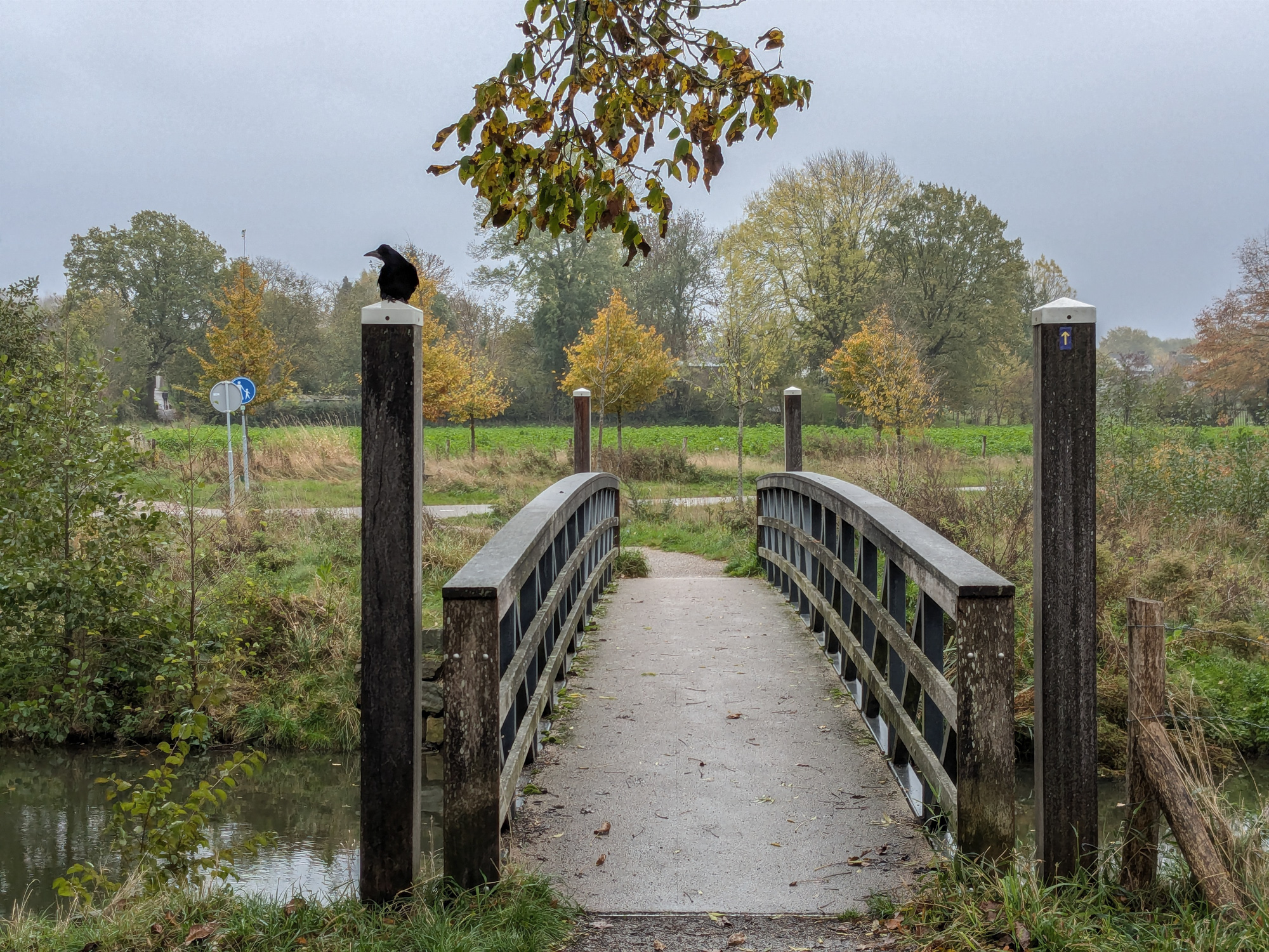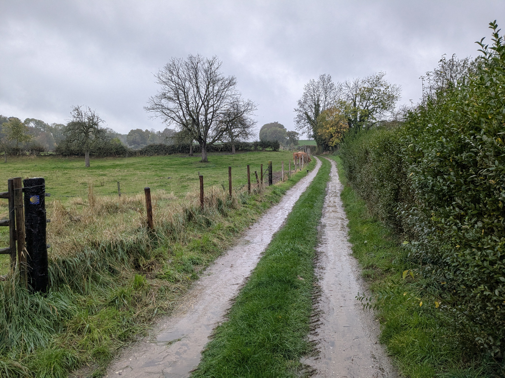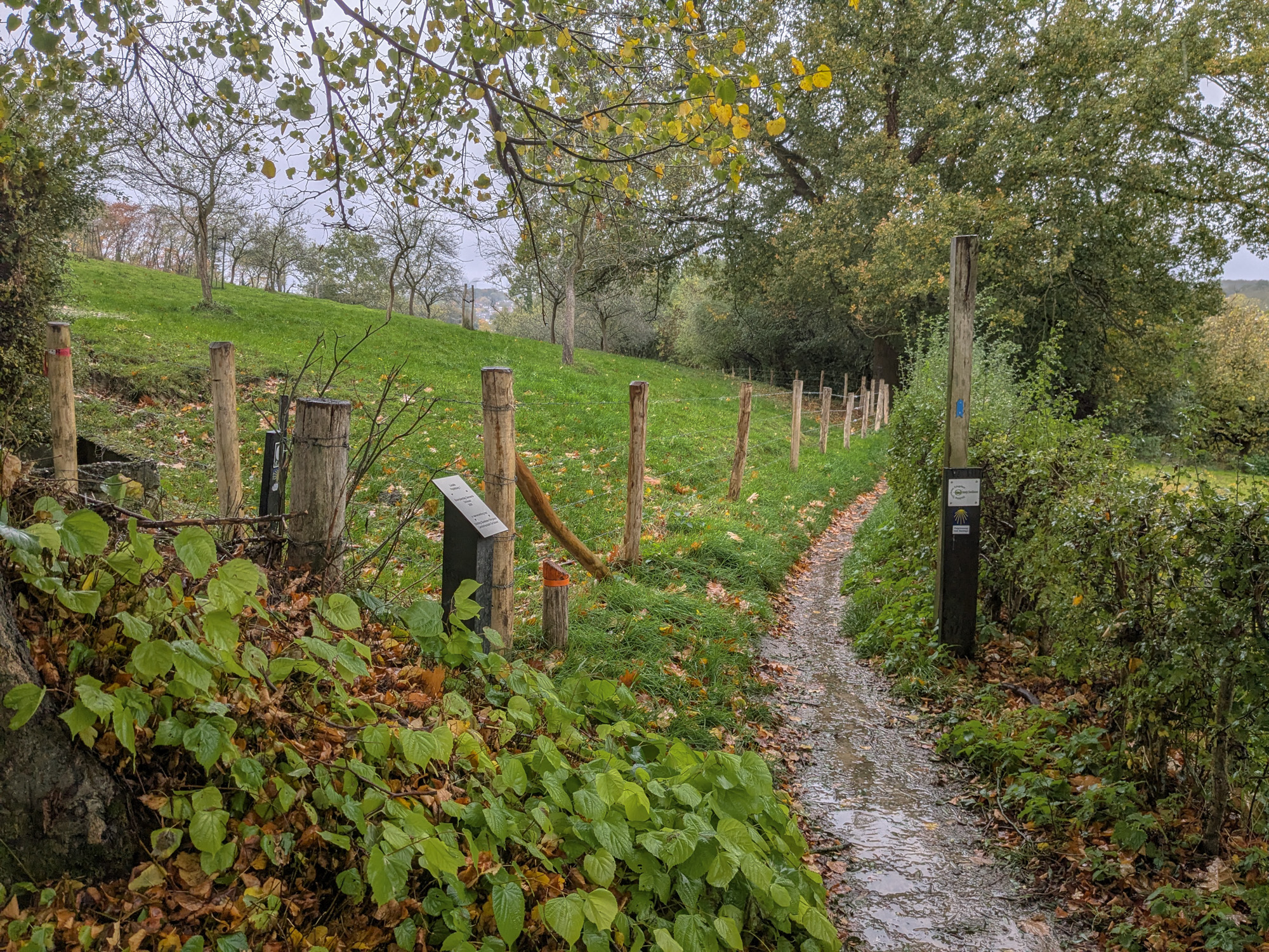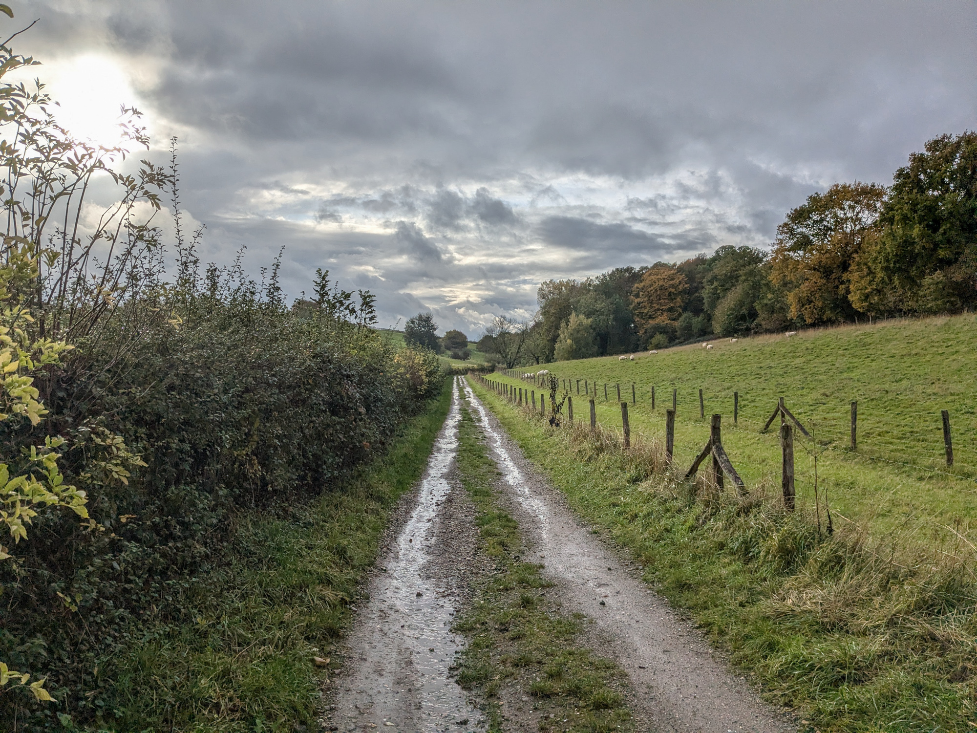 Na het kerkje voegt de route opnieuw samen met die van het Pieterpad. We lopen ten hoogte van station Spaubeek en met een oversteek van de snelweg het gelijknamige dorpje binnen. Na Spaubeek wordt het landschap iets opener. Lange rechte gravelpaden en eindeloze akkers waar tot voor kort nog mais stond. De luchten betrekken opnieuw in alle tinten grijs. De regelkleding en wandelschoenen beginnen na zo’n 4 uren in de buien er de brui aan te geven en slaan door. De eerste tekenen van nattigheid door onverwachte wat koudere tenen, of een klamme aanraking wanneer je even een broodje uit je tas haalt.