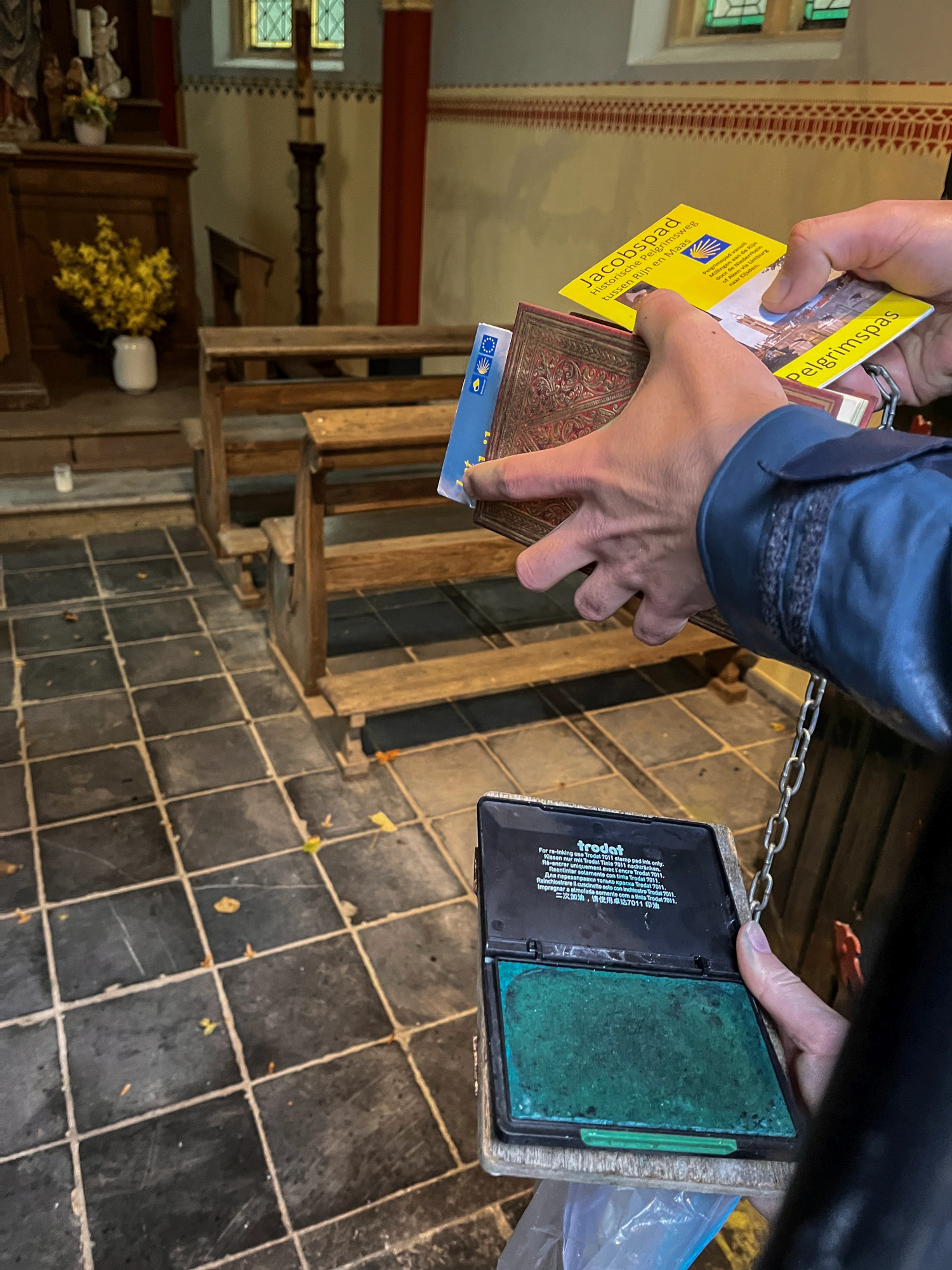 Een groot zwart ijzeren traliehek verspert de doorgang naar binnen. Wel zien we binnen reikafstand een houten kistje op de grond staan. Nat van de regen, die met de wind op de voorgevel een eerste halve meter het kerkje wordt ingeblazen. In het kistje liggen naast kaarsjes ook een houten stempel, en een inktkussen. Met de buiken strak tegen het traliehek, reikend naar binnen proberen we onze stempelkaarten droog uit de beschermzakjes te halen en zo nog enigszins droog een stempel bij te zetten. Een heel gestuntel met het aan elkaar doorgeven van alle benodigdheden. Maar het is gelukt! Een afdruk in groene inkt van de stempel van de Sint Annakapel.