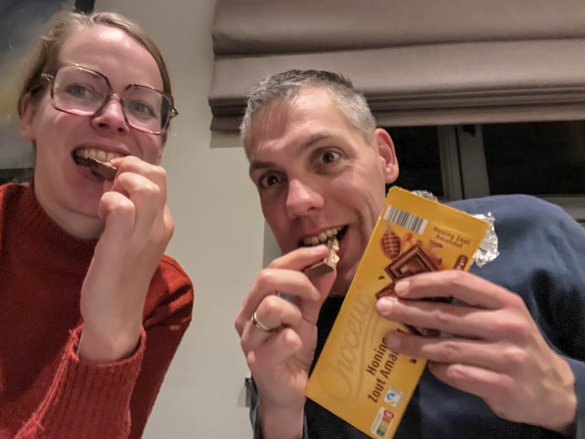 Geheel volgens onze traditie bij wandelweekendjes openen we een Escape Room tafelspel. En daarnaast mag ik nu het eerste cadeautje van Baudien openen. Haar moeder had haar dit fleurig verpakte presentje meegeven, te openen voor bij het escape spel. Het pakje van zo’n 20 bij 10 centimeter, en een centimeter dik doet denken aan een chocolade reep. En het klopt! Een heerlijke mega caloriebom van chocolade, honing en amandel. Lekker hoor! Zoals te verwachten heeft de reep het einde van het spel helaas niet gehaald. Wij zelf overigens ook niet helemaal. We zijn te moe voor de laatste eindpuzzel en besluiten tandjes te poetsen en de rust op te zoeken. Tot morgen!