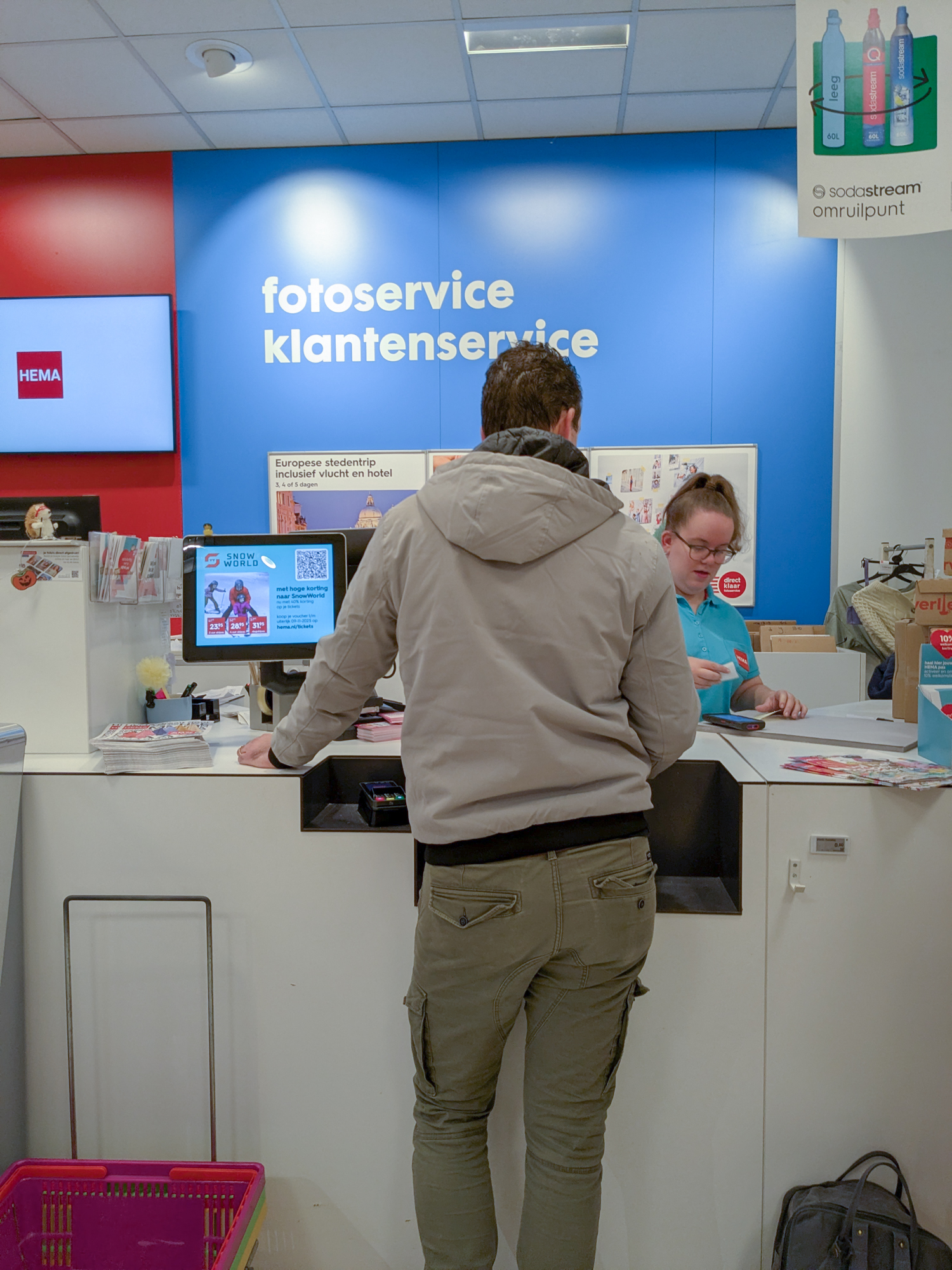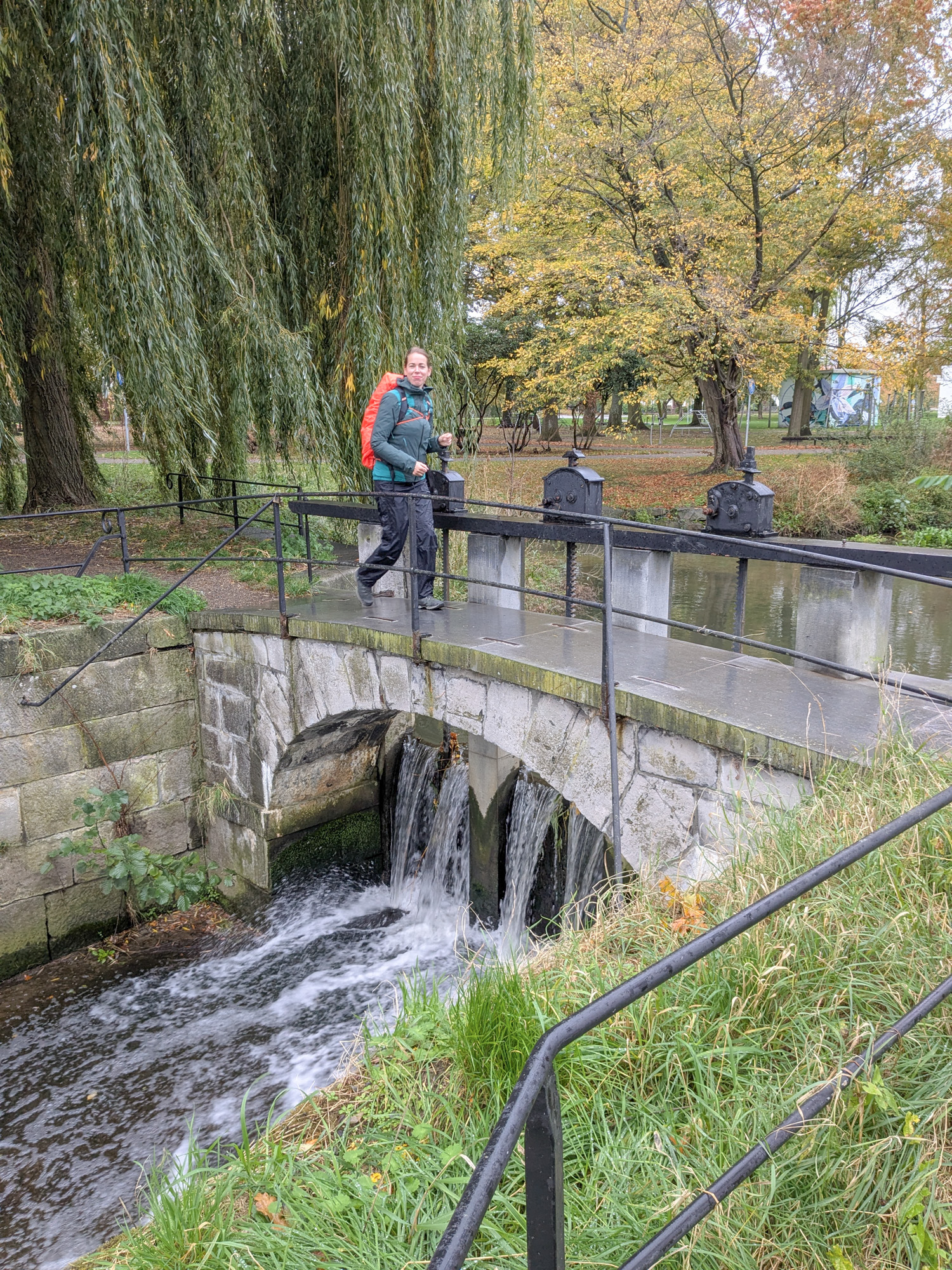 We komen aan op het station van Sittard en lopen via de Stationstraat en Steenweg het centrum door tot aan de Markt in de binnenstad. Vanwege de eerste spatjes gaat de het eerste deel van de regenkleding alvast aan. Maar dan moeten we plots de Hema in. Ik heb namelijk bij de fotosnelservice hier in Sittard een afdrukje laten maken voor in het eerder gegeven fotolijstje. Een bewerkte foto van ons op een eerdere zeiknatte wandeltocht. Bedroefde koppies. Niet de mooiste foto, maar daarom juist. Het mooie zien in alle treurigheid. In een tweede kaartje licht ik het bedankje toe: 1 uitnodiging, 3 wandelgidsen, 5 provincies, 25 wandeldagen, 113 uren, 123 woonplaatsen en 555 kilometers. Een prachtig avontuur, waarbij we nu van start zullen gaan met de laatste 2 etappes in Limburg. Zullen we nu dan beginnen? Baudien geeft aan ook nog twee presentjes te hebben. De ene is voor vanavond, en de andere voor morgen als we het gehaald hebben. We stoppen alles droog weg en duiken diep in de regenkleding. Okay, let’s go!