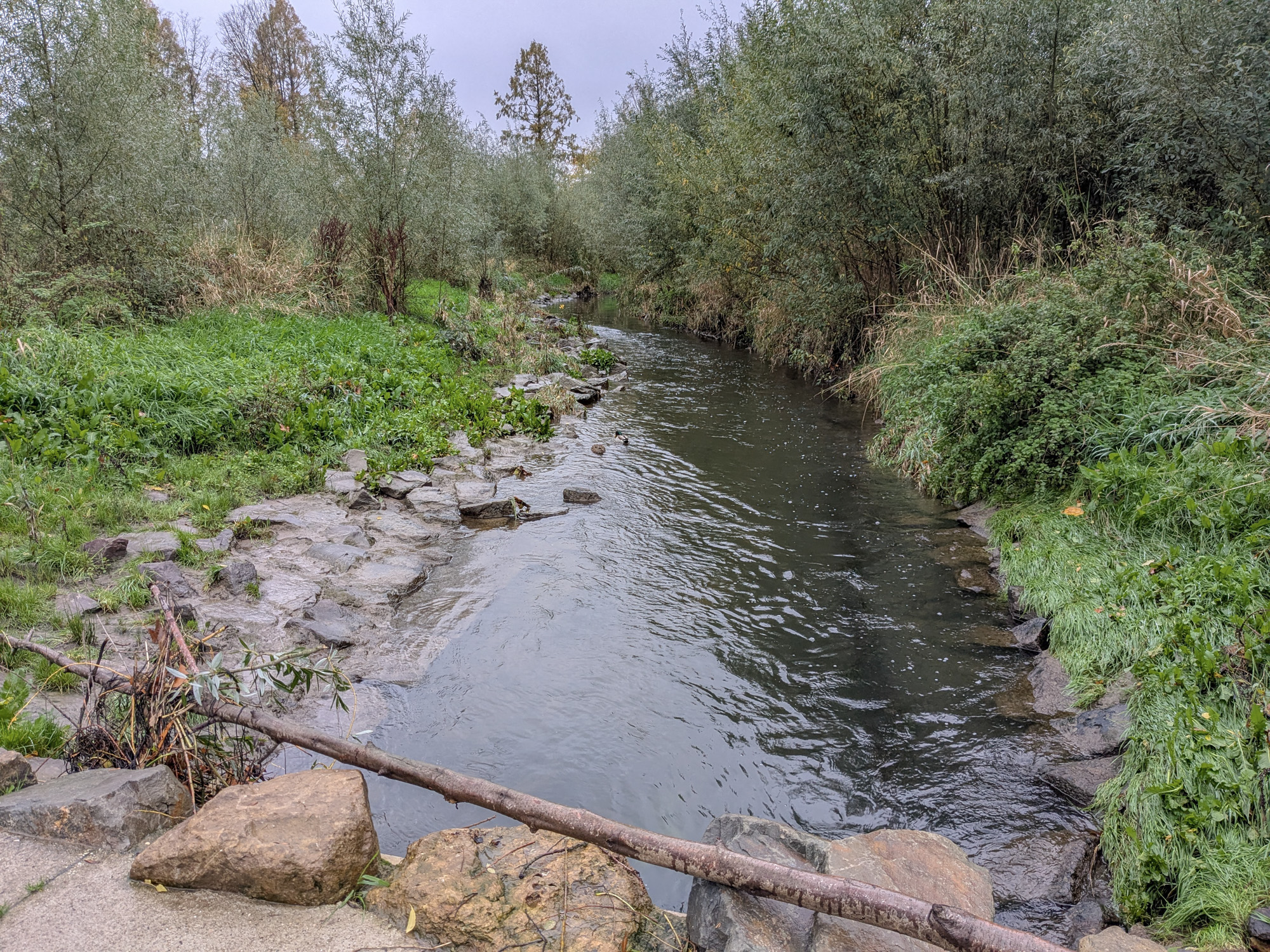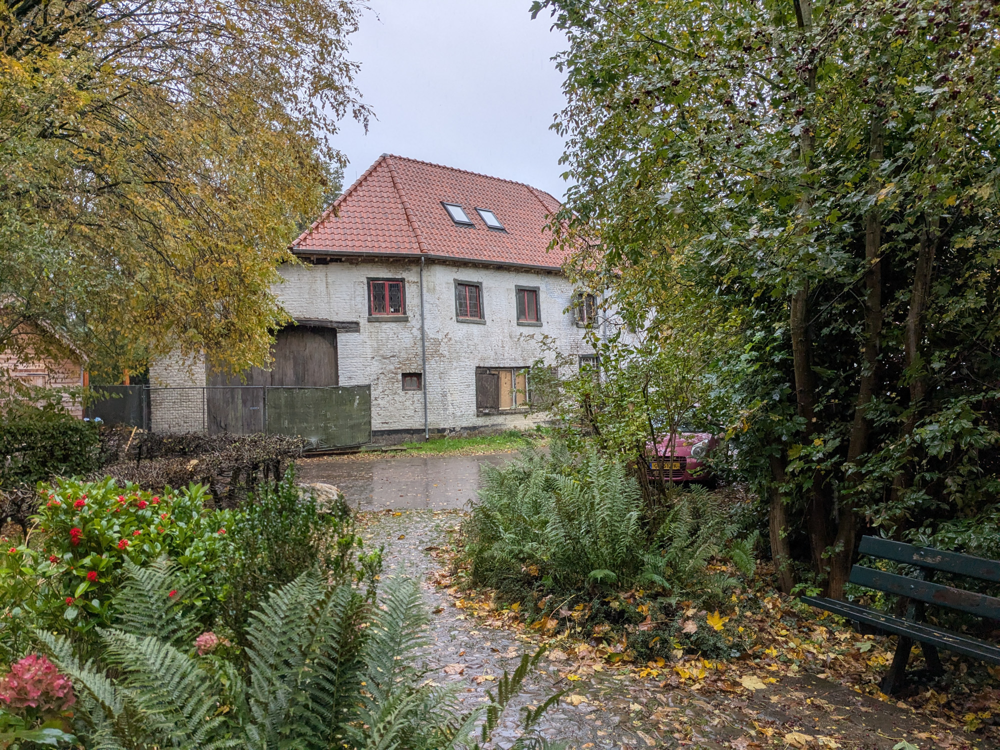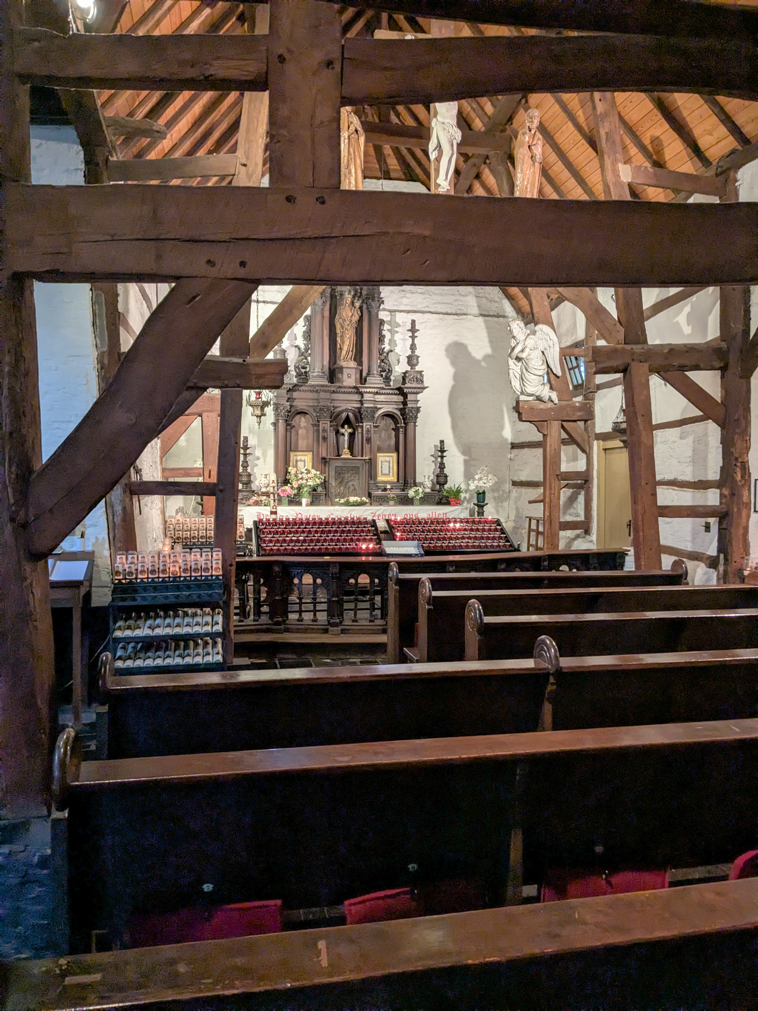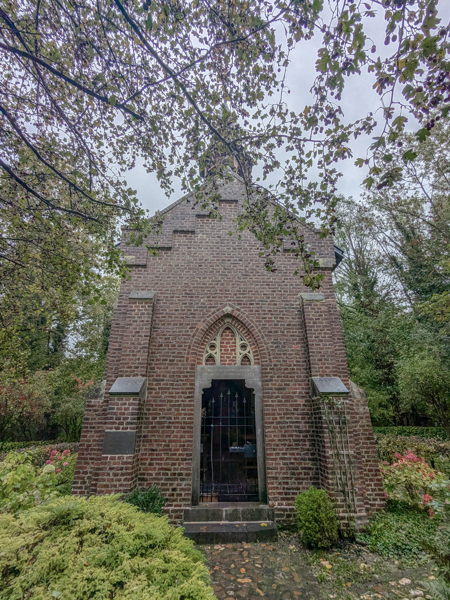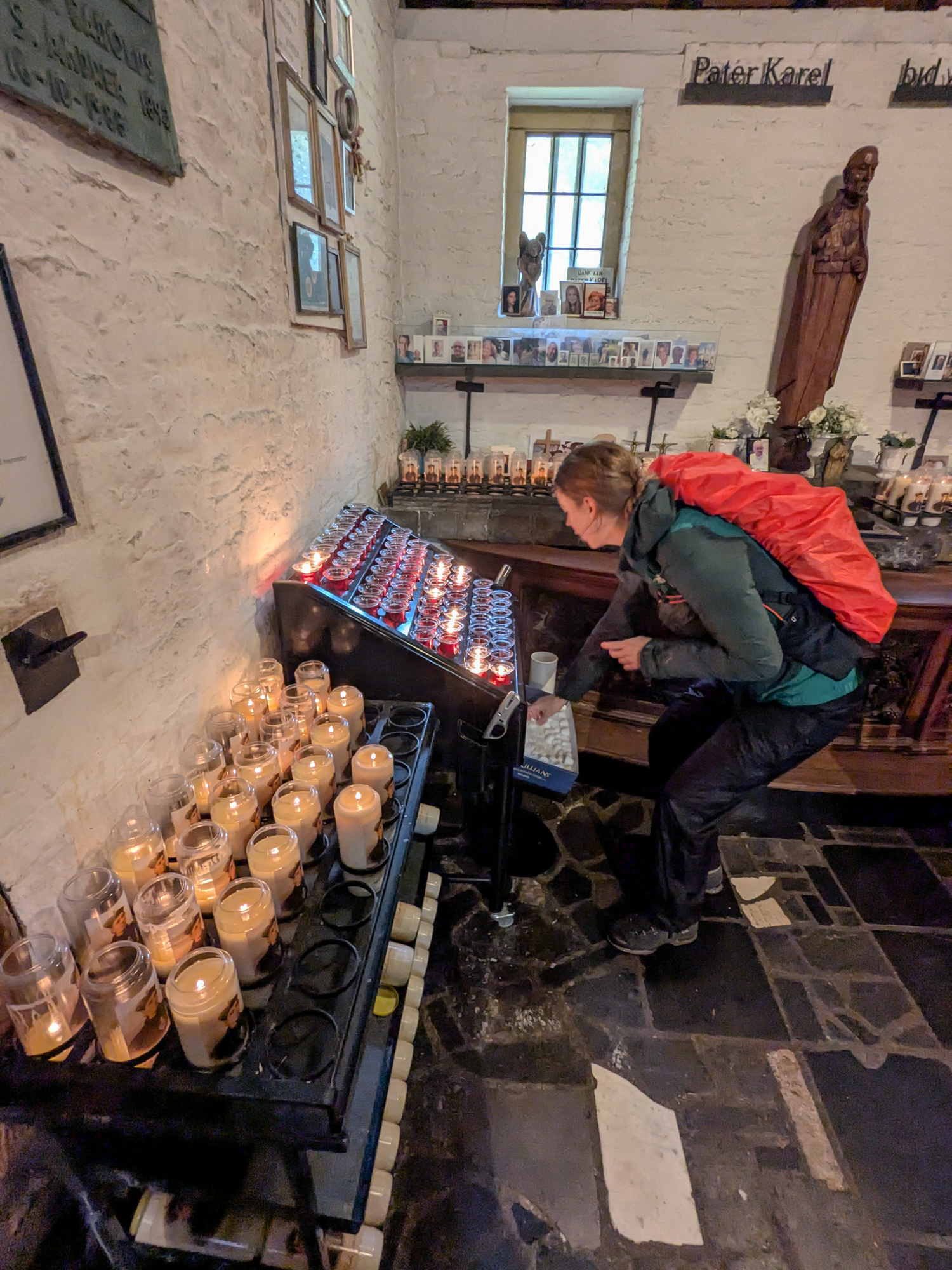 Langs de Molenbeek lopen we dwars door Sittard richting het zuiden. De route begint op deze manier verrassend. Langs diverse woonwijken, maar door de beekjes, parkjes en stukjes bos een heel landelijke aanblik. Je waant je echt niet in de stad. Bij Mustergeleen, wat we heel letterlijk links mogen laten liggen loopt de route af op het geboortehuis van Pater Carolus Houben. De beste man is ons verder niet bekend. Wel zien we op een pand dat een typisch Limburgs boerderijtje lijkt een bordje dat de kapel open is. We volgen de bordjes naar binnen en komen in de voormalig boerenschuur aan in een volledig ingerichte Limburgse kapel. Rijk gedecoreerd. Beelden, franje, en vele tientallen, misschien wel honderden kaarsjes. Baudien heeft nog wat wisselgeld over van vanmorgen en we besluiten een kaarsje te branden voor naasten die op dit moment wat steun kunnen gebruiken. Tevens hopen we dat het misschien iets aan het barslechte weer veranderd, want de regen wordt zo nu en dan heviger.