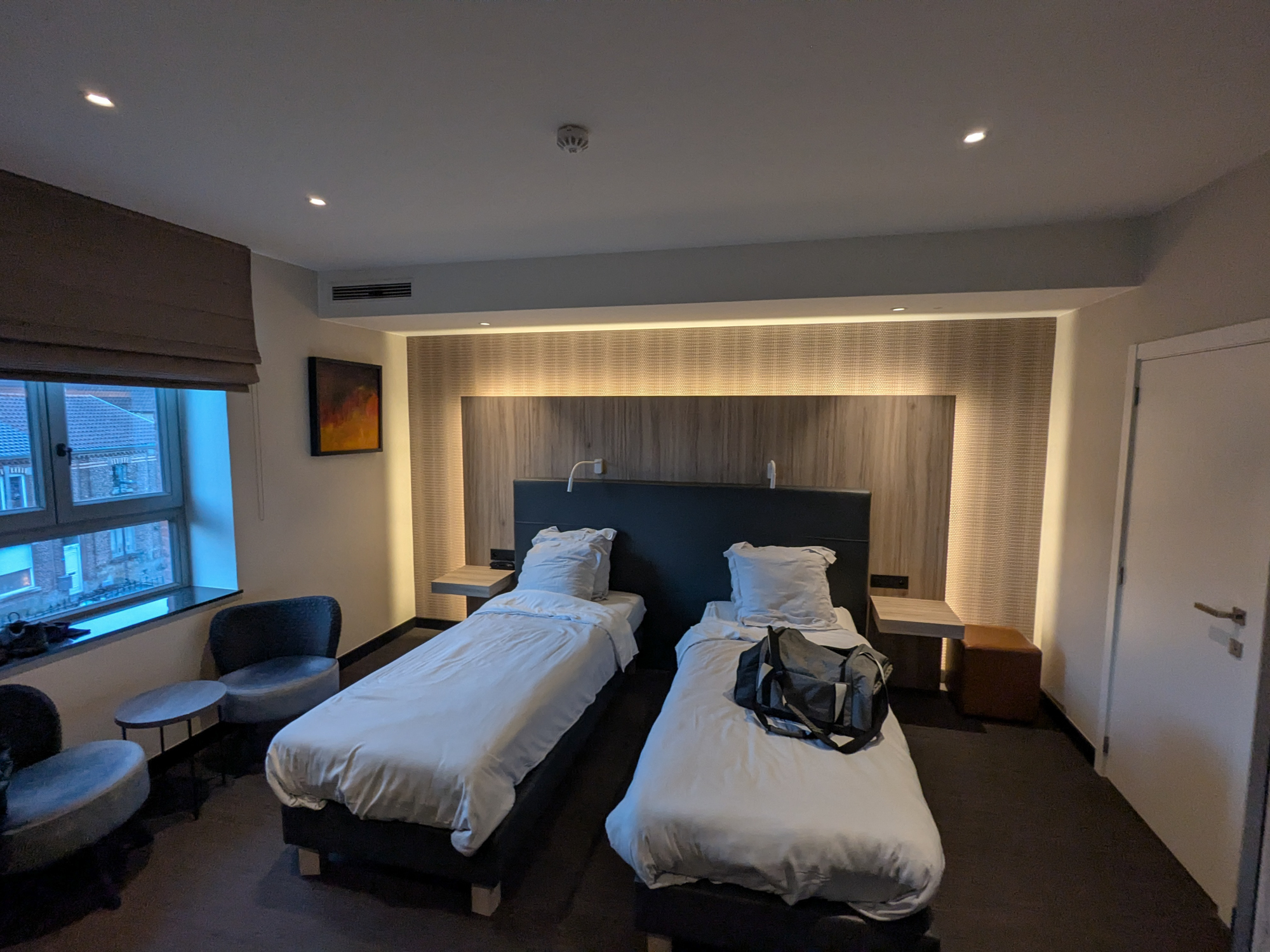 We komen aan in Meerssen, bij de Basiliek van het Heilig Sacrament. Een paar minuten na vijf. Een paar minuten na sluitingstijd. We hadden gehoopt hier een tweede stempel te kunnen vinden, maar zullen dat morgen opnieuw moeten proberen. Het is eerst tijd voor een warme douche, dus op naar ons verblijf. Via het Proosdijpark lopen we naar de auto, en rijden we in een half uurtje vanaf Meerssen, dwars door Maastricht naar het Belgische Millen. We hebben geboekt bij De Twee Broeders, direct naast de Stephanuskerk en moeten de auto even verderop parkeren. Tassen mee, en op naar de kamer.