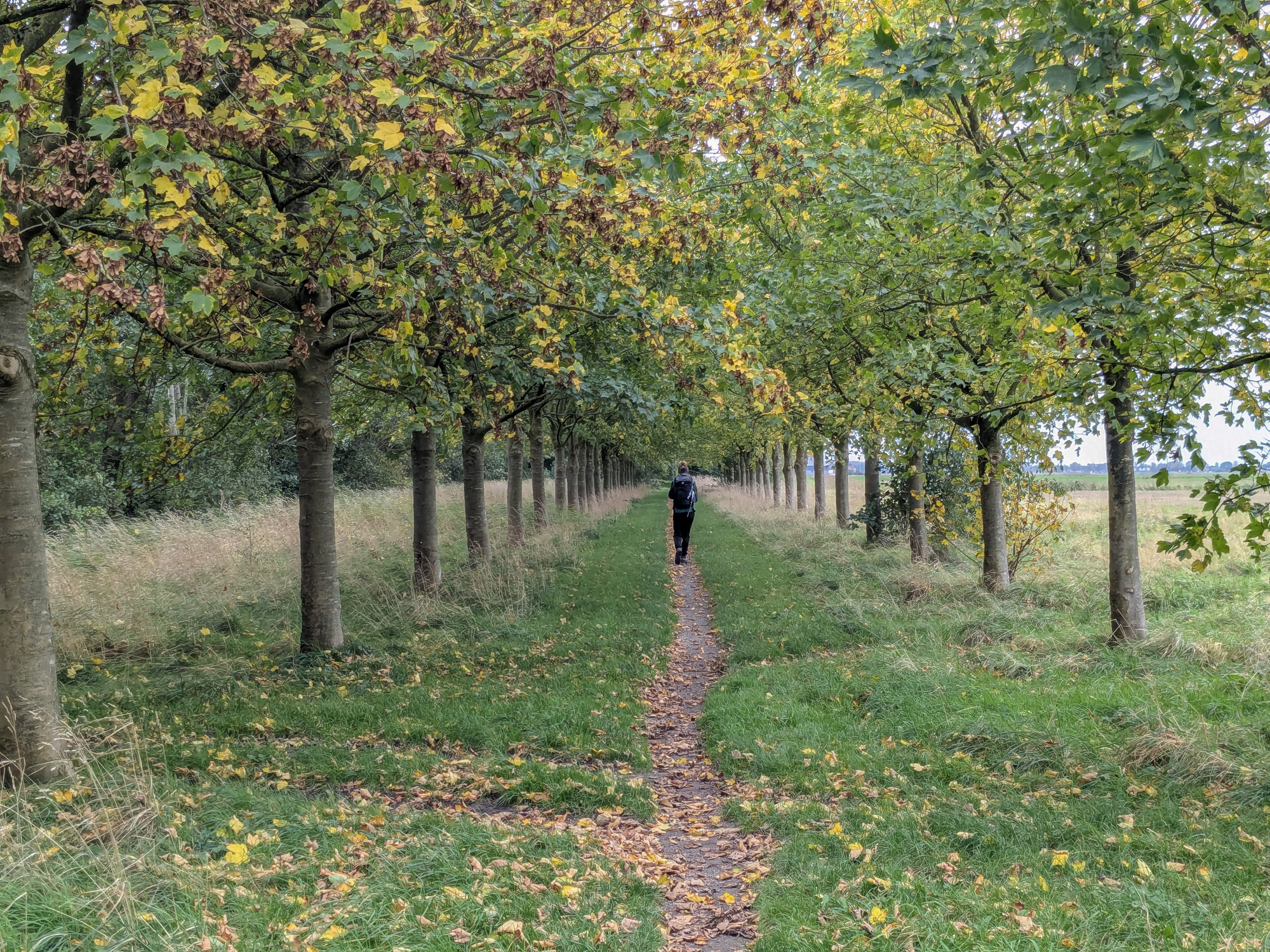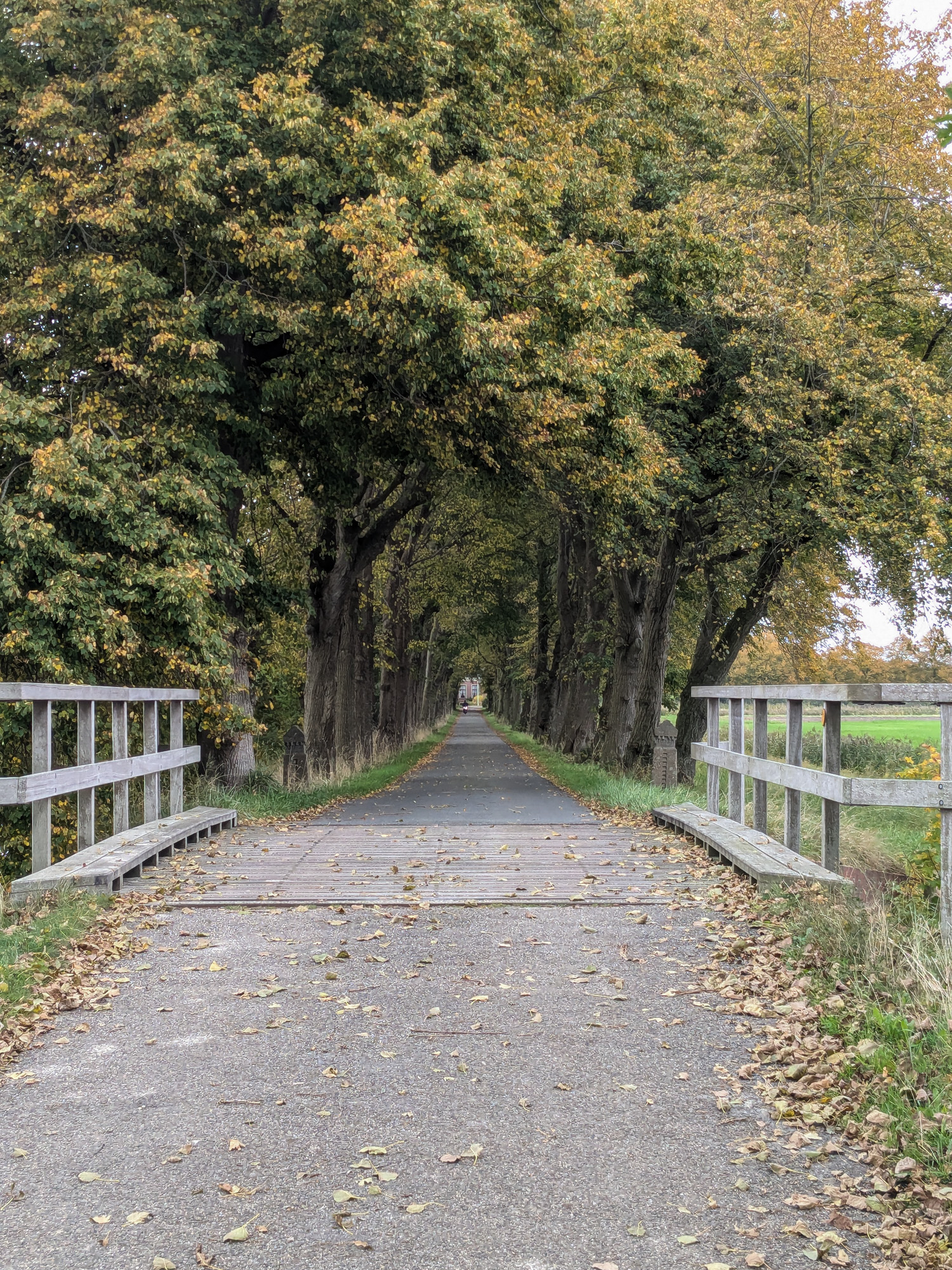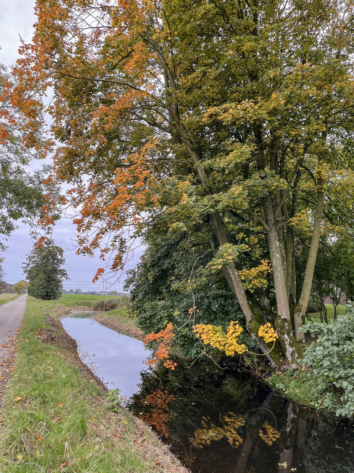 Wij stappen op de fiets en rijden in een dik half uur naar de Mariakerk net onder Uithuizermeeden. De fietsen zijn we in de stalling bij de kerk, en dan kan de wandeling beginnen. Het eerste stukje loopt de route een stuk terug richting de Rensumaborg. Drie weken geleden was het hier nog behoorlijk regenachtig. Nu hebben we er prima rustig najaarsweer bij. Net na het spoor slaan we rechtsaf en lopen via de achterkant van het station een stukje centrum door.
