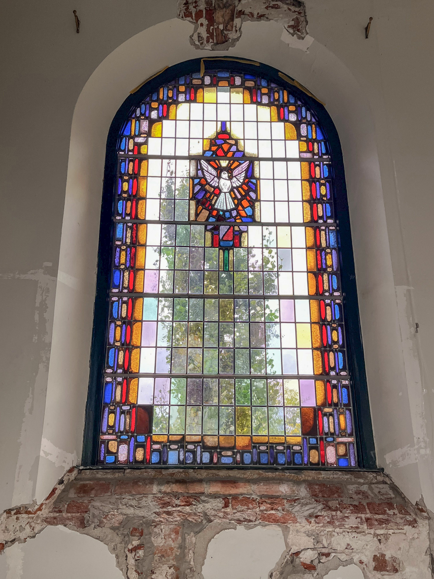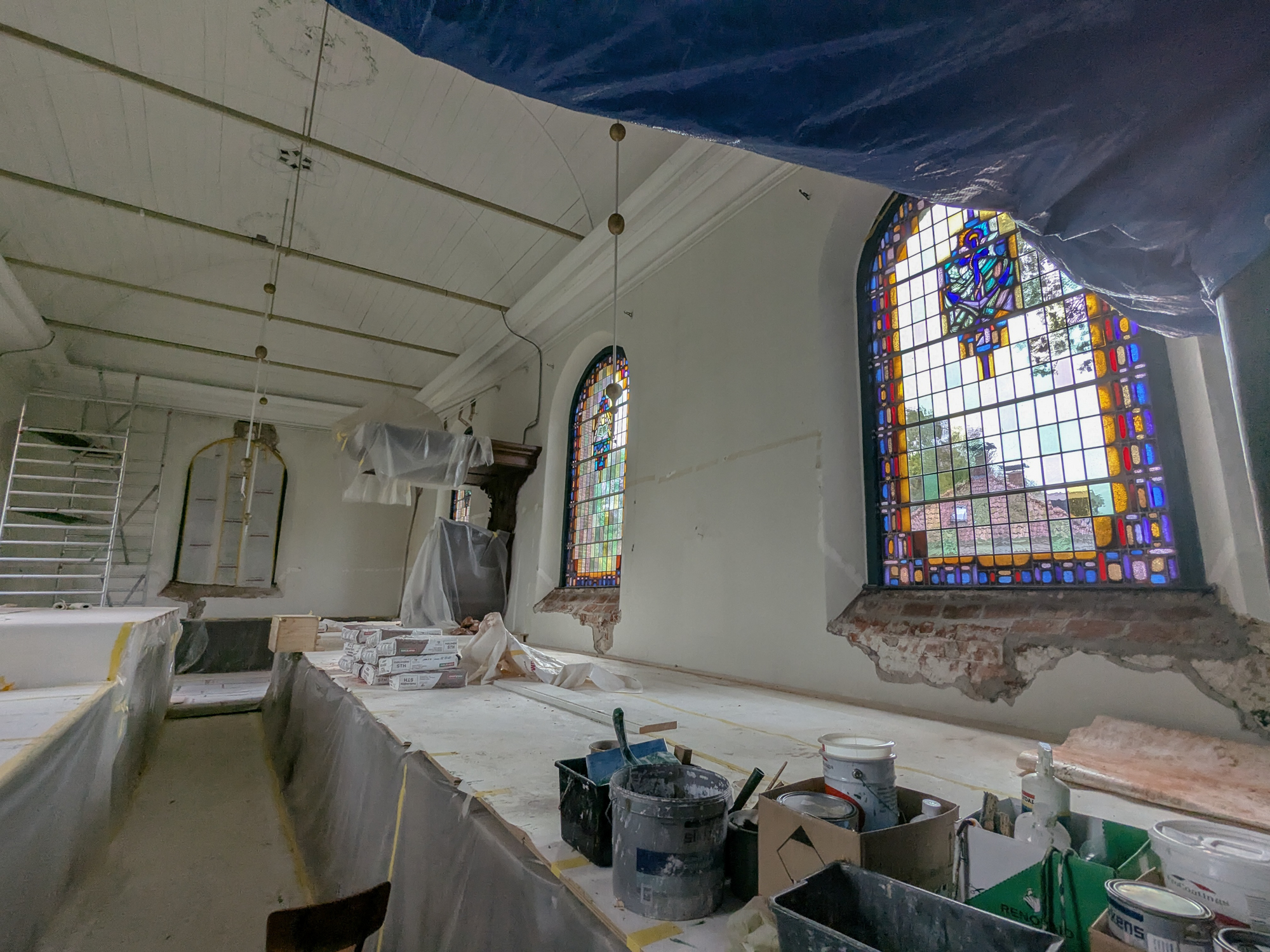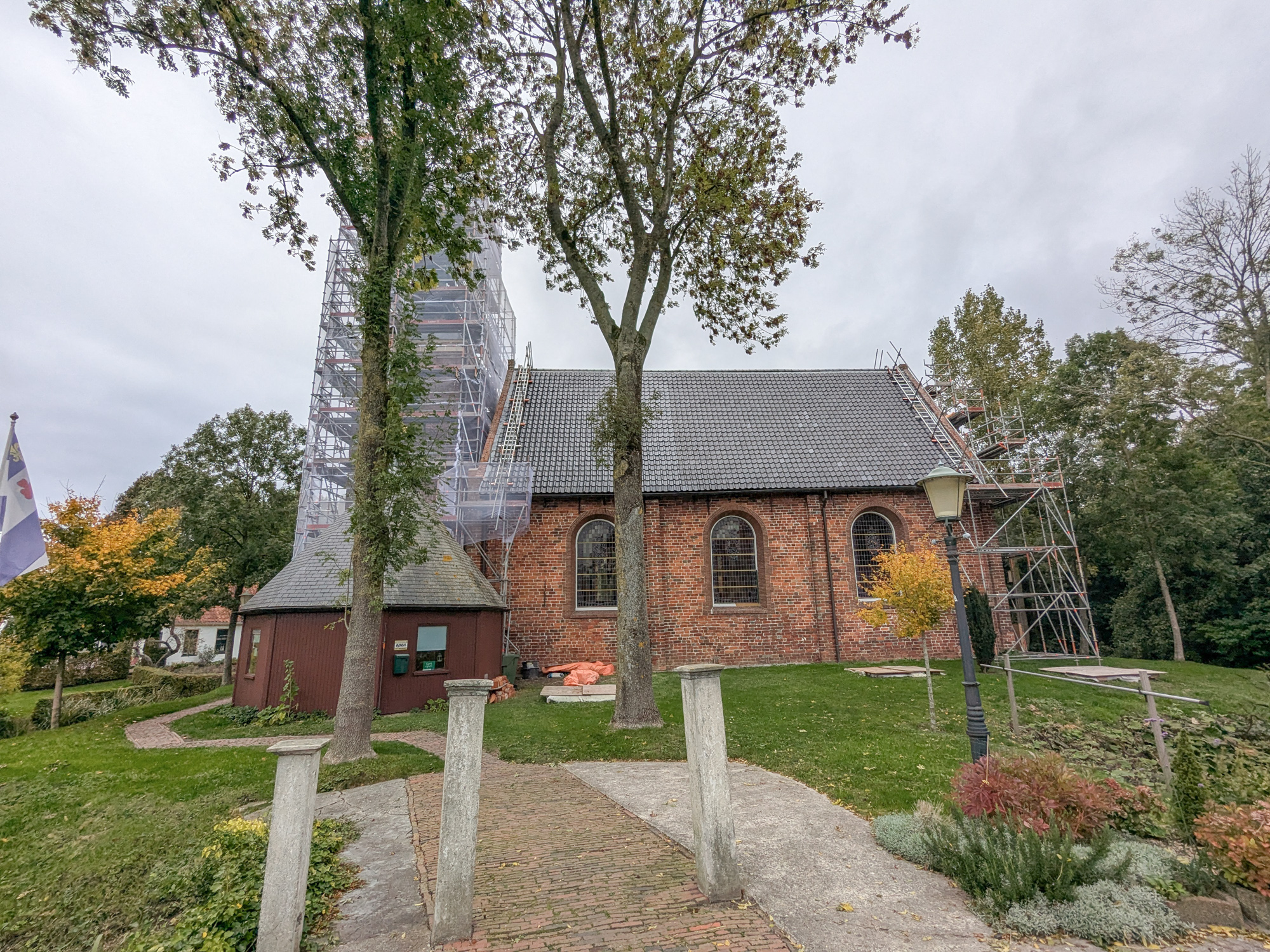 Ten hoogte van de Losdorpermaar gaan we weer de landen in en zigzagt het pad richting Losdorp. Nu zien we de Johanneskerk van Losdorp wat onze eindlocatie is. De kerktoren staat vanwege restauraties in de bouwsteigers. Aan het bijgebouwde hangt een plakkaat met de mededeling dat vanwege werkzaamheden de kerk wat minder goed toegankelijk is, maar we wel een stempel kunnen vinden. We betreden het hokje en zien een nette tentoonstelling van spullen uit de kerk, en informatie over de verbouwing. Ook vinden we de Ziltepad boekjes en stempel en zetten voorlopig de laatste stempel hier in de provincie Groningen bij. Het zit er op, althans de wandelroute. We moeten nog even terugrijden om onze fietsen weer op te pikken bij de start.