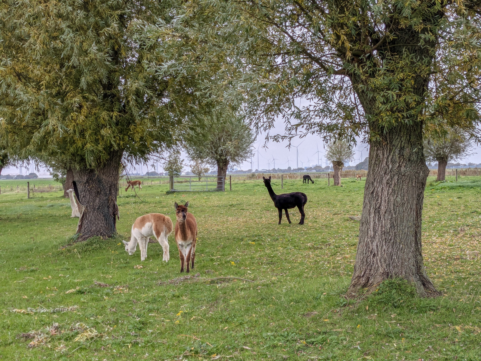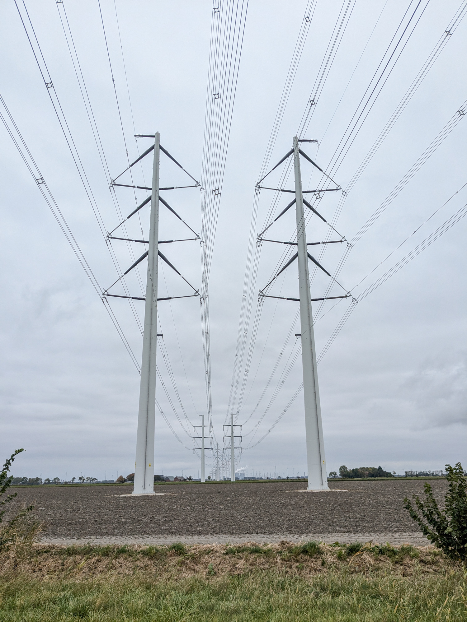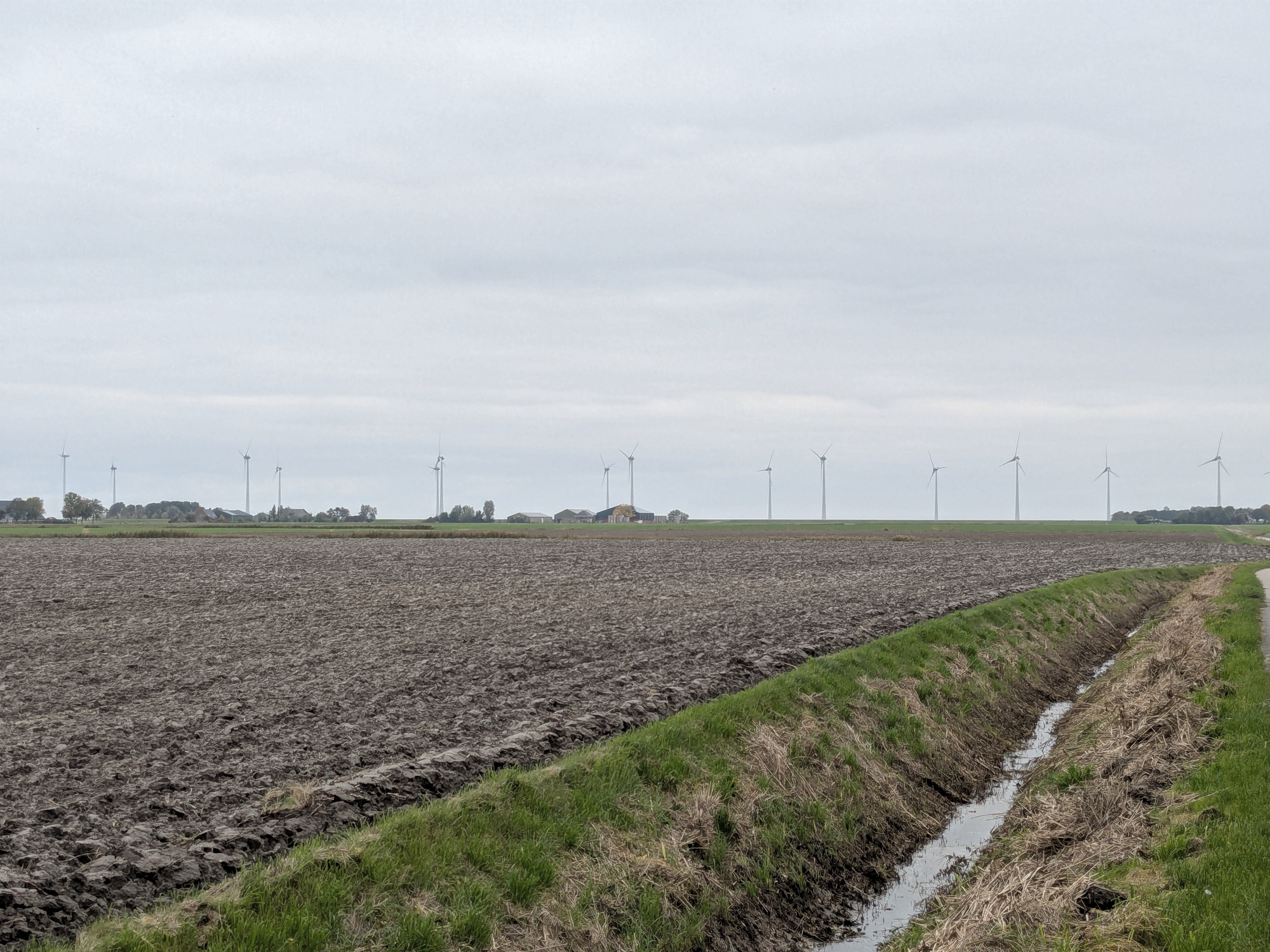 Aan de zuidkant van Uithuizermeeden passeren we opnieuw twee keer het treinspoor, en lopen dan noordelijk het dorp uit. De omgeving wordt hier weer kaler op de voormalige zeebodem van wat ooit Waddenzee en de uitloper van de Dollard was. Rond 1450 is de regio vanaf Uithuizermeeden verder naar boven ingepolderd. De huidige zeedijk ligt nog een kilometer of 7-8 verder op. Wat richting die dijk wel opvalt is de eindeloze rij windmolens die in een lange rechte strook vanaf de Eemshaven staan opgesteld.