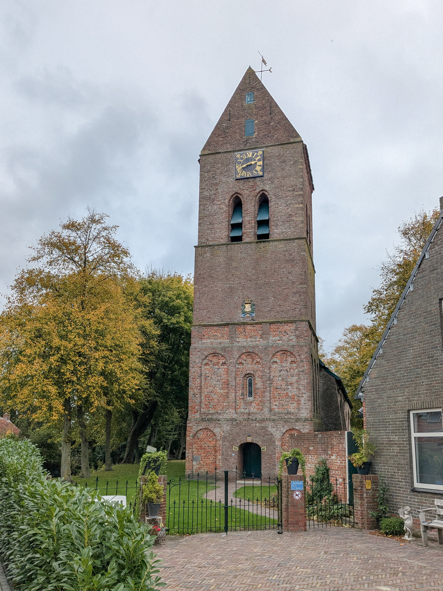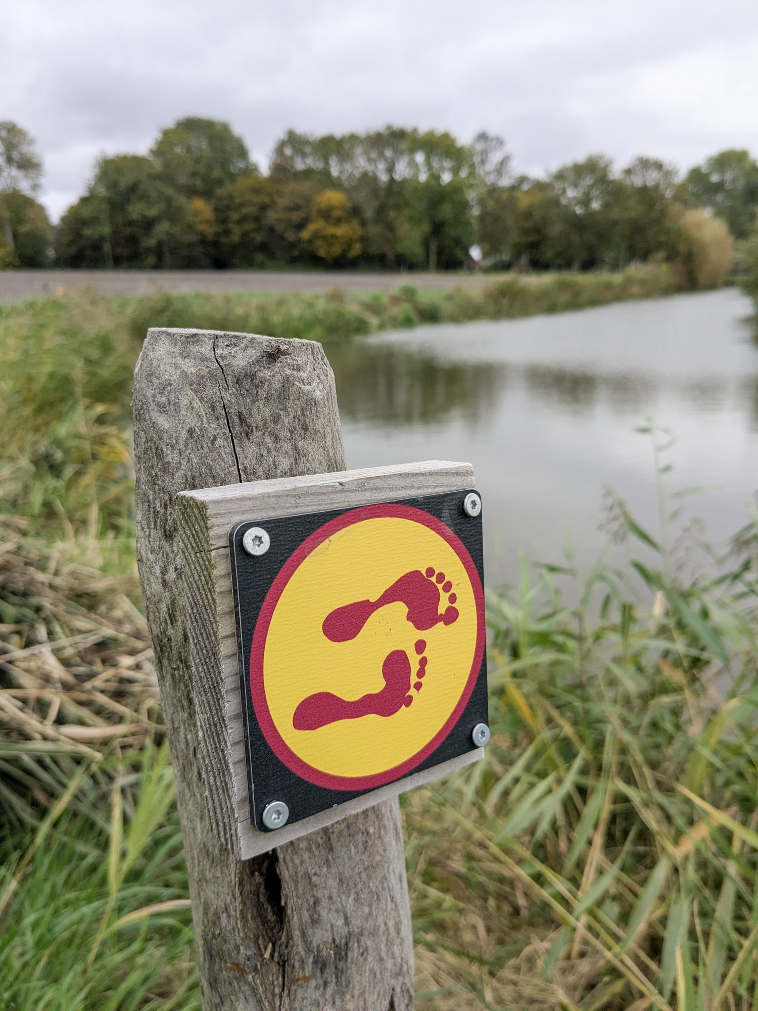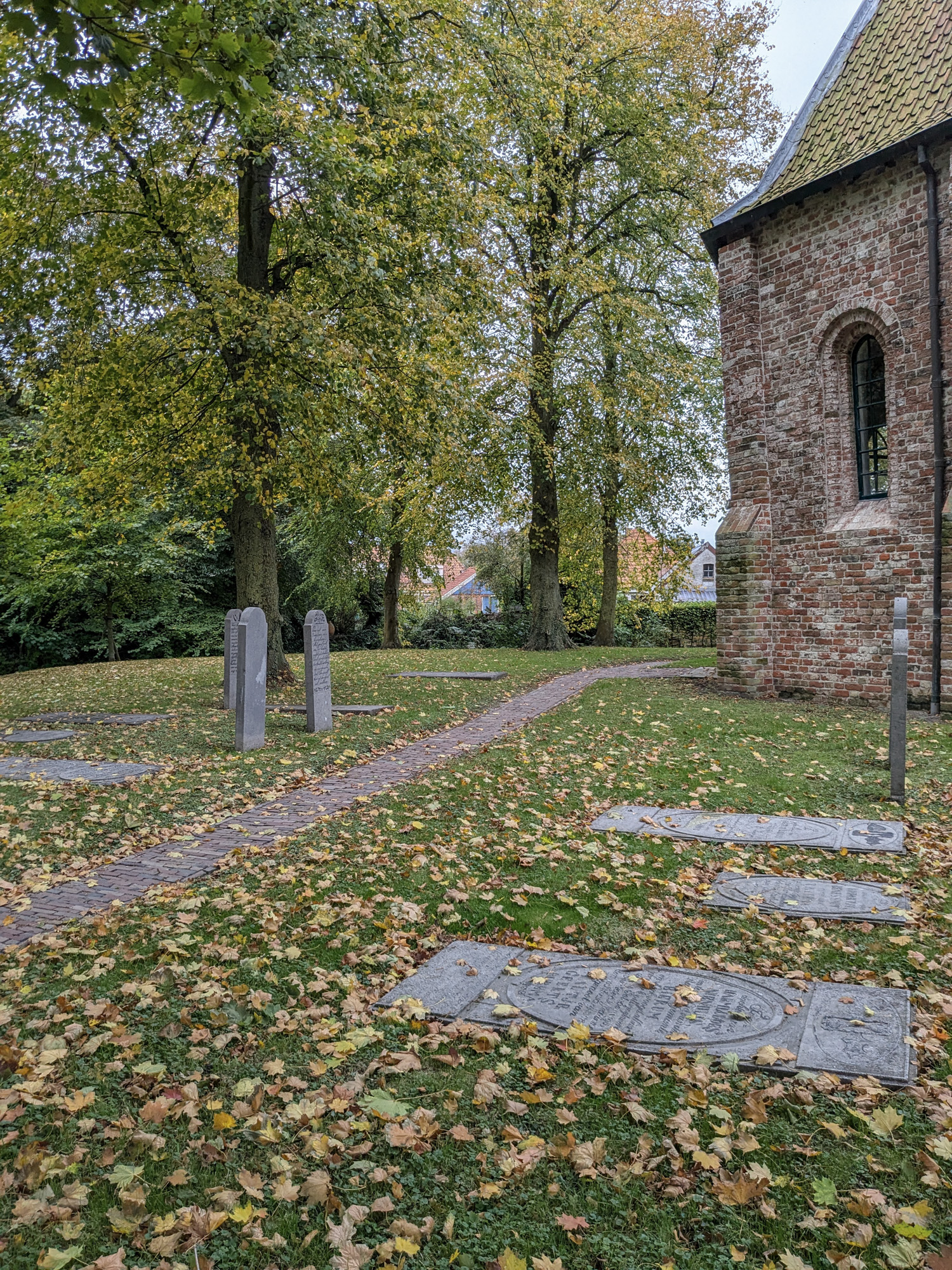 Via het kerkhof loopt de route, zonder verharding, naar de overkant van het kerkhof. Er liggen nog een klein aantal hele oude graven. Sommigen nauwelijks leesbaar. Anderen netjes gerestaureerd en onderhouden. Via een houten bruggetje steek je de omliggende gracht over. We lopen heel even de verkeerde kant op, maar keren langs de kerk weer terug op de route.
