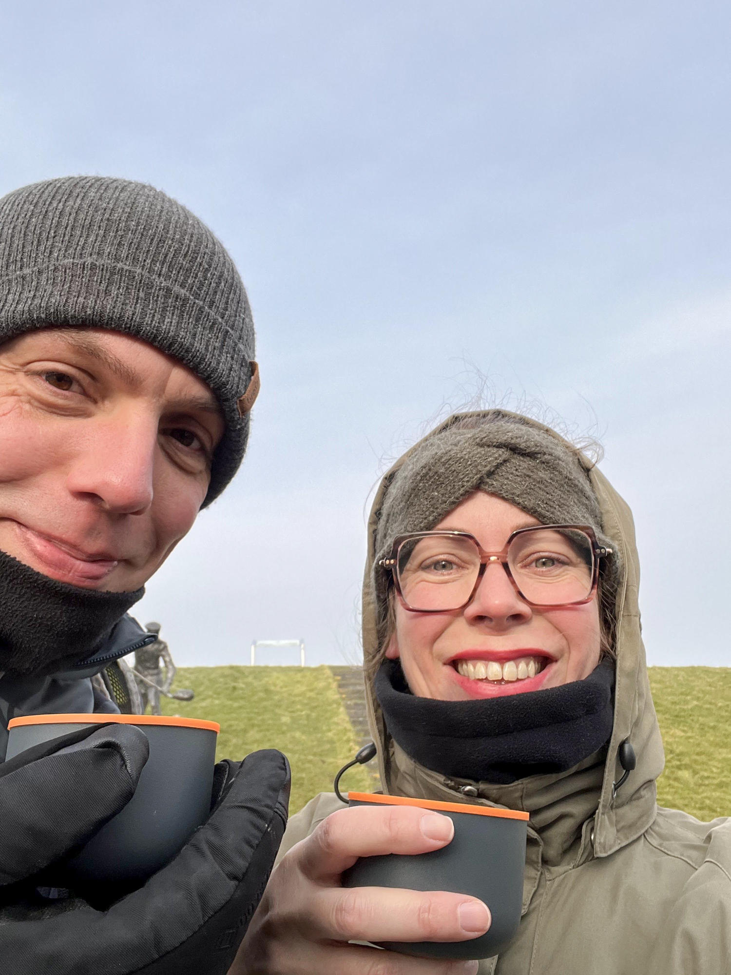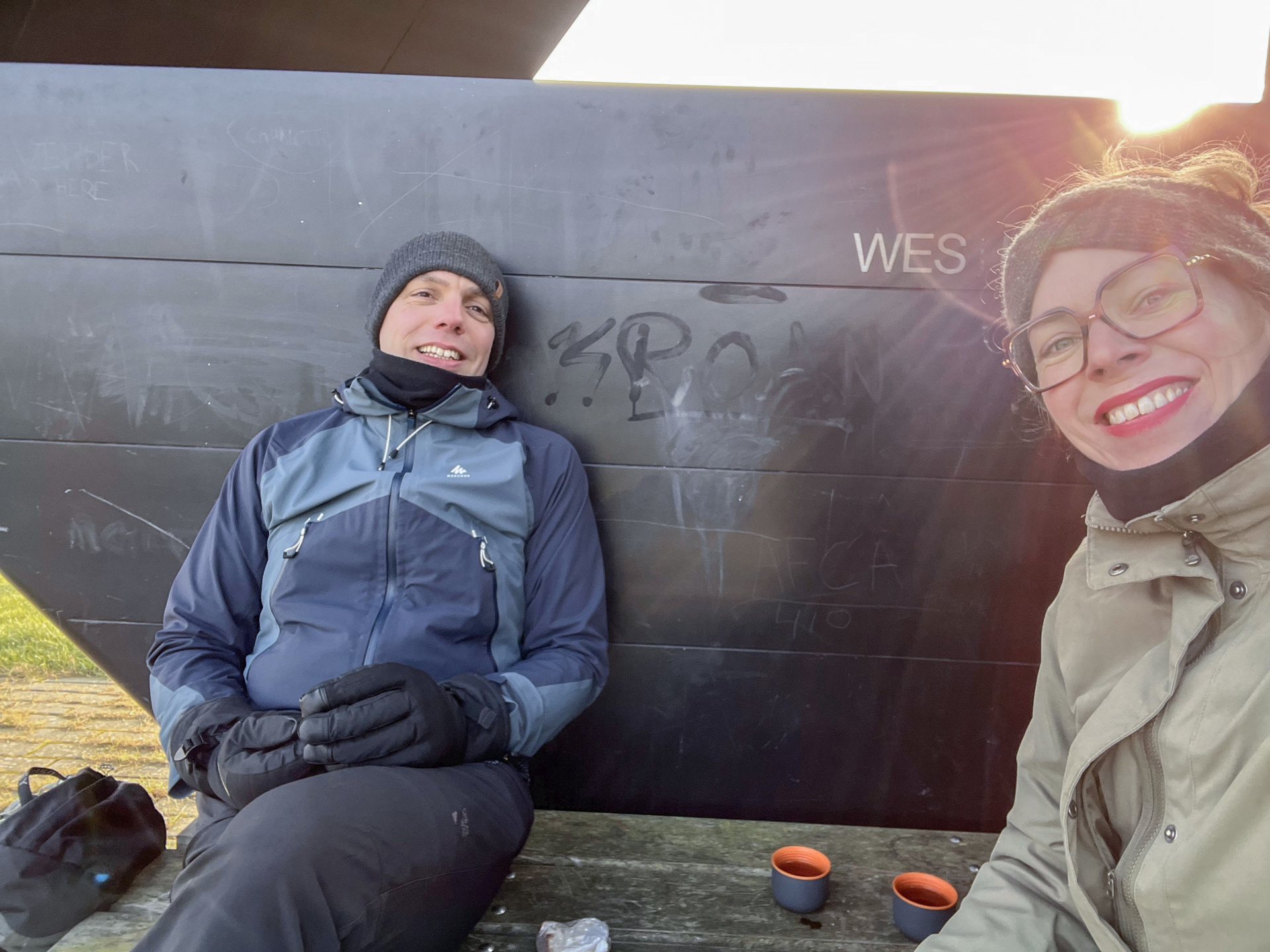 Na een paar kilometer mogen wij Westhoek rechtsaf en lopen we een kaarsrechte weg richting de huidige zeedijk. Bij een bankje en tevens kunstwerk zoeken we de zijde uit de wind en nemen kort plaats voor een theepauze (mét sûkerbôle). Wanneer we verder lopen besluiten we aan de zeezijde van de dijk te gaan lopen, waardoor we mogelijk wat minder last hebben van de gure Zuidoosten wind. Het is hier kaal. En fris. We zijn blij als we na een kilometer of zes opnieuw wat beschutting kunnen vinden bij het monument bij Zwarte Haan. Hier nemen we opnieuw een bakje thee.