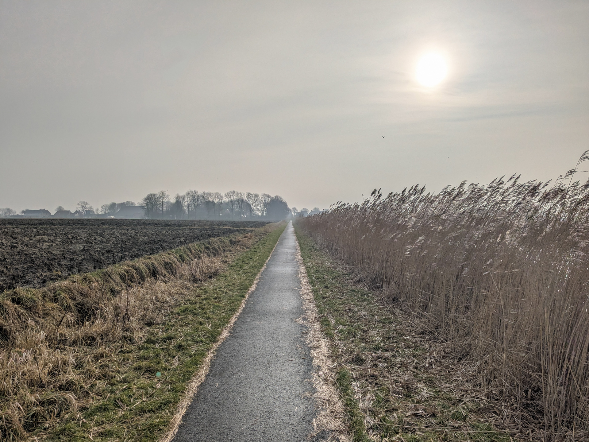 Maar al direct vanaf de parkeerplaats is het glad. Spekglad. Over de gestrooide weg lopen we voor de kerk langs. Vanuit St. Jabik lopen we via de westkant van het dorp over een schelpenpad. Deze ondergrond is gelukkig minder vatbaar voor de ijzel, en we kunnen goed doorlopen richting de Oude Bildtdijk. Deze toenmalige zeedijk, was één van de eerste zeewaterkeringen in Nederland en de aanleg ervan begon in 1505. Langs vele kleine markante dijkhuisjes lopen we opnieuw naar het westen.