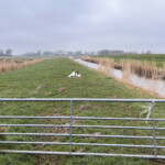Na dit avontuur vervolgt de route zich langs een polderkanaal met aan weerzijden verhoogde dijkjes. Eerst achter een rijtje huizen langs, dan bij een stalen hek zoals we die op IJsselmeerdijk eerder zagen, en toen… een kwade briesende gans. Midden op het dijkje. Het waakse beest staat met hoog gestrekte hals duidelijk te maken dat dichterbij komen geen optie is. We checken de optie of we er links omheen kunnen. Een meter of 5-6 ruimte. Als we doorstappen dan redden we dat misschien. Maar nog voordat we dat idee in werking kunnen zetten duikt de gans met zijn kop in onze richting en komt luidkeels briesend op ons af gestormd. W00t! We trekken ons snel terug achter het hek en nemen verdere afstand. Deze dude gaat ons er zekerteweten niet langs laten. Bij de illegale oversteek van het bouwterrein zojuist, dachten we een omleiding te besparen, maar deze gepikeerde vogel respecterende besluiten we toch maar om te lopen via de weg.