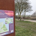 Vanwege broedseizoen mogen we sinds vorige week niet meer de oversteek maken door het gebied, en worden we geïnstrueerd om de alternatieve route met de paarse pijlen te volgen. Het is maar goed dat we de route op GPS mee hebben, want de paarse pijlen zijn we al gauw kwijt. Net als andere paaltjes van het wandelnetwerk die meer dan regelmatig ontbreken. Na opnieuw een stukje bos komen we aan bij de IJsselmeerdijk. Hier bezoeken we kort een uitzichtpunt met informatie over het “Gat in de dijk”. Hier is in oorlogstijd de dijk richting de Wieringermeerpolder opgeblazen. Later is deze locatie omgebouwd tot vogelreservaat, waar je vanaf dit uitzichtpunt een mooi overzicht hebt.