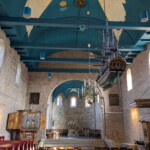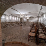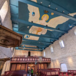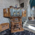 Een paar minuten later komt een vrolijke meneer ons de toegang tot de kerk verschaffen. We krijgen de stempel voor etappe 7 bijgezet, en mogen de kerk bezichtigen. Hij was natuurlijk niet voor niets gekomen, verzekerde hij ons. Ook wijst hij ons op de opengestelde crypte die onder het koor van de kerk zit. Het trappetje af, een dik rood gordijn door, en hier zien we de vrijwel lege maar zeer netjes onderhouden crypte. Er staan een aantal oude stenen lege lijkkisten opgesteld, waarvan de geschiedenis verder onbekend is. Mogelijk ooit van welgestelde Wieringers? Of zeevaarders? Informatie ontbreekt, en verder is er hier beneden niet veel te zien.
