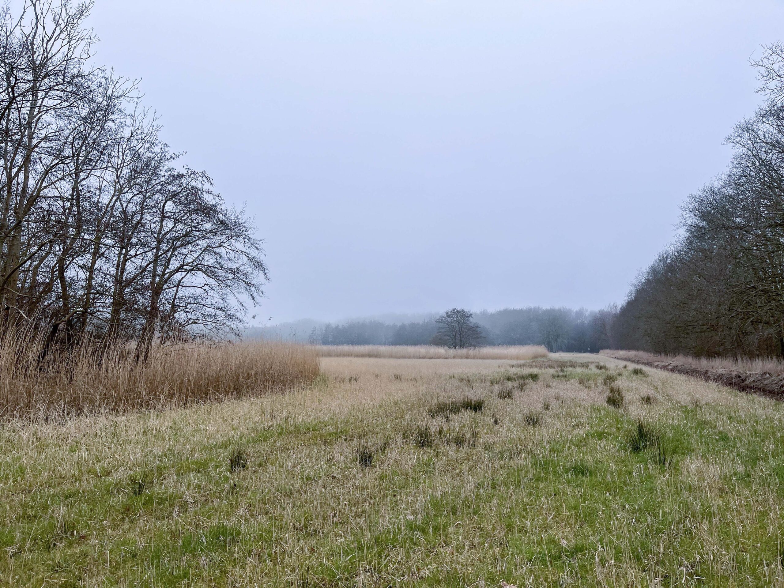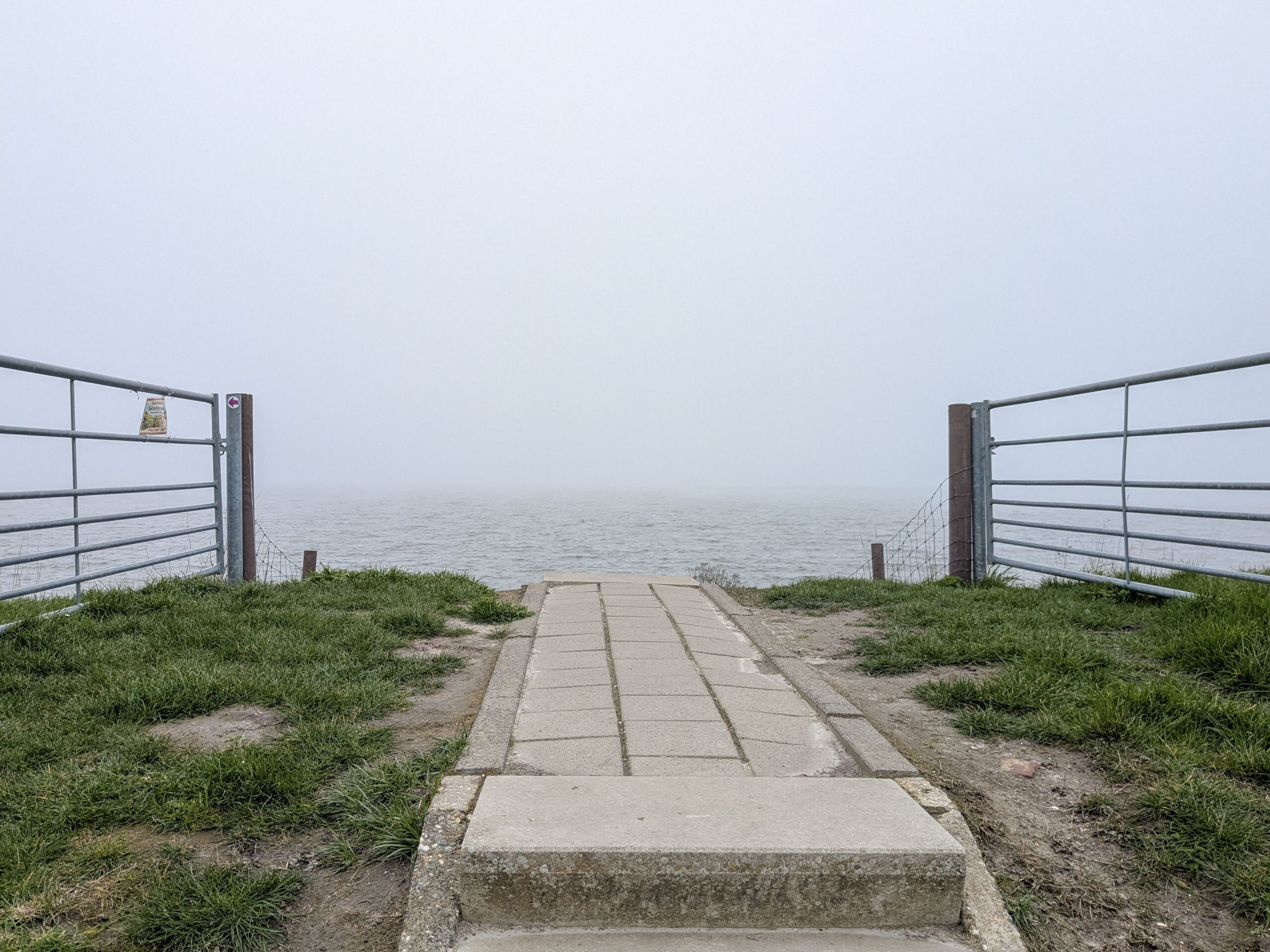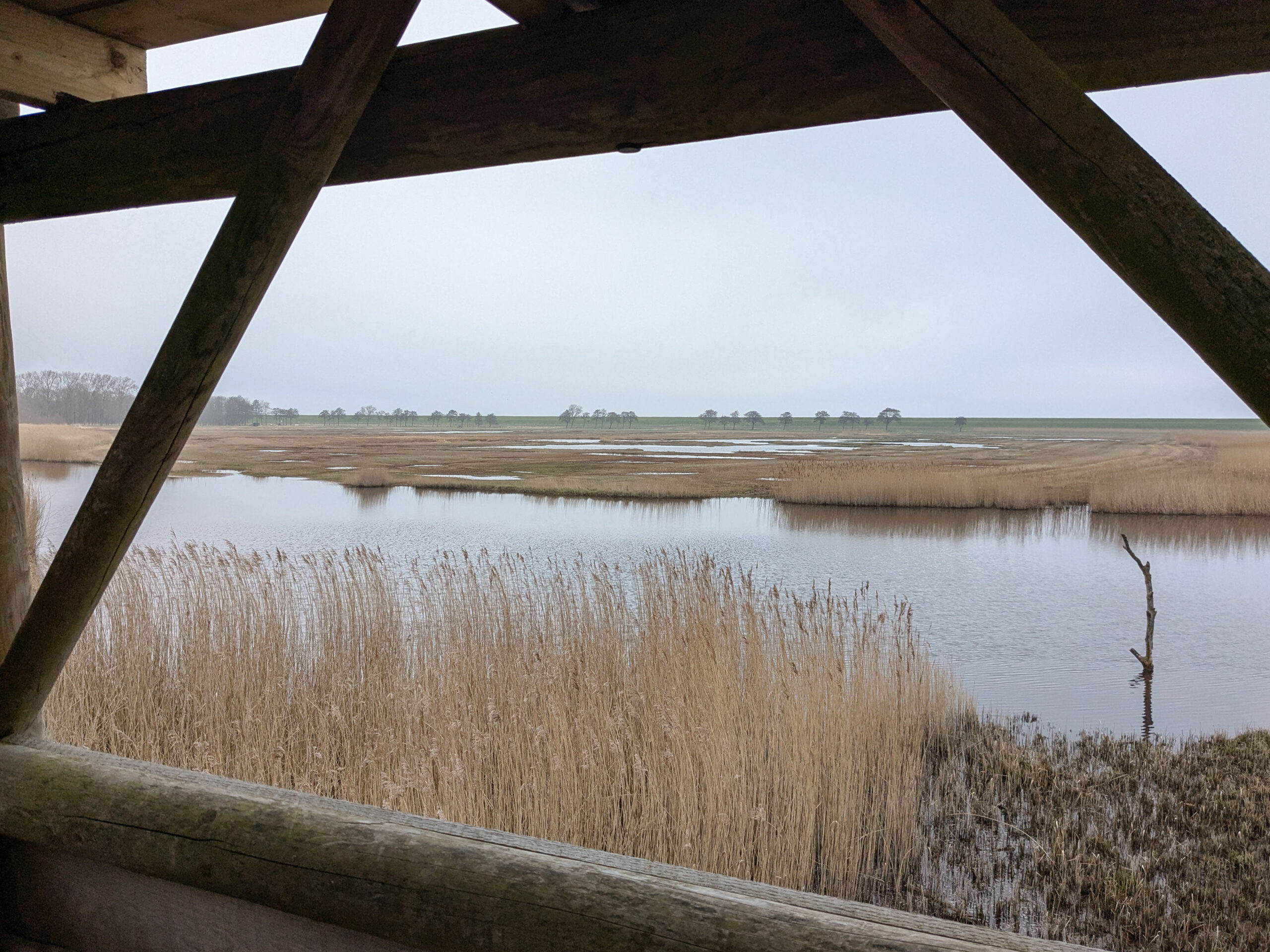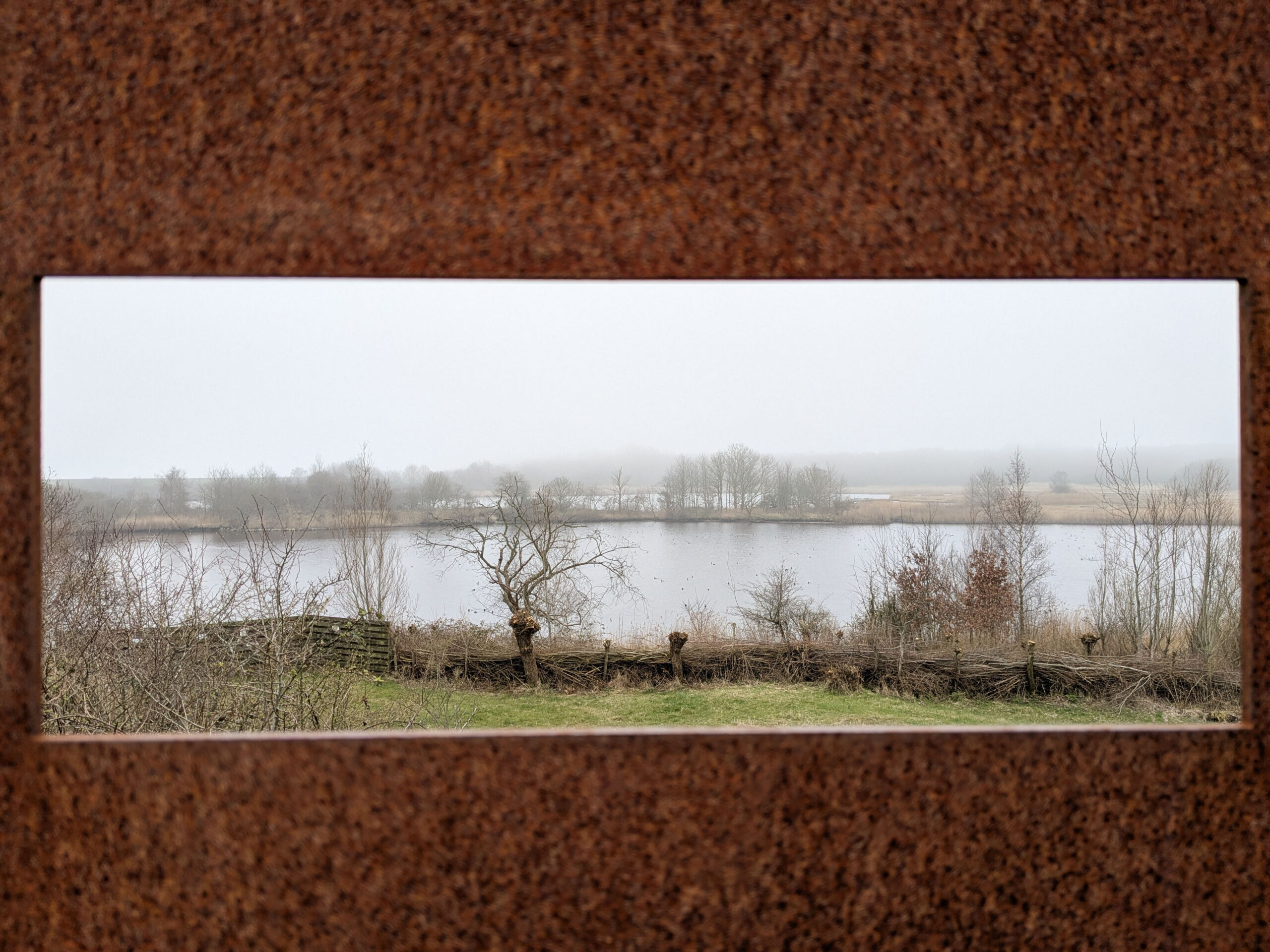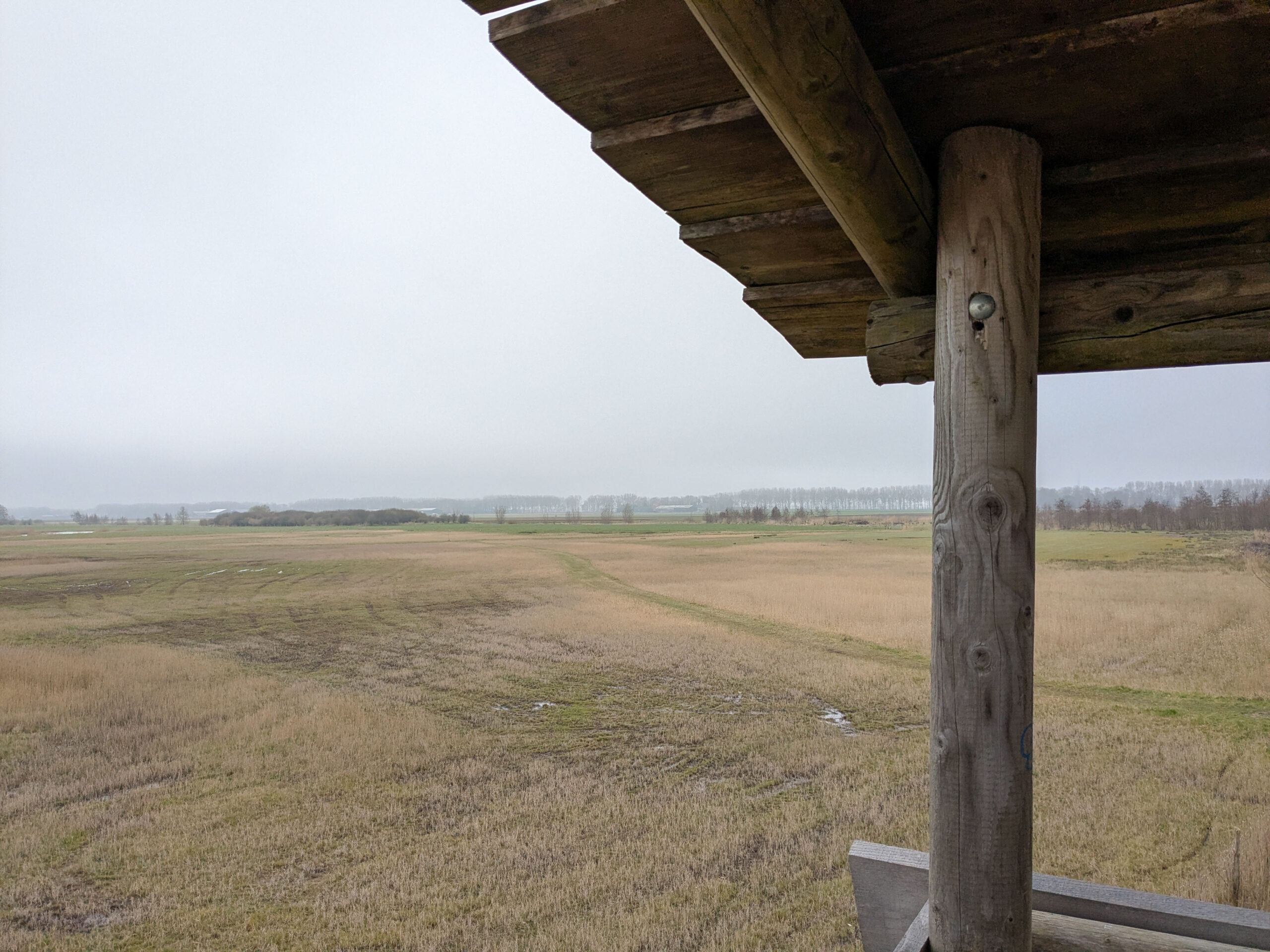 Na een paar kilometer wordt het opener, en lopen we ten hoogte van een door de mist onzichtbare zendmast een natuurgebied bij de Dijkgatsweide in. Een waterrijk gebied waarin vele vogels rondfladderen, in de plassen, bij het vele riet. Niet voor niets dat we verderop een uitkijktoren voor vogelaars aantreffen. Eventjes boven kijken hoor!