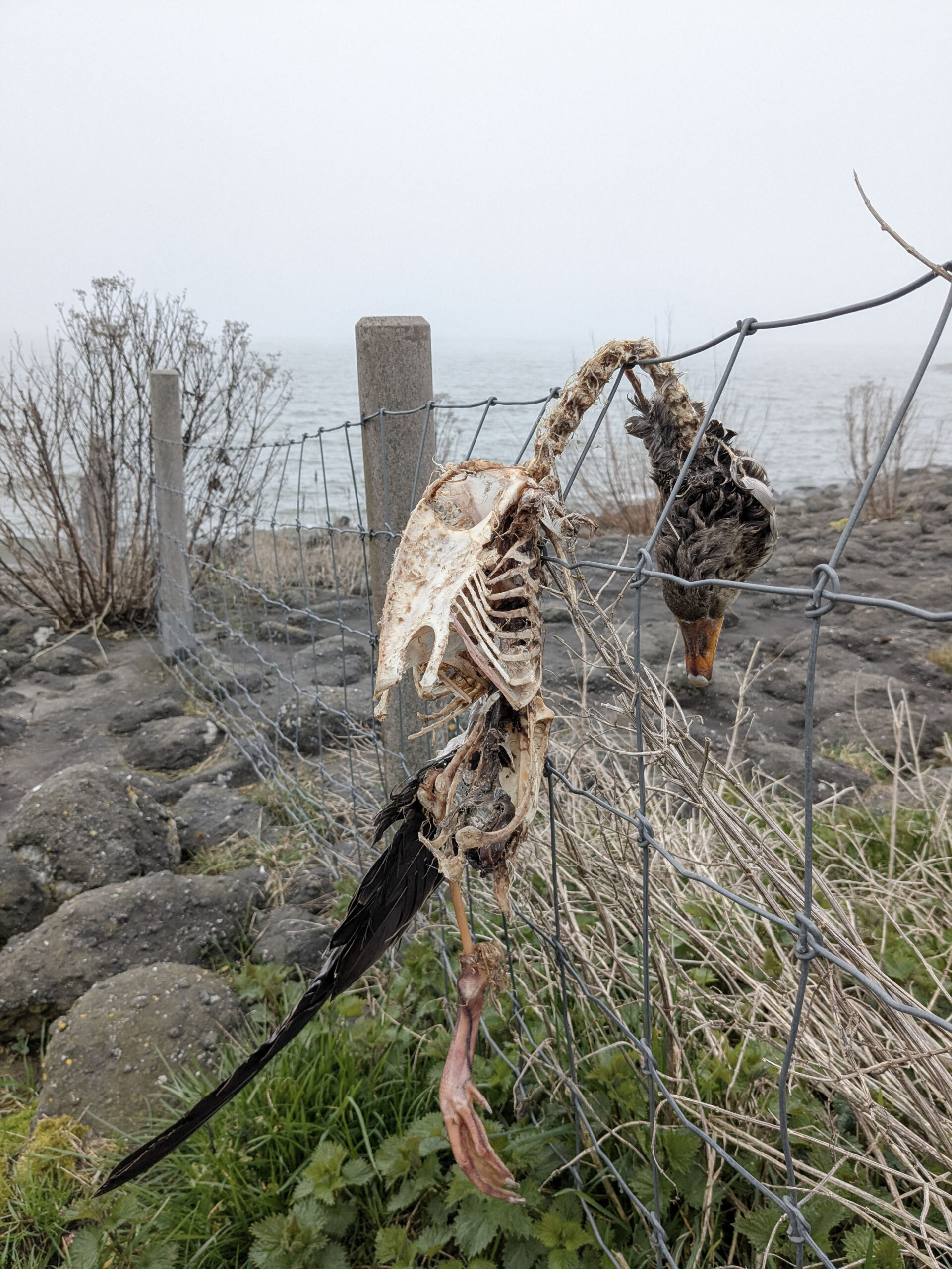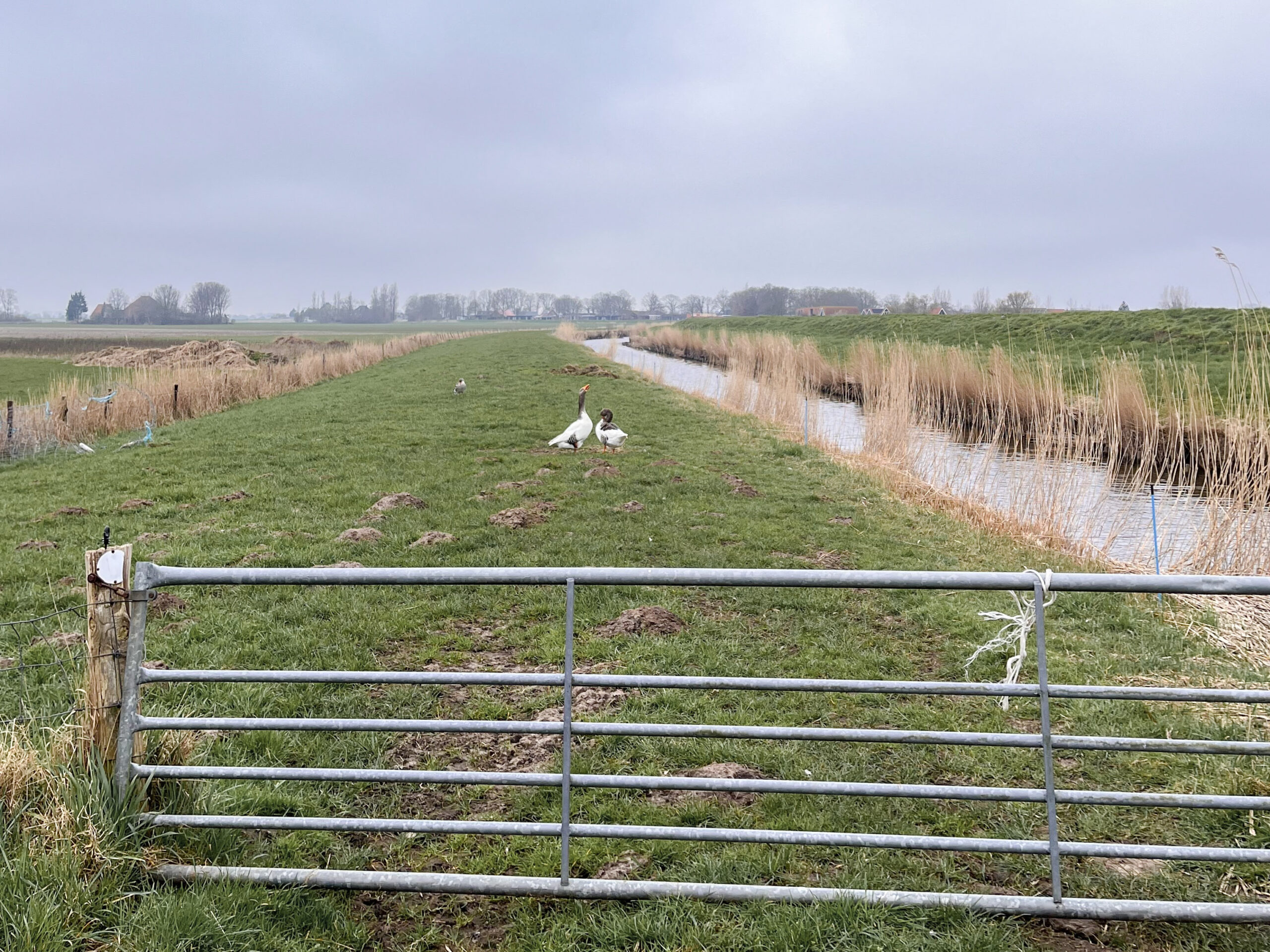 Na dit avontuur vervolgt de route zich langs een polderkanaal met aan weerzijden verhoogde dijkjes. Eerst achter een rijtje huizen langs, dan bij een stalen hek zoals we die op IJsselmeerdijk eerder zagen, en toen… een kwade briesende gans. Midden op het dijkje. Het waakse beest staat met hoog gestrekte hals duidelijk te maken dat dichterbij komen geen optie is. We checken de optie of we er links omheen kunnen. Een meter of 5-6 ruimte. Als we doorstappen dan redden we dat misschien. Maar nog voordat we dat idee in werking kunnen zetten duikt de gans met zijn kop in onze richting en komt luidkeels briesend op ons af gestormd. W00t! We trekken ons snel terug achter het hek en nemen verdere afstand. Deze dude gaat ons er zekerteweten niet langs laten. Bij de illegale oversteek van het bouwterrein zojuist, dachten we een omleiding te besparen, maar deze gepikeerde vogel respecterende besluiten we toch maar om te lopen via de weg.