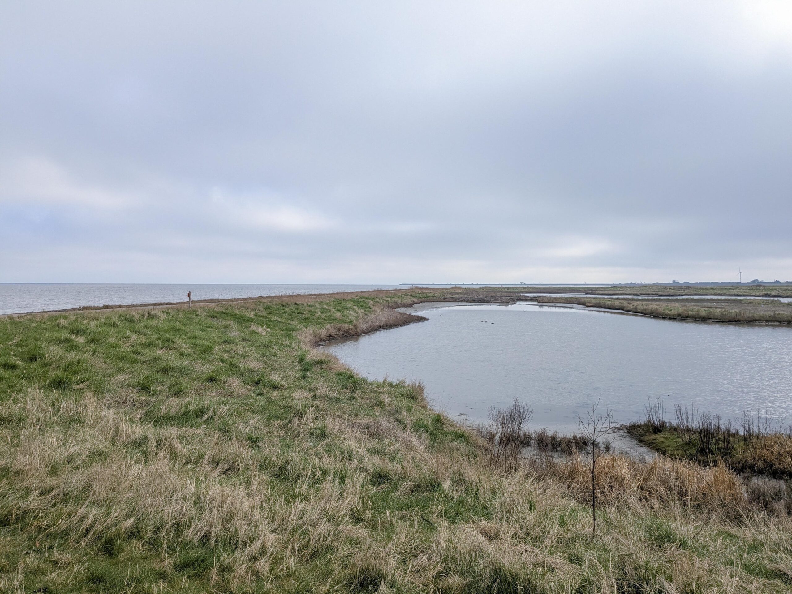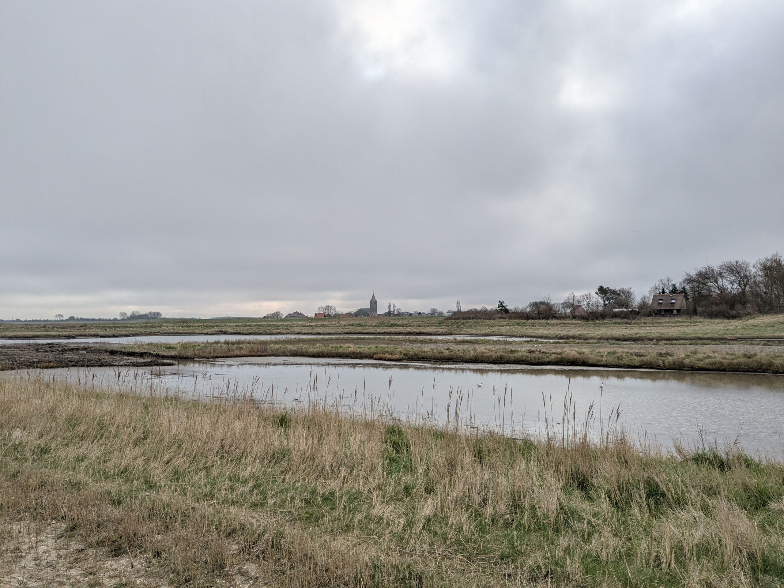 De route wijst ons vanaf de kerk westwaarts het dorp uit, en dan direct noordelijk richting de zeedijk die hier op slechts een paar honderd meter wandelen ligt. Via de Molgerdijk lopen we rond de Kleiput Vatrop; een binnendijkse poel waarin een hoop watervogels bivakkeren. Op dat moment begint een voorzichtig zonnetje door te breken. Dat gaat de goede kant op met het weer. De vorige wandelingen hadden we al genoeg bewolking en mist gezien. Tijd voor mooier lenteweer.