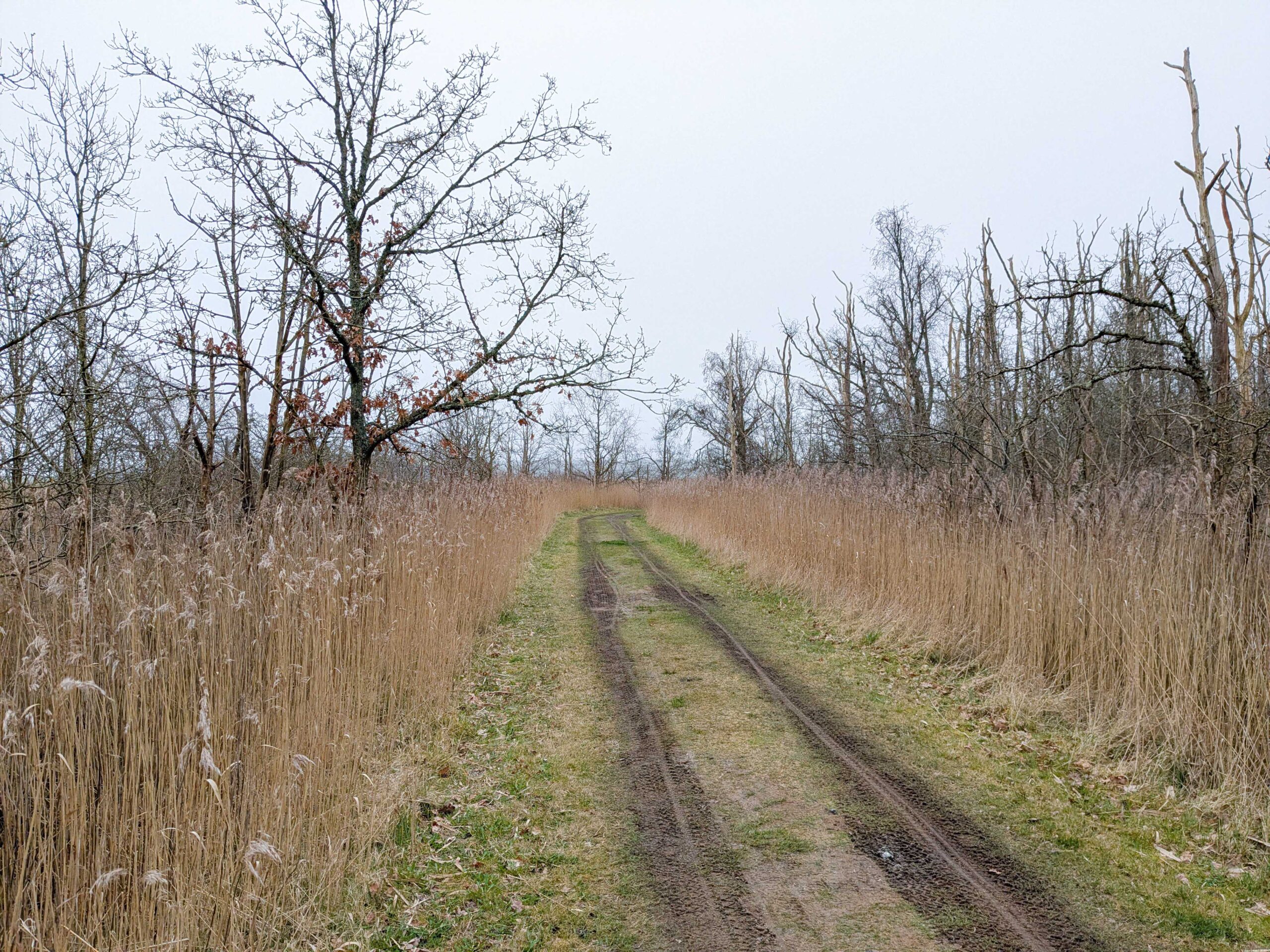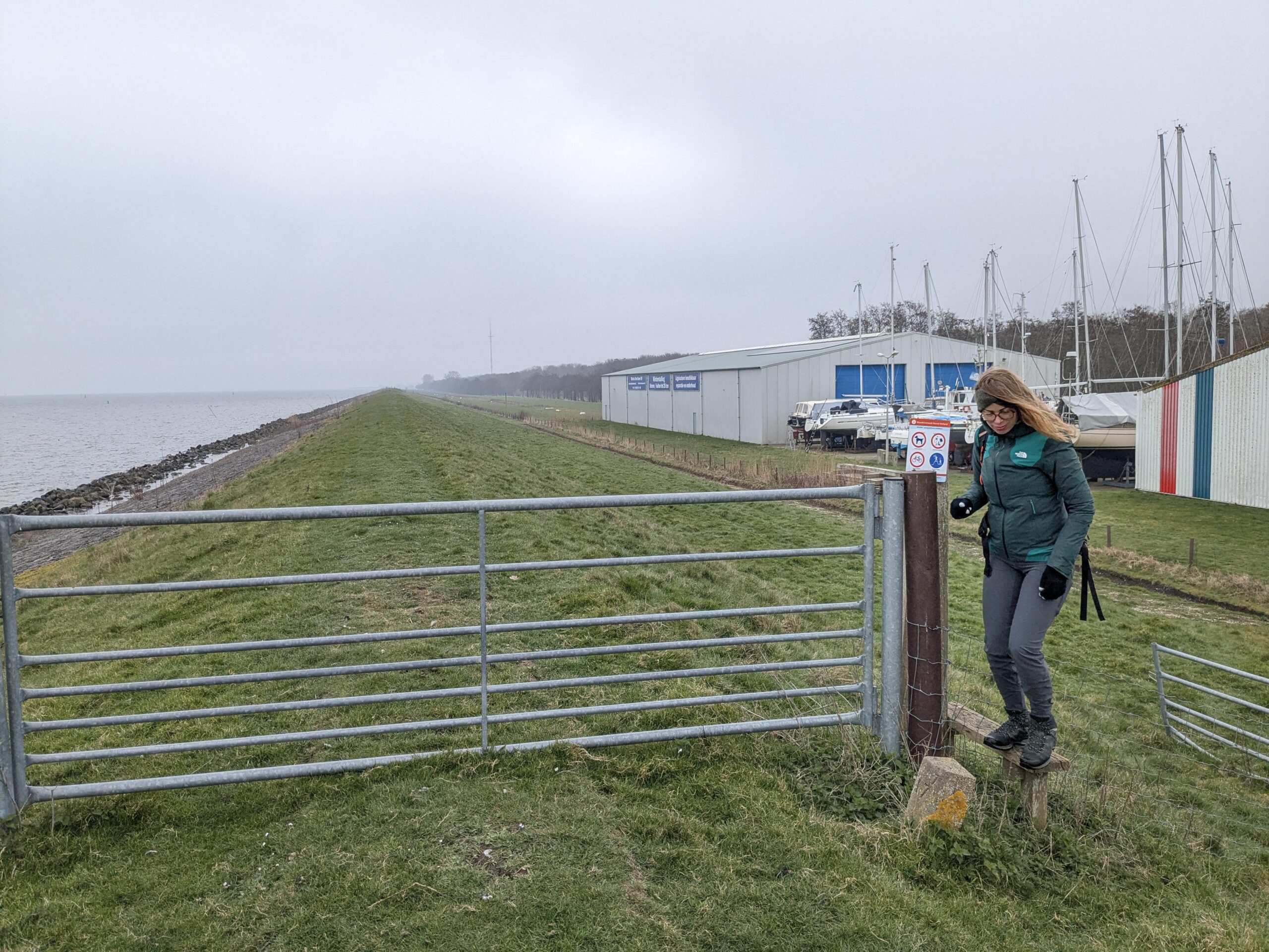 Vanwege broedseizoen mogen we sinds vorige week niet meer de oversteek maken door het gebied, en worden we geïnstrueerd om de alternatieve route met de paarse pijlen te volgen. Het is maar goed dat we de route op GPS mee hebben, want de paarse pijlen zijn we al gauw kwijt. Net als andere paaltjes van het wandelnetwerk die meer dan regelmatig ontbreken. Na opnieuw een stukje bos komen we aan bij de IJsselmeerdijk. Hier bezoeken we kort een uitzichtpunt met informatie over het “Gat in de dijk”. Hier is in oorlogstijd de dijk richting de Wieringermeerpolder opgeblazen. Later is deze locatie omgebouwd tot vogelreservaat, waar je vanaf dit uitzichtpunt een mooi overzicht hebt.
