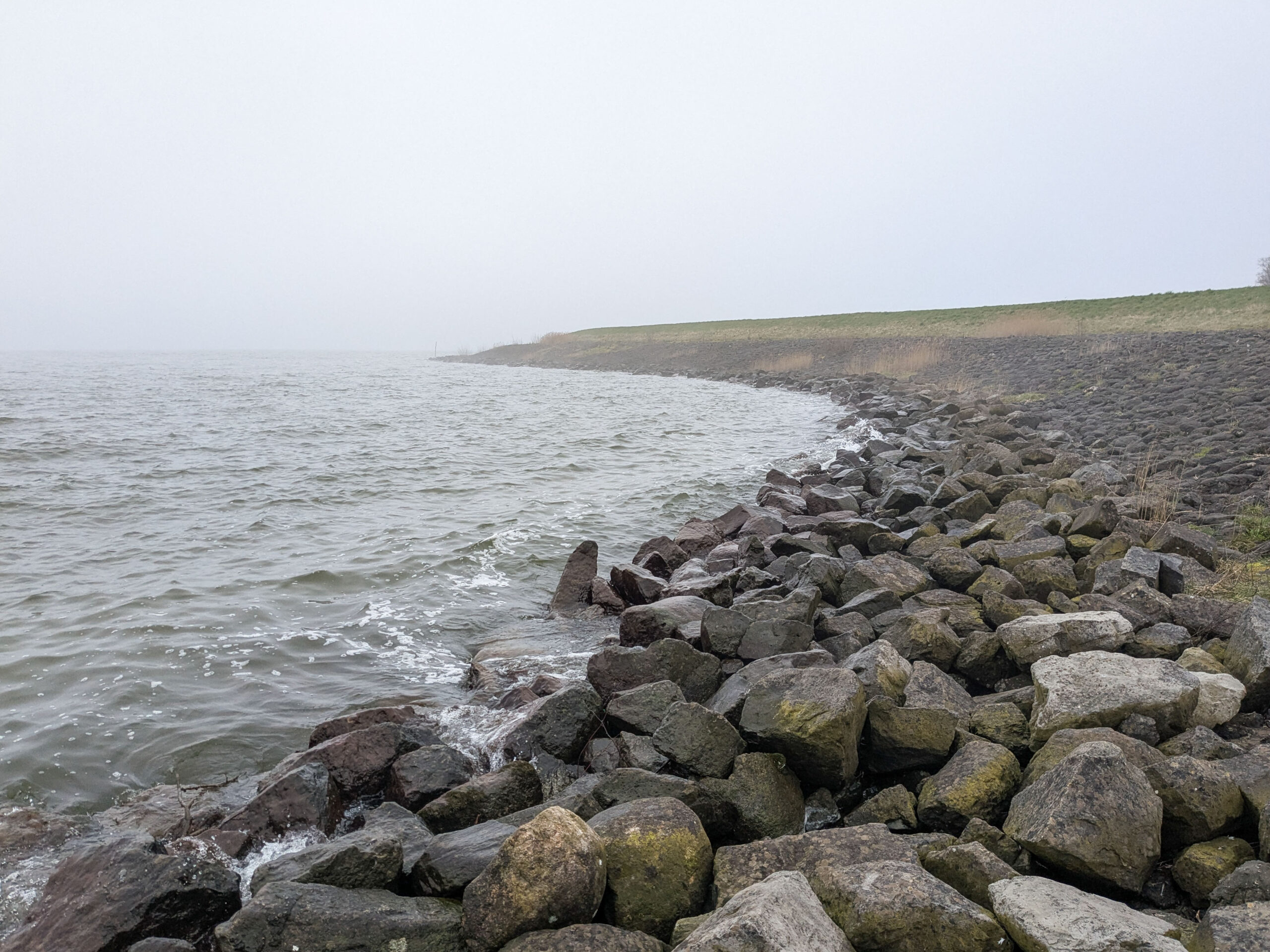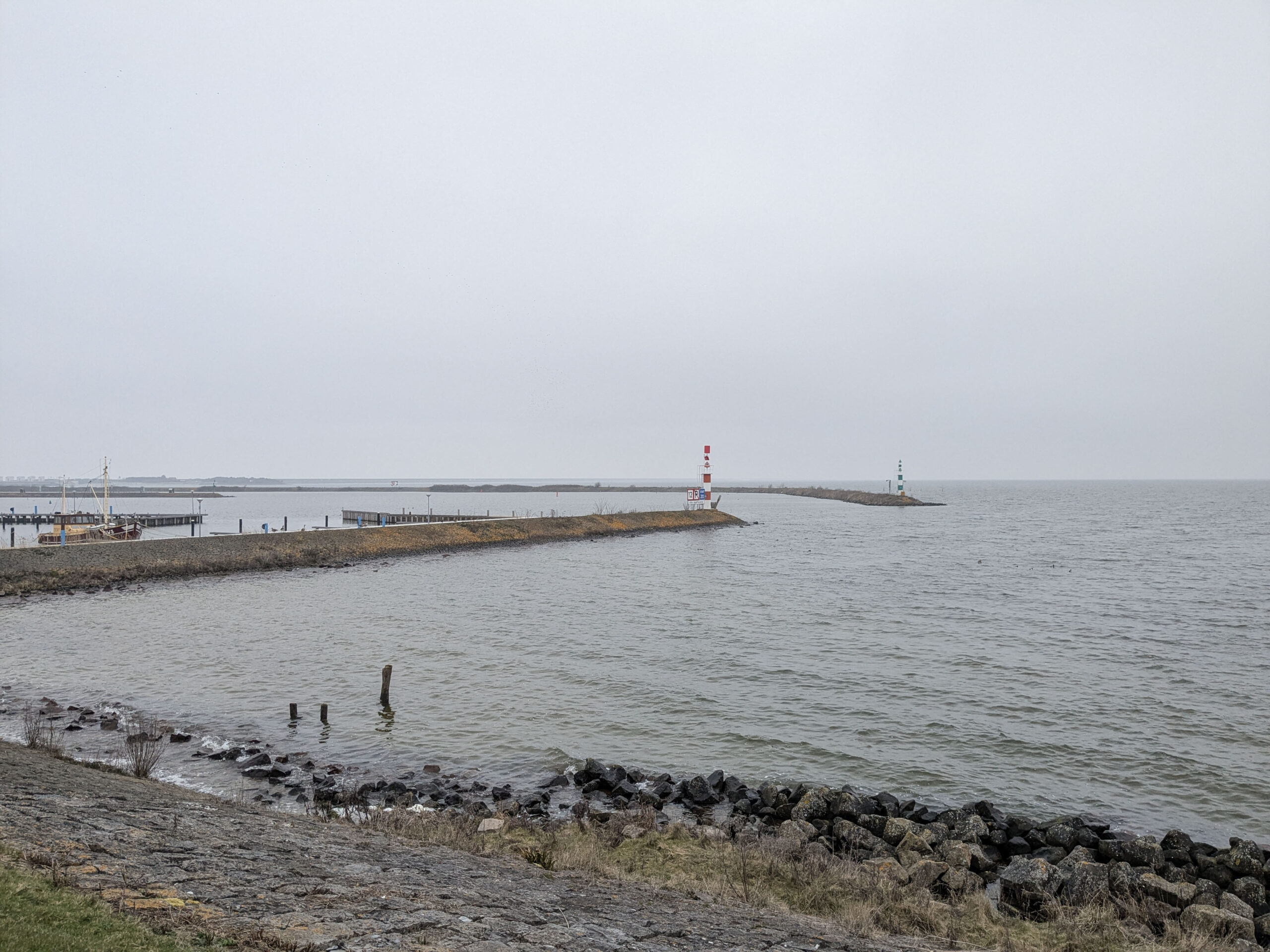 Dan komt de haven van Den Oever in beeld. De zeedijk gaat hier over in een recent vernieuwde kade inclusief grote sluisdeuren die het dorp moeten beschermen in tijden van hoog water. Langs de haventerreinen met loodsen en vissersboten komen we aan bij een fietserstunnel onder de snelweg A7 door, net voorbij de het sluizencomplex van de Afsluitdijk. Hier zijn we al talloze keren overheen gereden met de auto, vanuit Friesland naar bijv. Amsterdam, Hoorn of Alkmaar, maar nooit eerder liepen we hier. We komen aan aan de kant van het IJsselmeer.