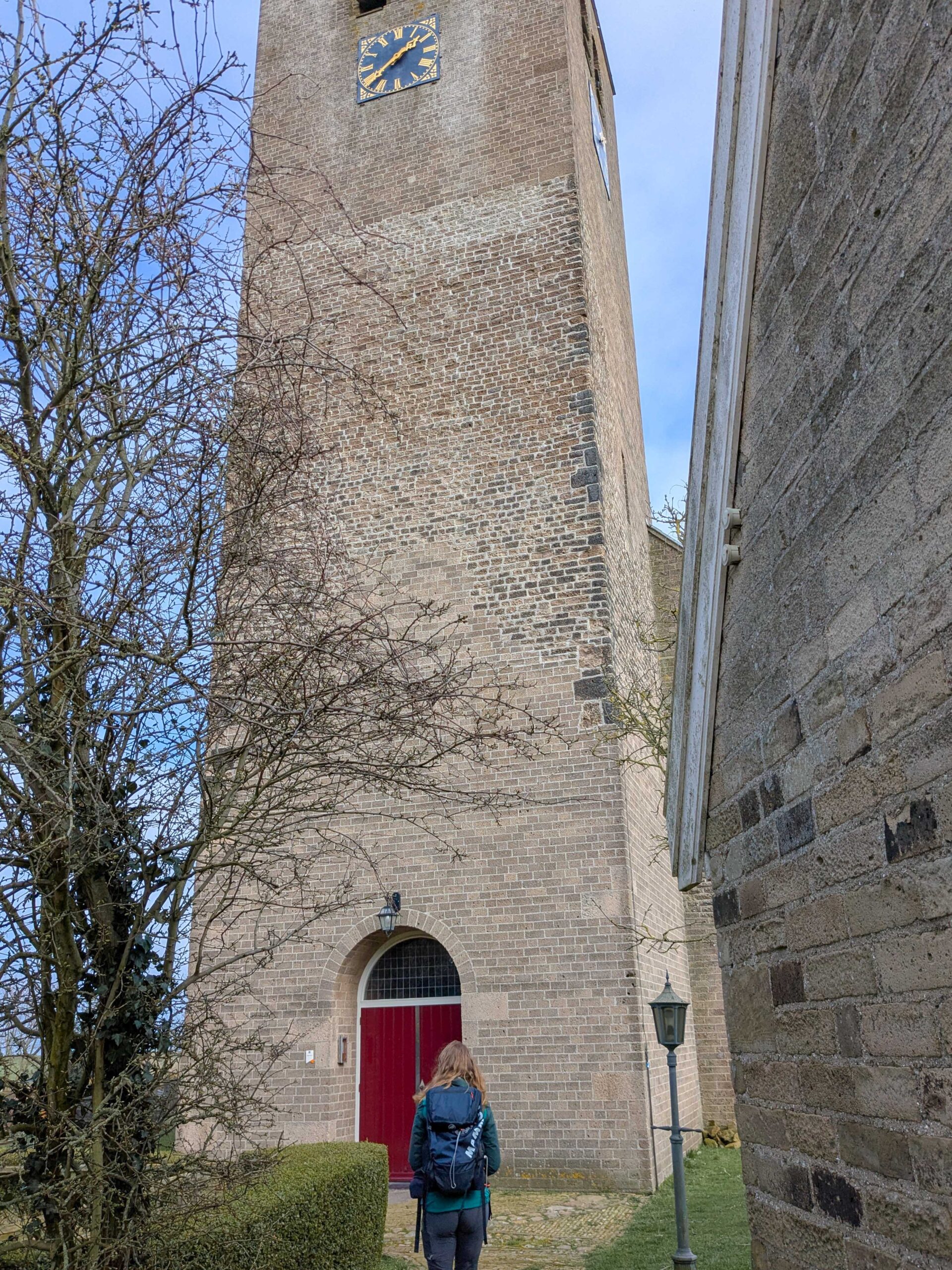 Met een paar honderd meter omlopen komen we aan ter hoogte van restaurant De Zingende Wielen. Aan de opzet te zien een soort truckerscafé, hier aan de N99 tussen Den Oever en Den Helder. We steken de weg over en lopen het laatste stukje naar Oosterland. De eindlocatie van deze etappe is bij de Michaëlskerk. Het terrein ziet er netjes onderhouden uit, evenals het kerkgebouw zelf. De deur blijkt op slot, maar een klein bordje beschrijft dat we voor toegang mogen bellen met een telefoonnummer. Een aardige meneer neemt op en geeft aan direct onze kant op de komen.