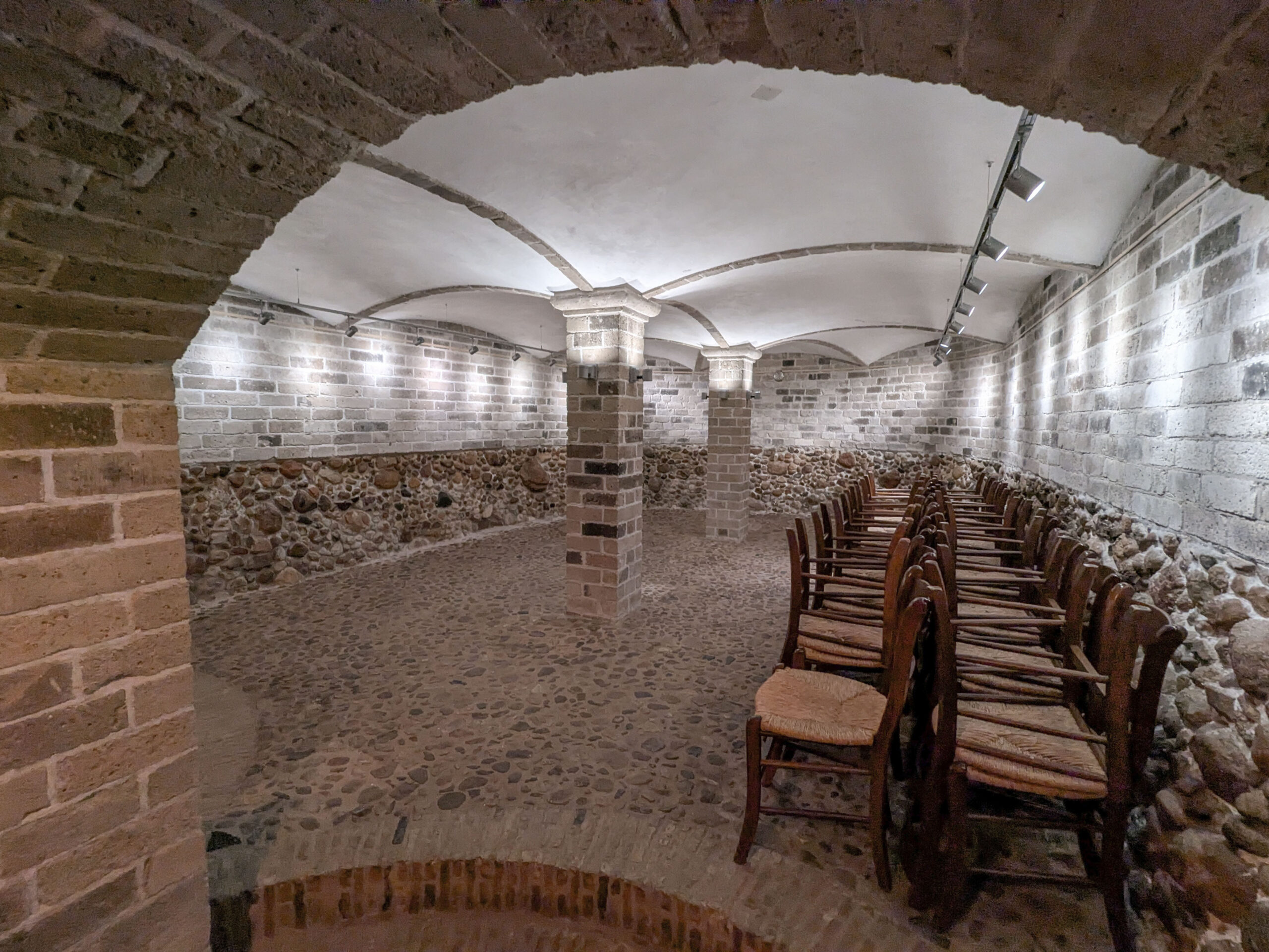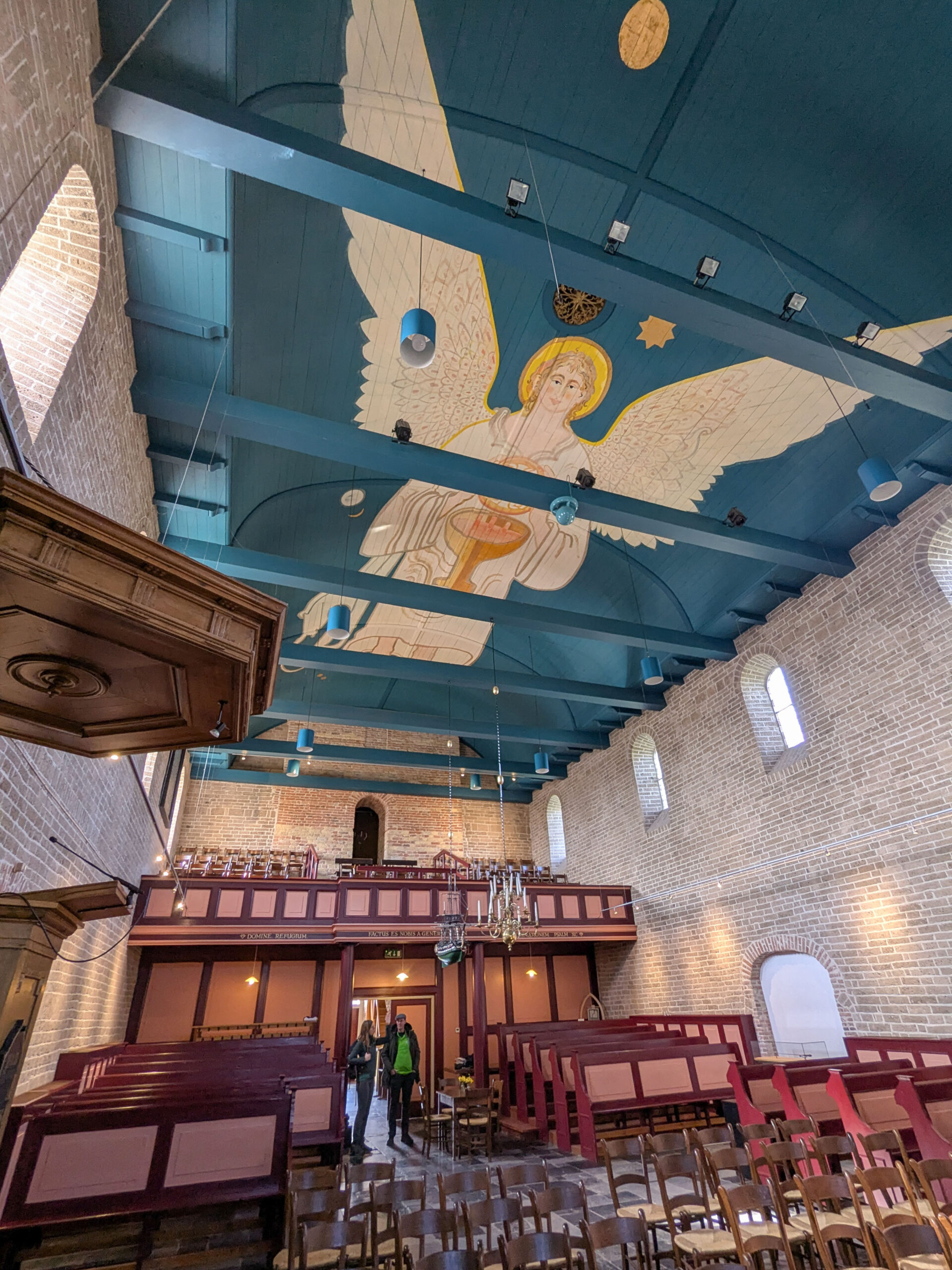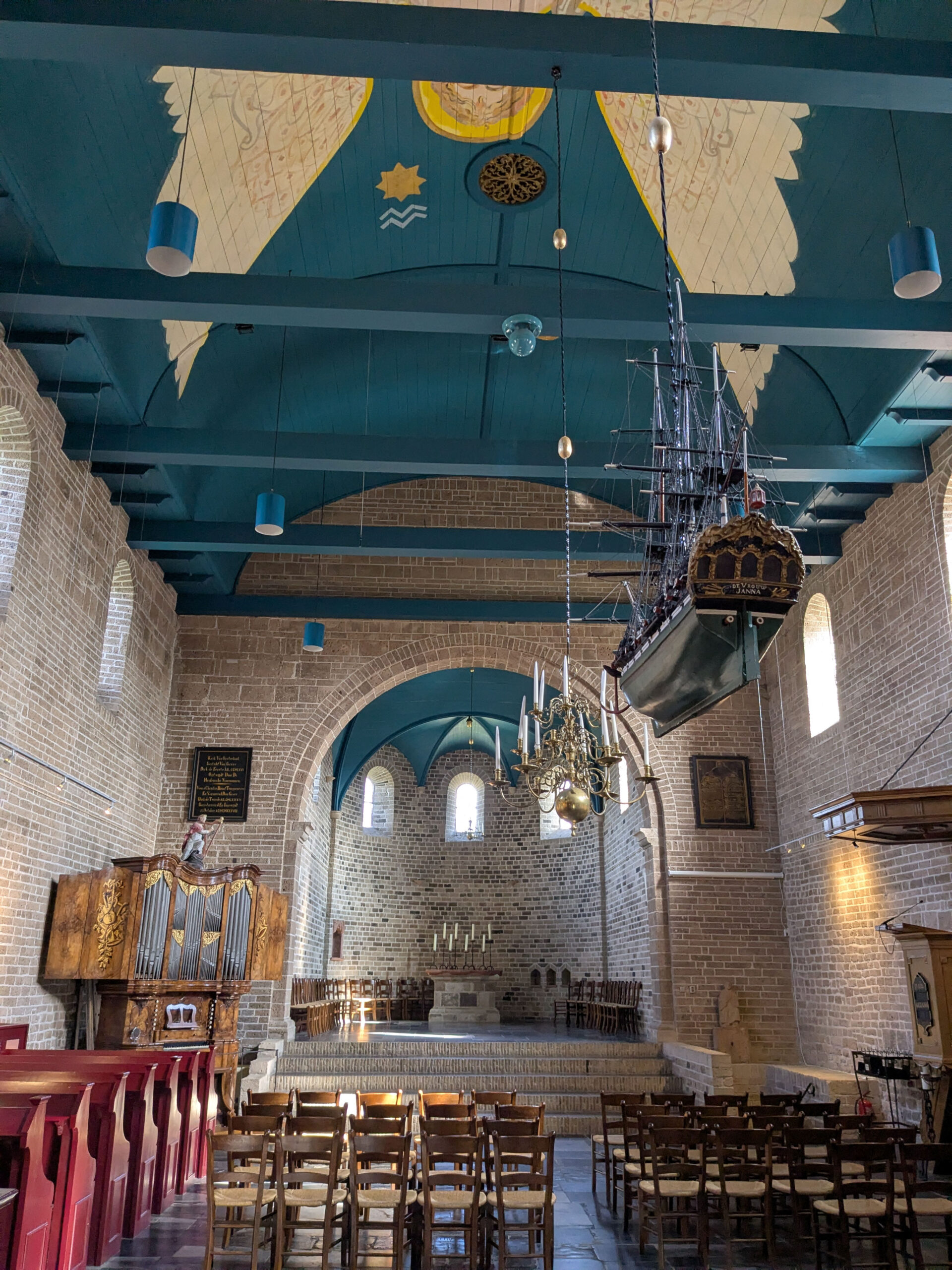 Een paar minuten later komt een vrolijke meneer ons de toegang tot de kerk verschaffen. We krijgen de stempel voor etappe 7 bijgezet, en mogen de kerk bezichtigen. Hij was natuurlijk niet voor niets gekomen, verzekerde hij ons. Ook wijst hij ons op de opengestelde crypte die onder het koor van de kerk zit. Het trappetje af, een dik rood gordijn door, en hier zien we de vrijwel lege maar zeer netjes onderhouden crypte. Er staan een aantal oude stenen lege lijkkisten opgesteld, waarvan de geschiedenis verder onbekend is. Mogelijk ooit van welgestelde Wieringers? Of zeevaarders? Informatie ontbreekt, en verder is er hier beneden niet veel te zien.