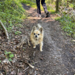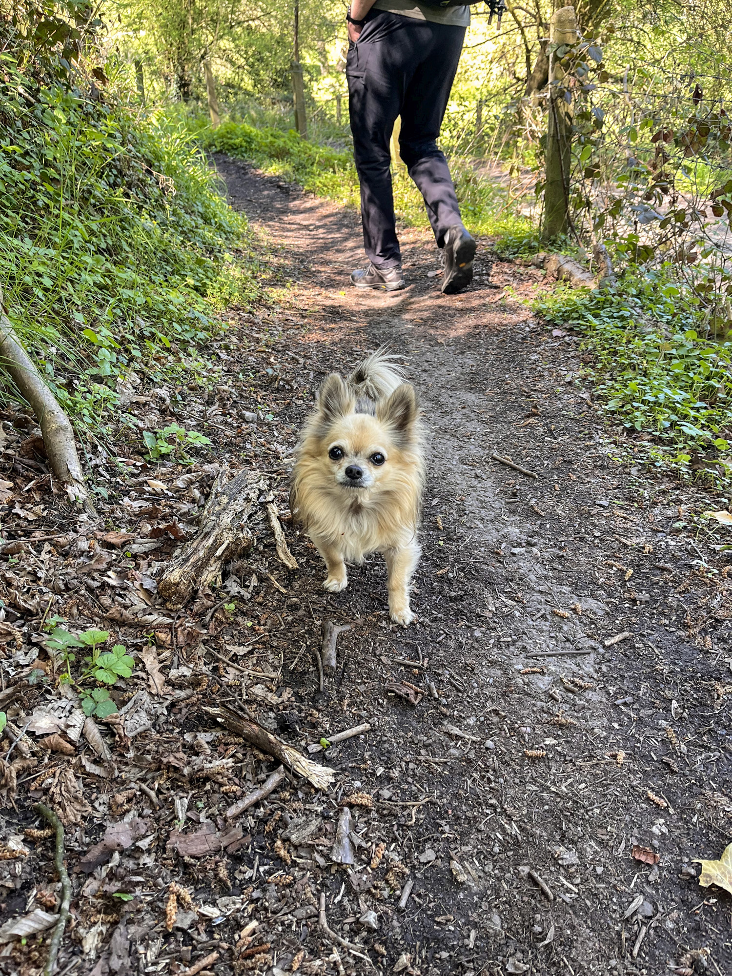 Dan slaat het pad met een scherpe bocht af naar rechts. Van de asfaltweg af, een smal wandelpaadje in. Nog geen 100 meter verder komt er een heel klein keffend hondje om ons heen dartelen. Geen baasje te zien. Waar zou die bij horen? Baudien vind het zielig voor het beestje en besluit terug te lopen naar de huizen bij de asfaltweg. Ondanks alle pogingen wordt er bij geen van de woningen gehoor gegeven. Dan zal het wel goed zijn. We laten het piepende beestje achter en lopen verder.