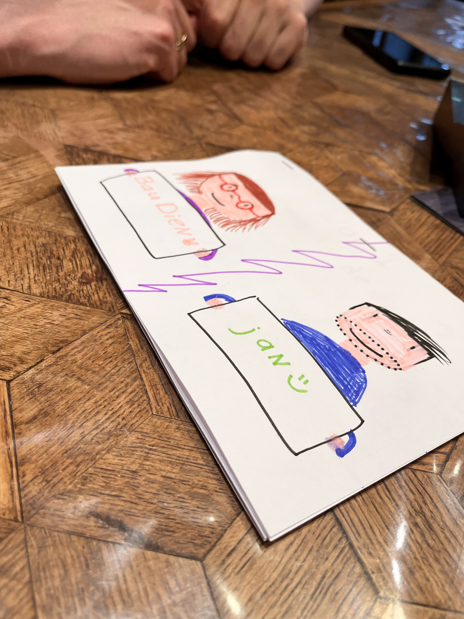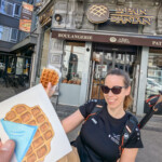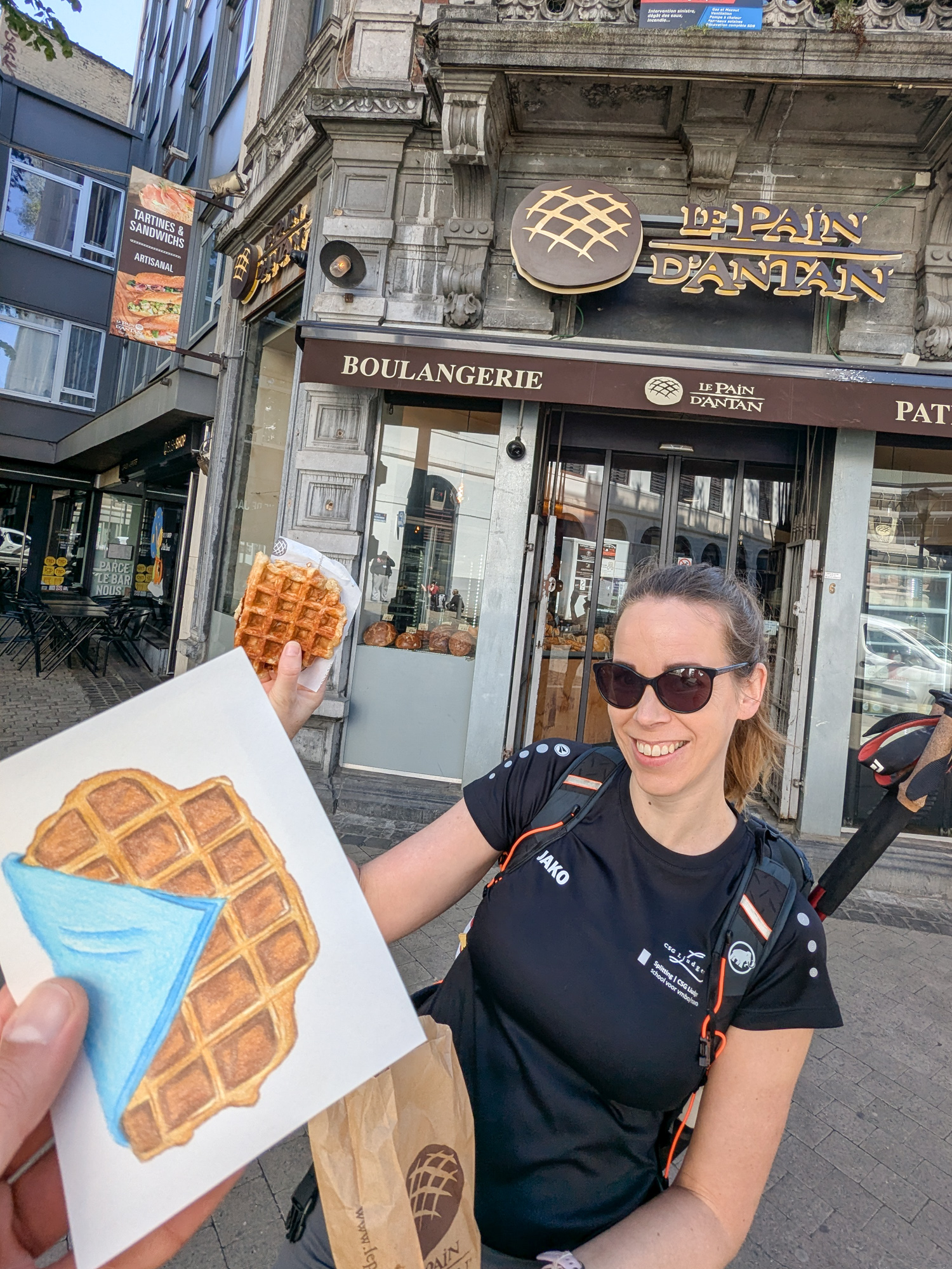 In haar opmerkelijk goede Duolingo-Frans bestelt Baudien twee verse wafels. Maar voordat we die mogen opeten gaat de wandeltas nog een keertje open en pakt ze een tekening. Net als de route door Nederland maakt Baudien per wandeldag een symbolische tekening met daarbij een symbolische levensvraag. Voor de etappe vanaf Luik had ze een tekening van de Luikse wafel gemaakt. Hoe passend om dan precies hier een wafel te vinden. Lekker!