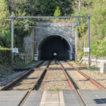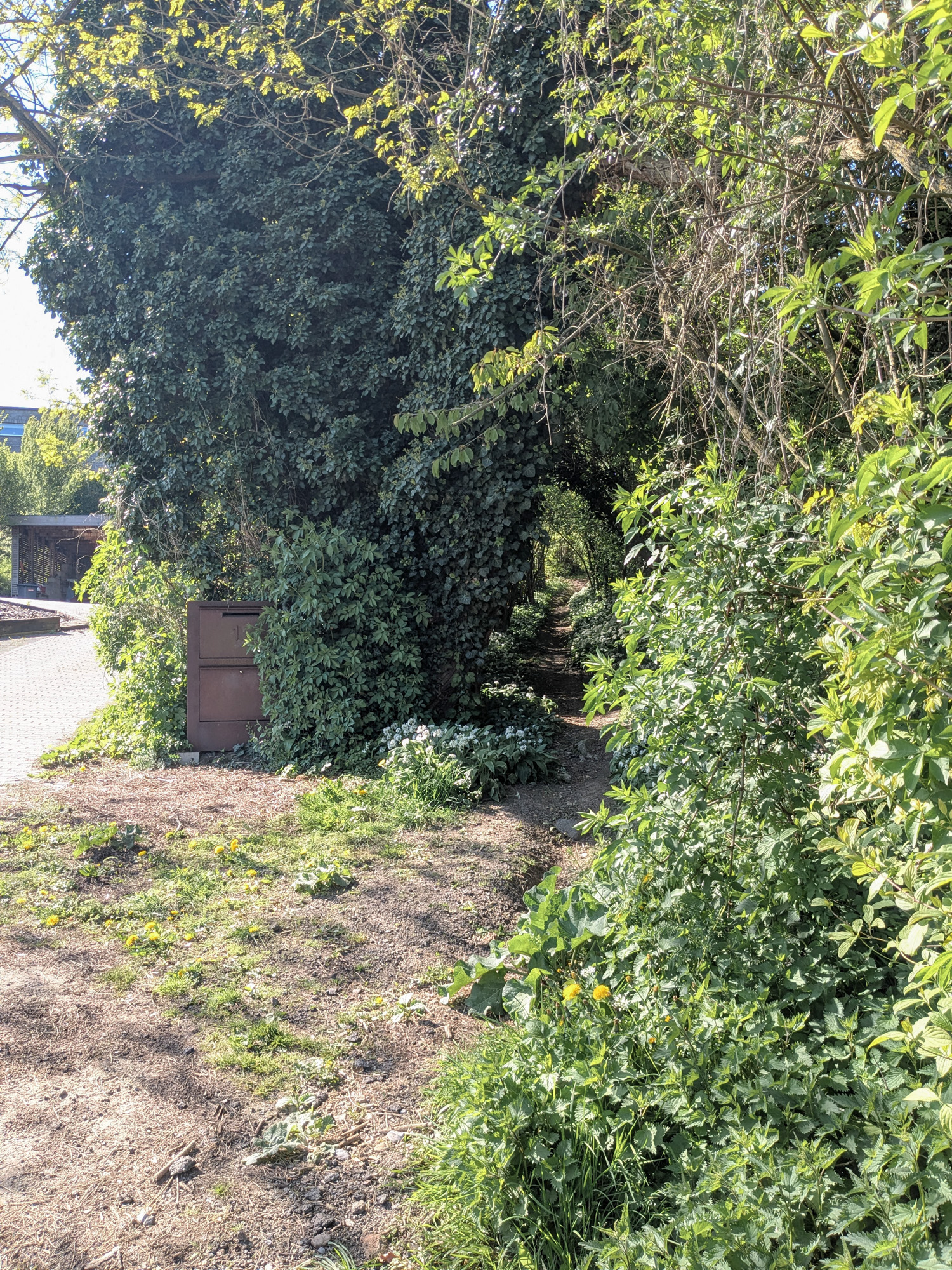 Nadat we Jorrit hebben uitgezwaaid lopen we parallel aan de snelweg een smal paadje voor de huizen langs. Voor de oplettende autorijder die wel eens richting Luik is gereden is dit het stuk net over de grens. De Maas ligt rechts van de snelweg. Een dubbel treinspoor links, en weer links daarvan een hoge betonnen muur waarop een lang lint huisjes voor de bergrand is gebouwd. Betonnen bruggen, geluidswallen en andere bouwsels geven het een wat ouderwets uiterlijk.