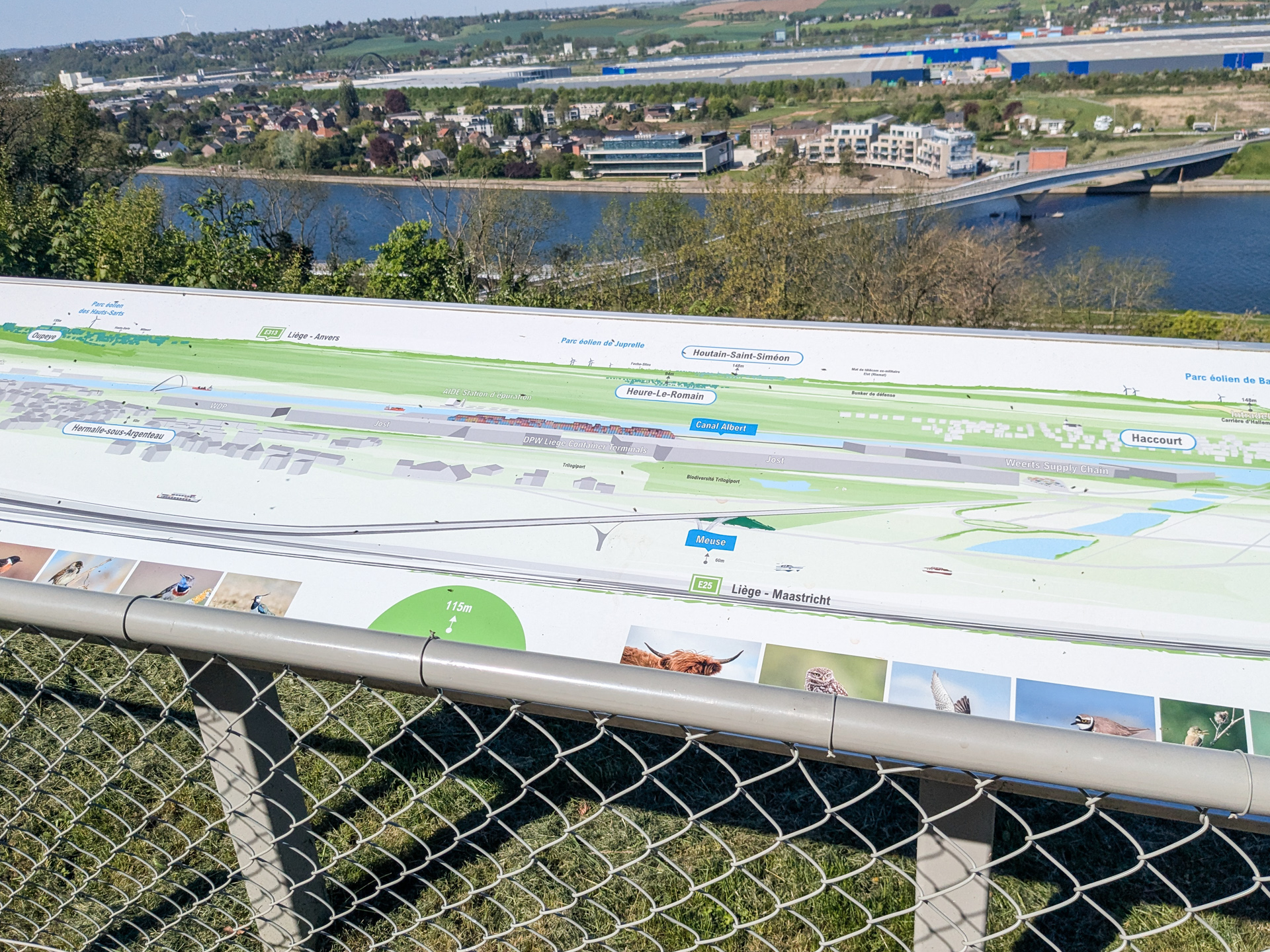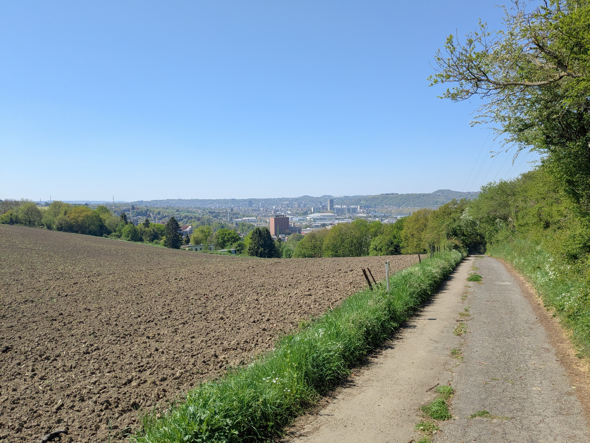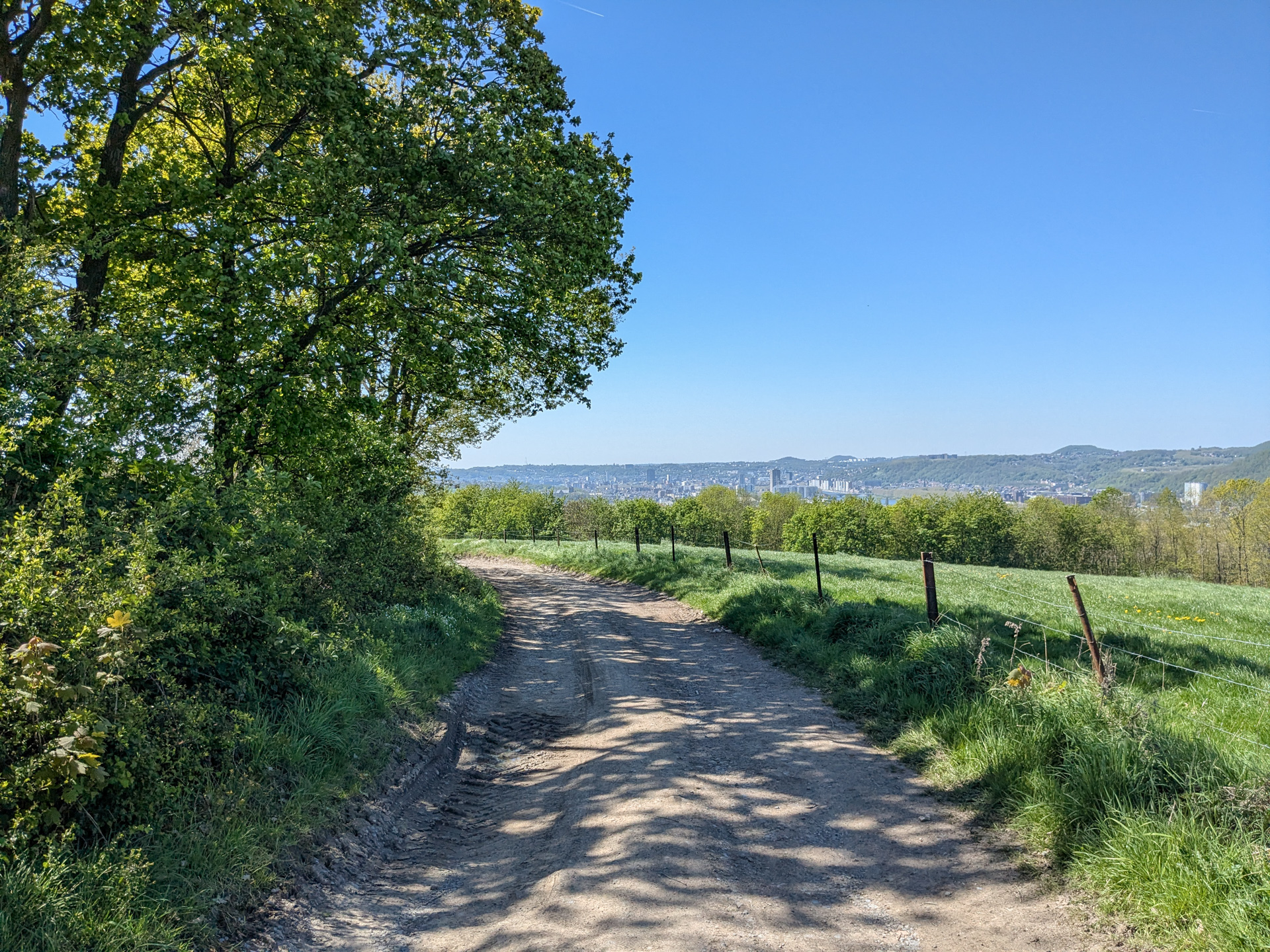Vanaf hierboven hebben we een ruim overzicht richting Luik. De bruggen over de Maas, het Citadelle ziekenhuis aan de andere kant op de berg en diverse grote woon- en werktorens. Dan krijgen we vanaf hier de steilste afdaling van de dag. Binnen een kilometer daalt de route meer dan 100 meter, en komen we aan bij Jupille-sur-Meuse aan de randen van Luik. Of Liège zoals het hier wordt genoemd.