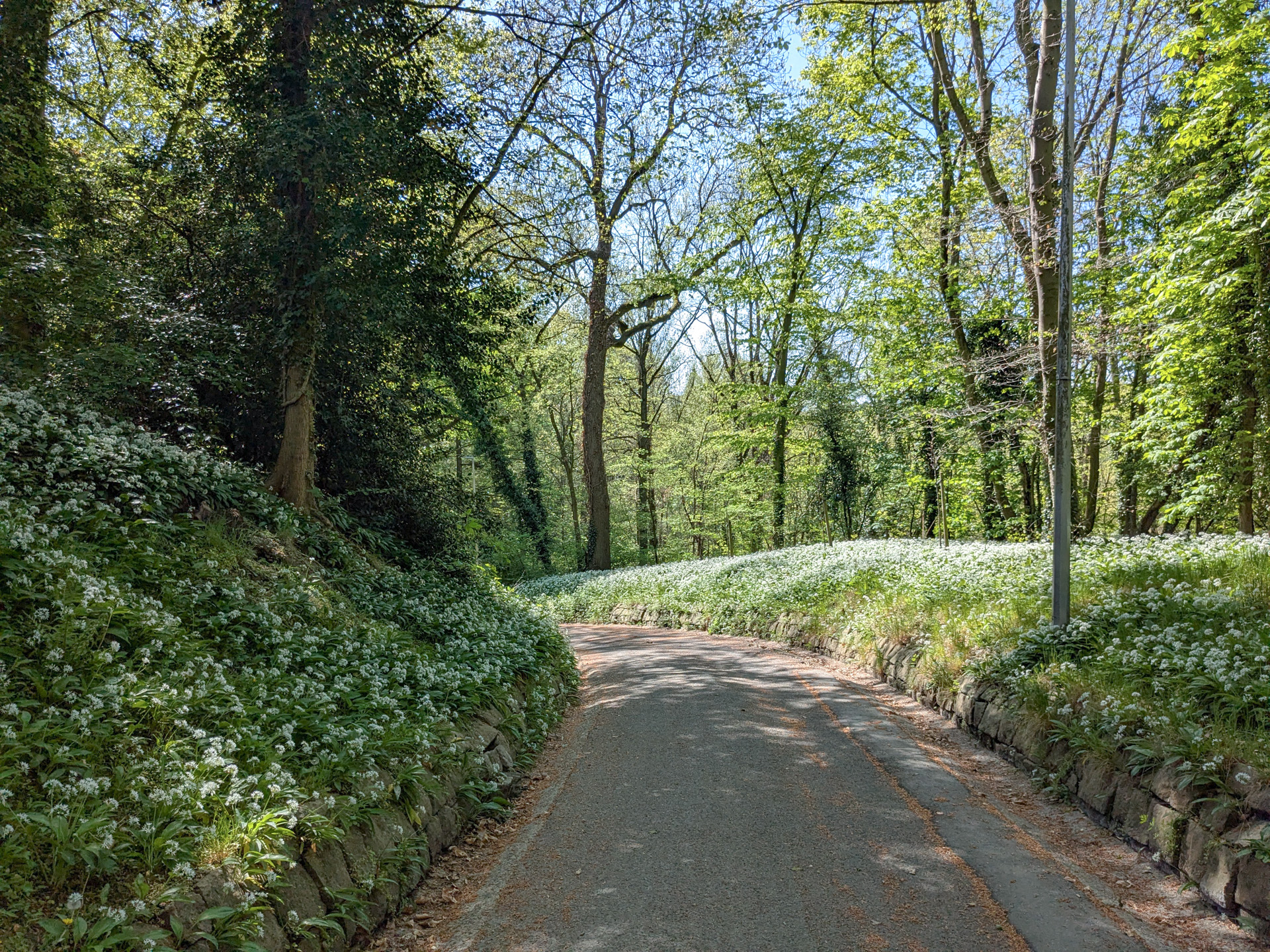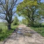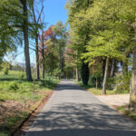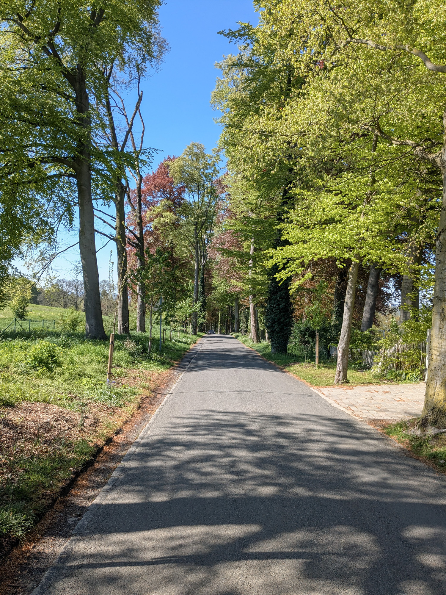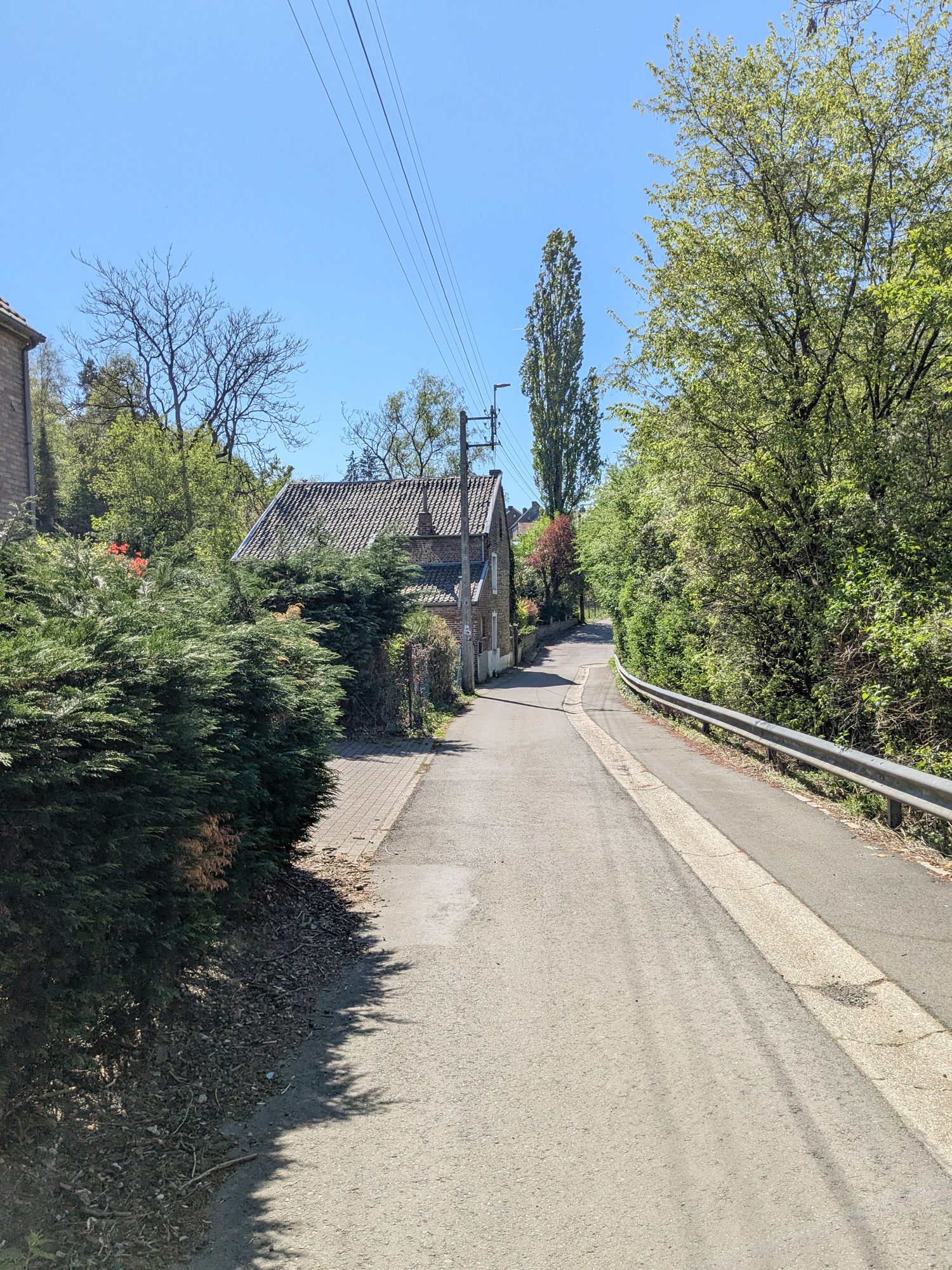 Net voorbij het dorpje Richelle komen we uit op de Rue de Wixhou. Een lokale weg vanuit het dal waar op allerlei plaatsen stapels met autobanden zijn neergezet, straatmeubilair, muurtjes, van alles is ‘beveiligd’. Het blijkt vanwege de wielerklassieker Waalse Pijl, die hier straks langs zal trekken. Die route loopt vanaf hier in 200 kilometer door de wijde omgeving via Esneux naar Huy, waar de renners een aantal keer De Muur moeten op denderen voordat ze ook daar zullen finishen. Van dit spektakel krijgen wij vandaag verder niet zoveel mee. Al hopen wij over de Jacobswegen over drie dagen op precies de zelfde plek te finishen: De Muur van Huy.