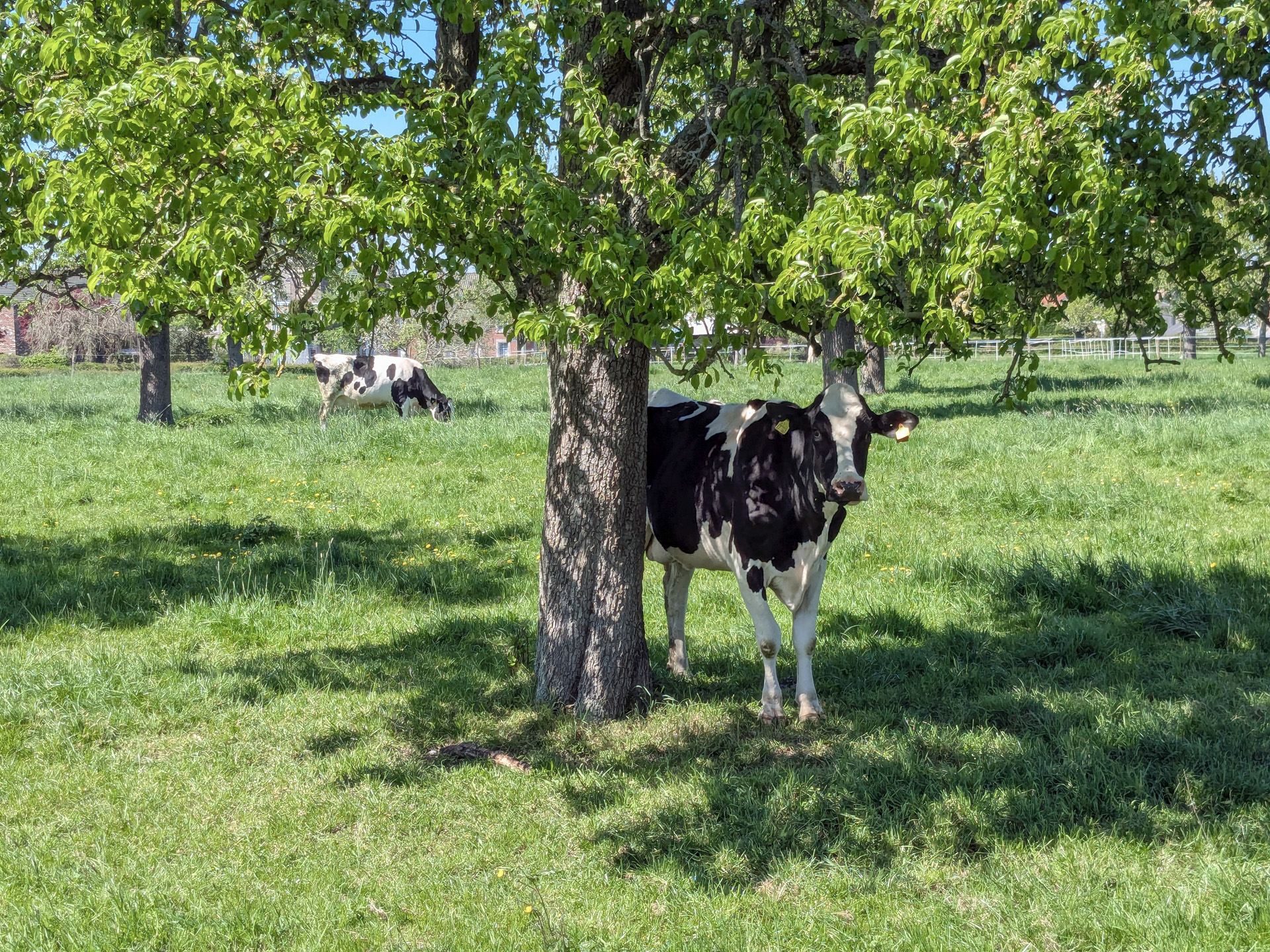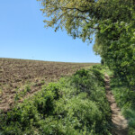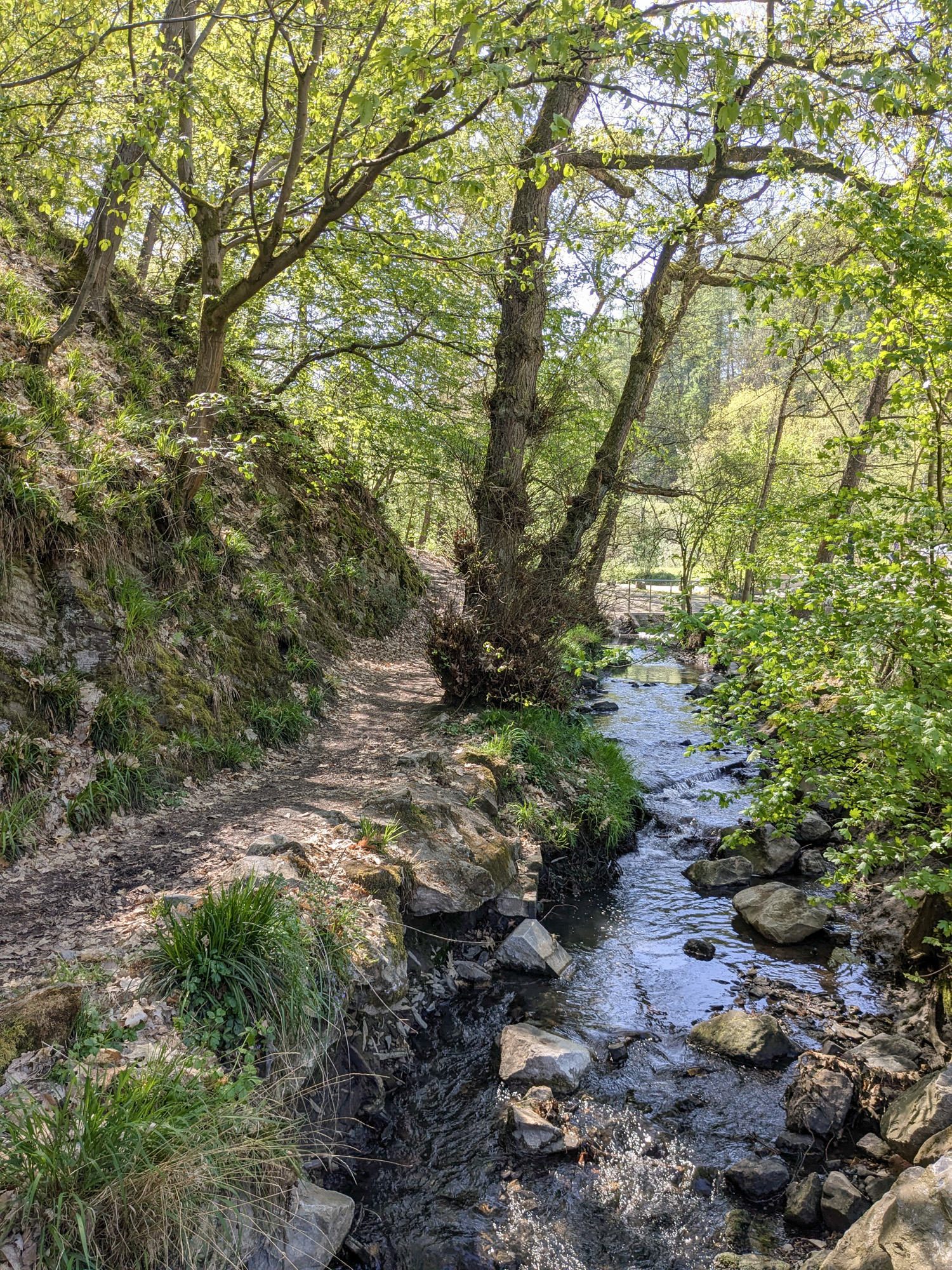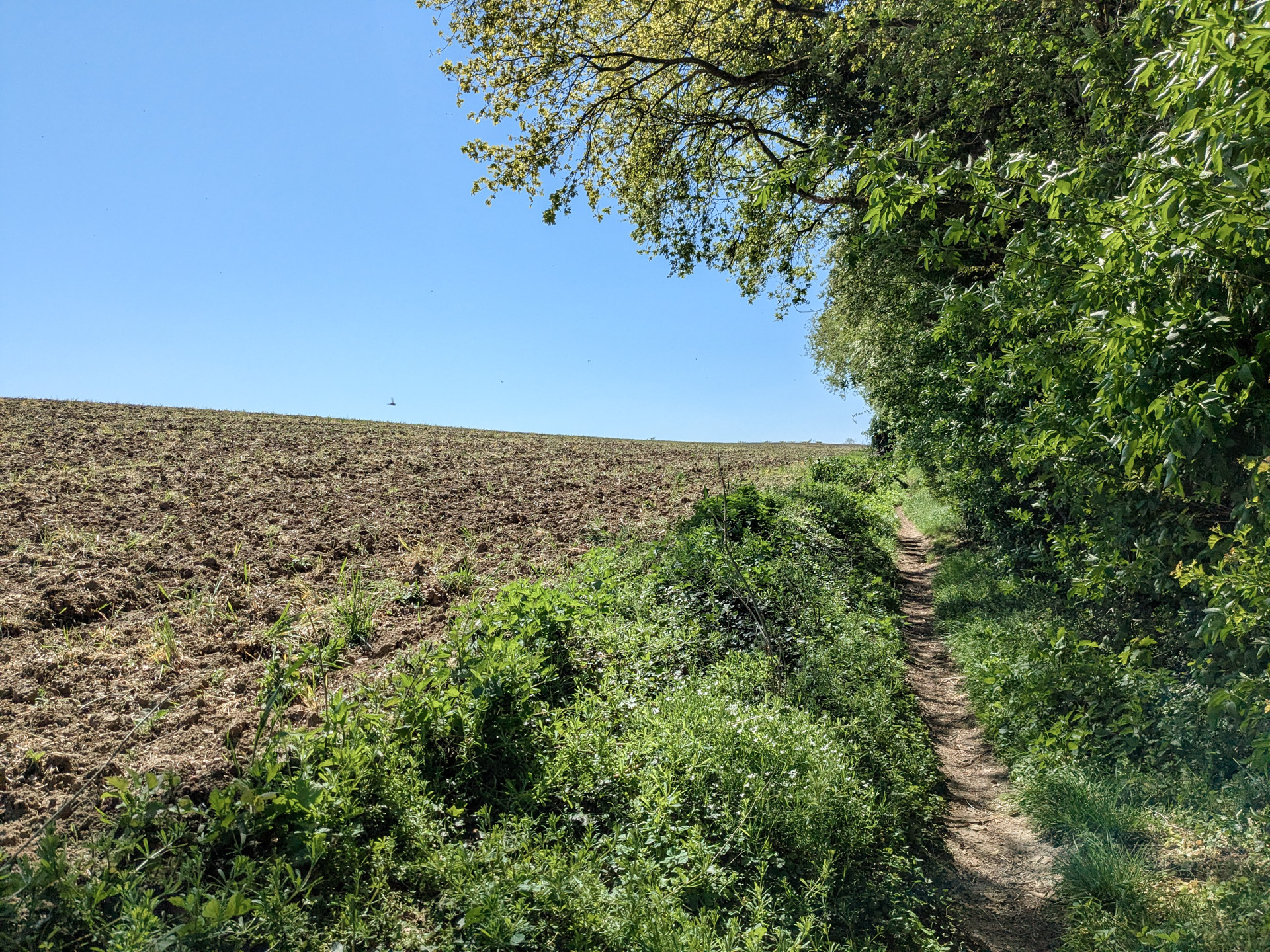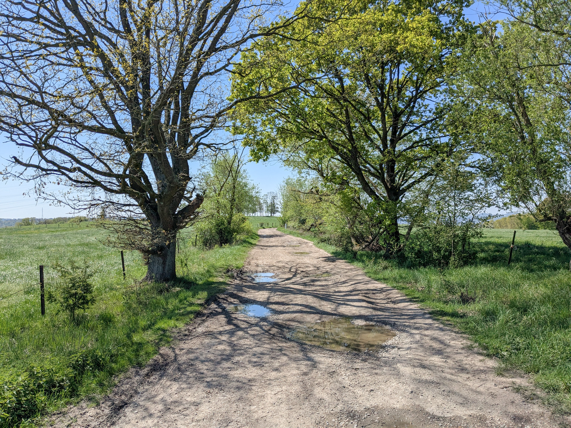 Op de landkaart kronkelen we hier door bebouwd gebied met links en rechts van ons dorpjes. Maar voor ons ziet het er bosrijk uit en hebben het idee juist door een vrij natuurlijke omgeving te lopen. Zo nu en dan volgt er een steviger klimmetje en we komen op ruim 180 meter te lopen. Daarbij trekt de wandelroute ook weer dichter bij de Maas waardoor de hoogteverschillen met het dal nog duidelijker worden.