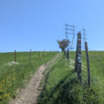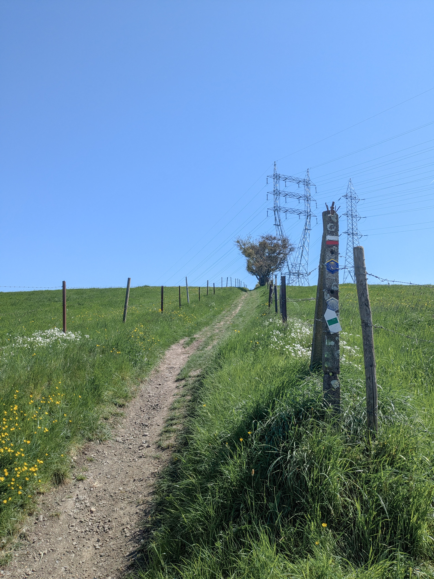 Precies op de helft van de wandelroute van vandaag zien we voor ons het weggetje naar beneden duiken. Maar de Jacobsstickers geven aan dat we linksaf nog iets verder de berg op moeten via een smal pad dat aan weerzijden is afgekaderd door prikkeldraad. Vlak voordat we helemaal boven zijn schrikken we nog even op van een meneer met twee honden. De meneer zit genoeglijk op een bankje in de zon, maar één van zijn hondjes, de felste, luistert niet direct: “Jimmy, non! Non!“. Luid blaffend laat het beestje weten niet gediend te zijn van onze aanwezigheid. Gelukkig voor ons zit hij aan de andere kant van het prikkeldraad en kunnen wij een soort van veilig passeren.