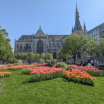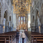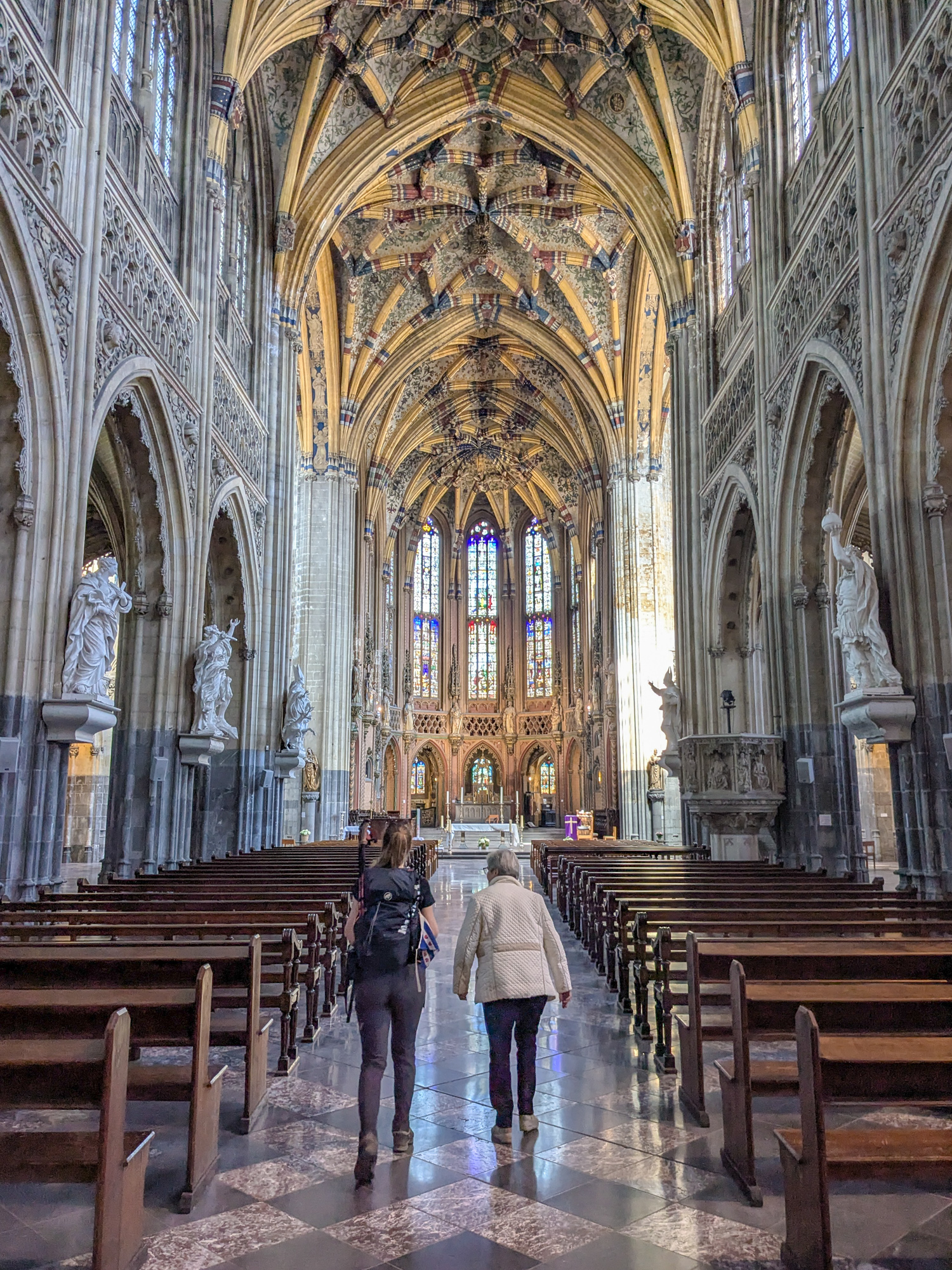 We lopen door naar de kathedraal en worden binnen verwelkomt door twee zeer aardige dames. We vragen naar een stempel, en de dames worden direct enthousiast. De stempel ligt binnen handbereik en we krijg ze bijgezet in de stempelkaart en in ons fonkelnieuwe dagboek. We bedanken de dames, maken nog een paar fotootjes in de kathedraal en lopen dan verder naar de volgende stop: de Jacobskerk. Ook een enorm gebouw, maar buiten is het hier een stuk rustiger. Via een aangebouwd halletje lopen we naar binnen. Ook daar is het rustig.