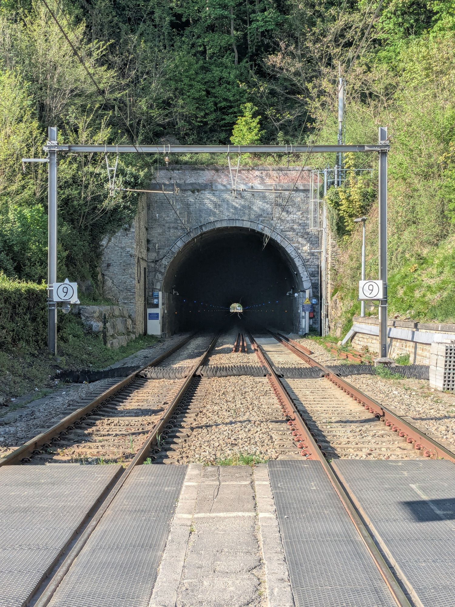 We verlaten de Jacobskerk en steken de Maas over naar het zuidelijke deel van het (schier)eiland in de rivier. Langs het kunstmuseum La Boverie en het druk bezochte park verlaten we het eiland aan de oostkant van de Maas, om direct het volgende riviertje de Ourthe te passeren. Dan komen we aan bij het station van Angleur. De ingang van het stationsgebouw is iets verstopt aan de achterkant, maar we weten het te vinden. We kopen een kaartje en begeven ons naar perron 4. De etappe van vandaag zit er op. Sporthorloges op stop, en nog even een kwartiertje wachten op de trein.