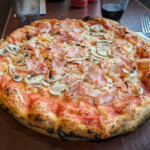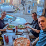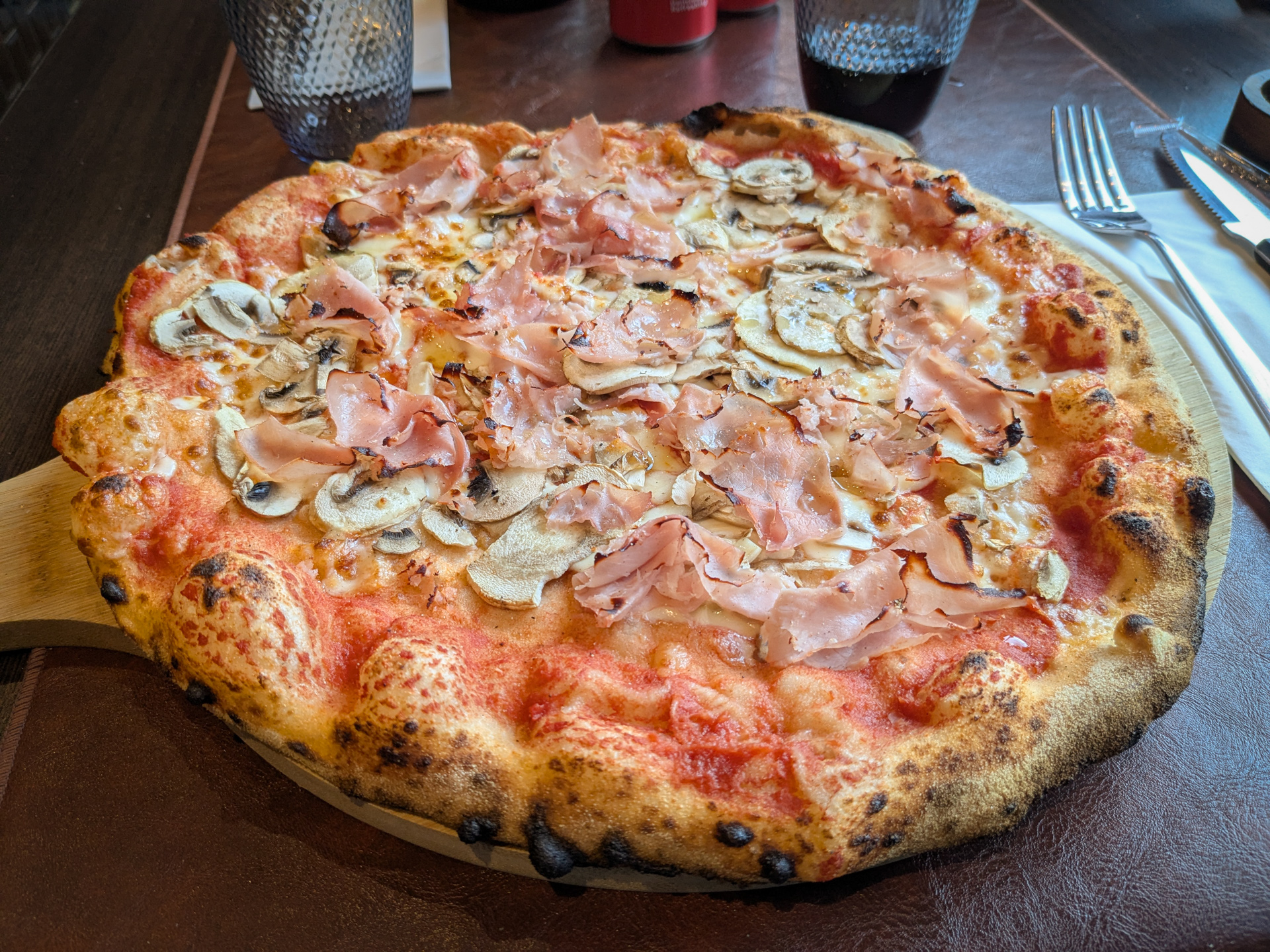 Na het douchen halen we eerst nog even een paar boodschappen bij de supermarkt om de hoek. Wat yoghurt en fruit voor het ontbijt, een drankje voor de avond. Voor het avondeten gaan we zo op zoek naar een eettentje en we belanden bij een pizzeria bij de brug. Hij smaakt prima. Dan nog een ijsje opgepikt bij de nachtwinkel er tegenover en we kunnen terug naar het huisje. We hebben genoeg gelopen vandaag. Omhoog met de beentjes.