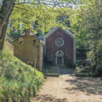 Na twee bochten komen we op een gravelweg richting Wixhou. Volgens Wikipedia een verbastering van Wit Hout, waarvan ooit iemand een Mariabeeldje zou hebben gevonden. Op die plaats is later een kerk gesticht, waar wij langs komen te lopen. De ramen en deuren zijn dichtgespijkerd met houten platen. Hier zullen we geen pelgrimsstempel kunnen halen. Via een steeds smaller en steiler dalend bospad lopen we naar het dal waar de Etangs de la Julienne liggen. Een paar grotere vijvers, waarnaast men een houten sportparcours heeft aangelegd en er is een lunchcafé.