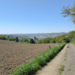 Aan de zuidkant van Visé moeten we een pad linksaf omhoog. Het is de Chemin de Richelle, die ons binnen een kilometer 75 meter hogerop laat lopen. Hier zit meer geld, want de huizen er percelen waar ze op staan worden groter en zijn netter onderhouden dan wat we van België gewend zijn. Het valt ons op dat er ook best veel gebouwd wordt. Hier op hoogte heb je zo nu en dan een mooi overzicht over het Maasdal waar de snelweg richting Luik kronkelt.