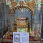 Aan de overkant van het gebouw staat een tafeltje waaraan een ingetogen gastheer en -vrouw ons verwelkomen. De mevrouw hoort dat we uit Nederland komen, en ze antwoord in goed verstaanbaar Nederlands dat we uiteraard een stempel krijgen. Maar we moeten ook zeker even een kijkje nemen bij de Jacobs-relikwie verderop in de kerk. We krijgen een korte rondleiding waarin ze de beelden aan het plafond toelicht en levert ons daarna af bij het vergulde altaar van de Jacobs-relikwie. Het stuk armbot zou al in het jaar 1056 meegenomen zijn na een bedevaart vanuit Santiago de Compostella.