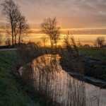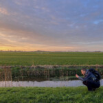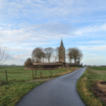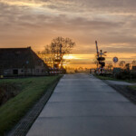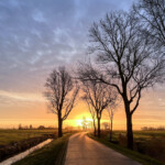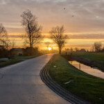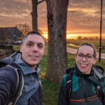 Vandaag is het dan echt tijd voor de allerlaatste etappes op het Jabikspaad. We parkeren naast de kerk in Jorwert en lopen het dorp uit. Het is nog vroeg en wat schemerig, dus zoeken een geschikt plekje voor onze startfoto, die we vinden bij een boom aan de rand van het dorp. De zon komt namelijk nu net op, en met de boom achter ons levert dat een mooi plaatje op.