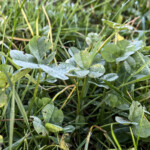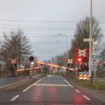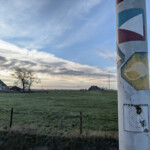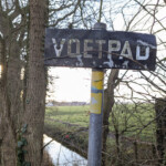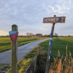 Net buiten Jorwert passeren we het spoortraject tussen Leeuwarden en Sneek. De opkomende zon maakt er een mooi schouwspel van. Via Hoxwier slaan we een boeren oprijlaan op en lopen dan richting Mantgum. Rondom de boerderij is het erg drassig. Het pad wordt smaller en loopt uiteindelijk verder als pad van smalle betontegels dwars door de rijkelijk volgescheten weilanden. We komen aan in Mantgum en verderop zou een stempelpost moeten zitten. Baudien herkent het hier, want ze heeft eerder al eens een stempel voor het Oduphuspad moeten halen bij B&B Lyts Kanaän. In een soort woonkamer in een kas verderop het erf vinden we een blik met stempels. Check, die is binnen!